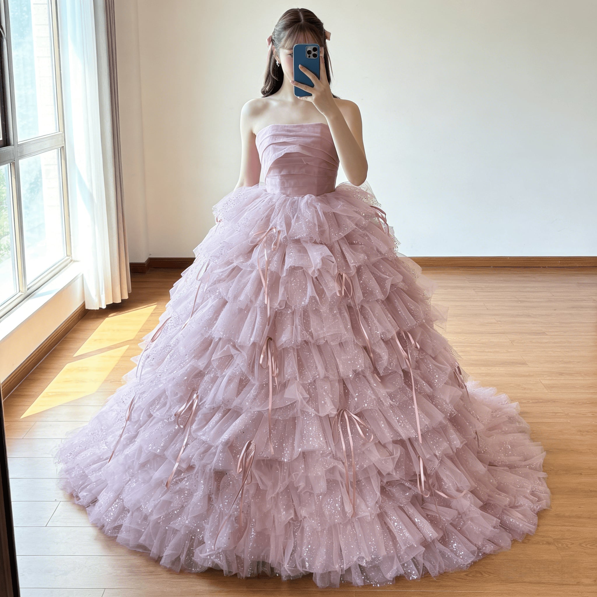 豪華!カラードレス チェリーピンク ベアトップ キラキラ 柔らかく重ねたチュールスカート リボン ミニトレーン 花嫁