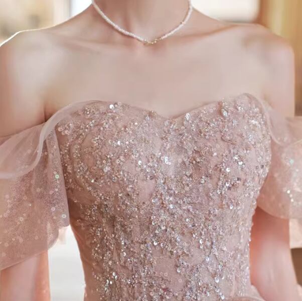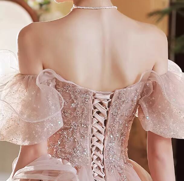 カラードレス シャンパン色 ベアトップ フリル袖 ラッフルフリル キラキラスパンコール 繊細レース 音楽会/発表会