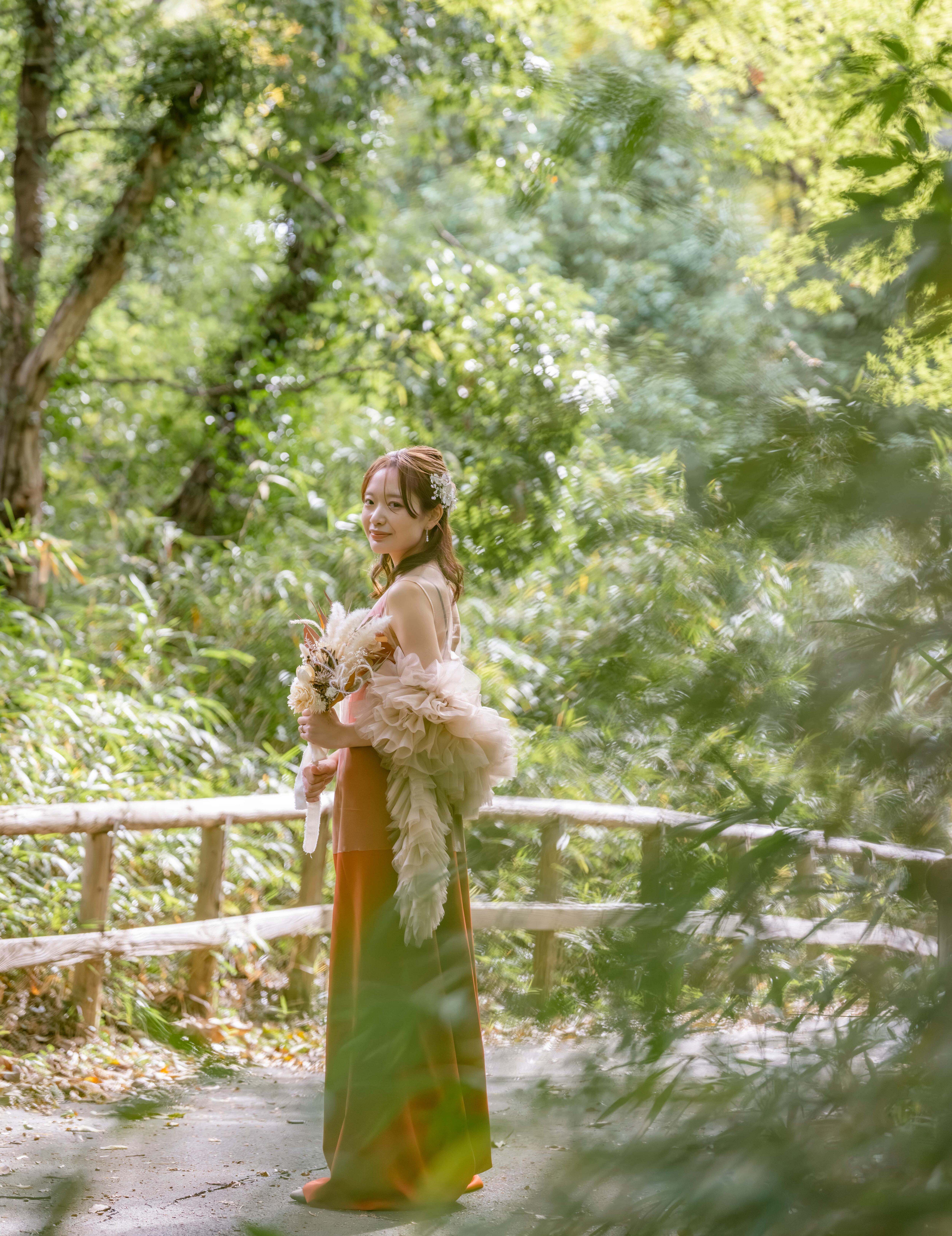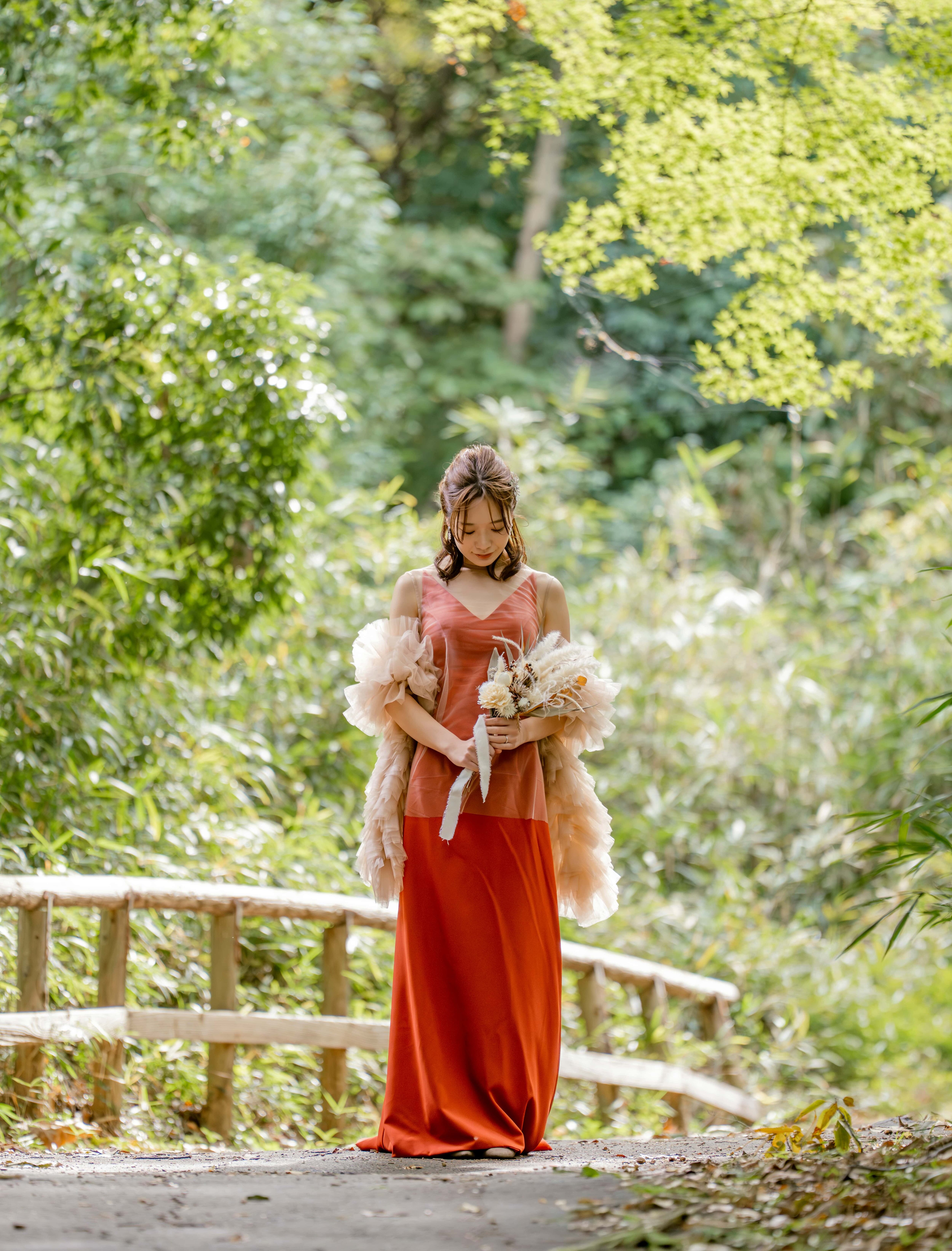 実例写真!カラードレス Vネック ツーピース テラコッタ色 トップス+キャミソール ラッフルフリル 前撮り 大人っぽい