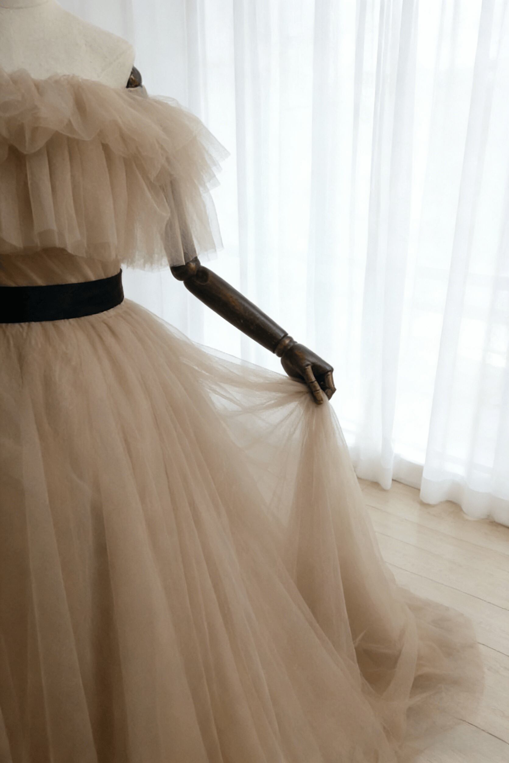 実例写真!カラードレス シャンパン色 オフショルダー チュールスカート サッシュベルト 前撮り 花嫁