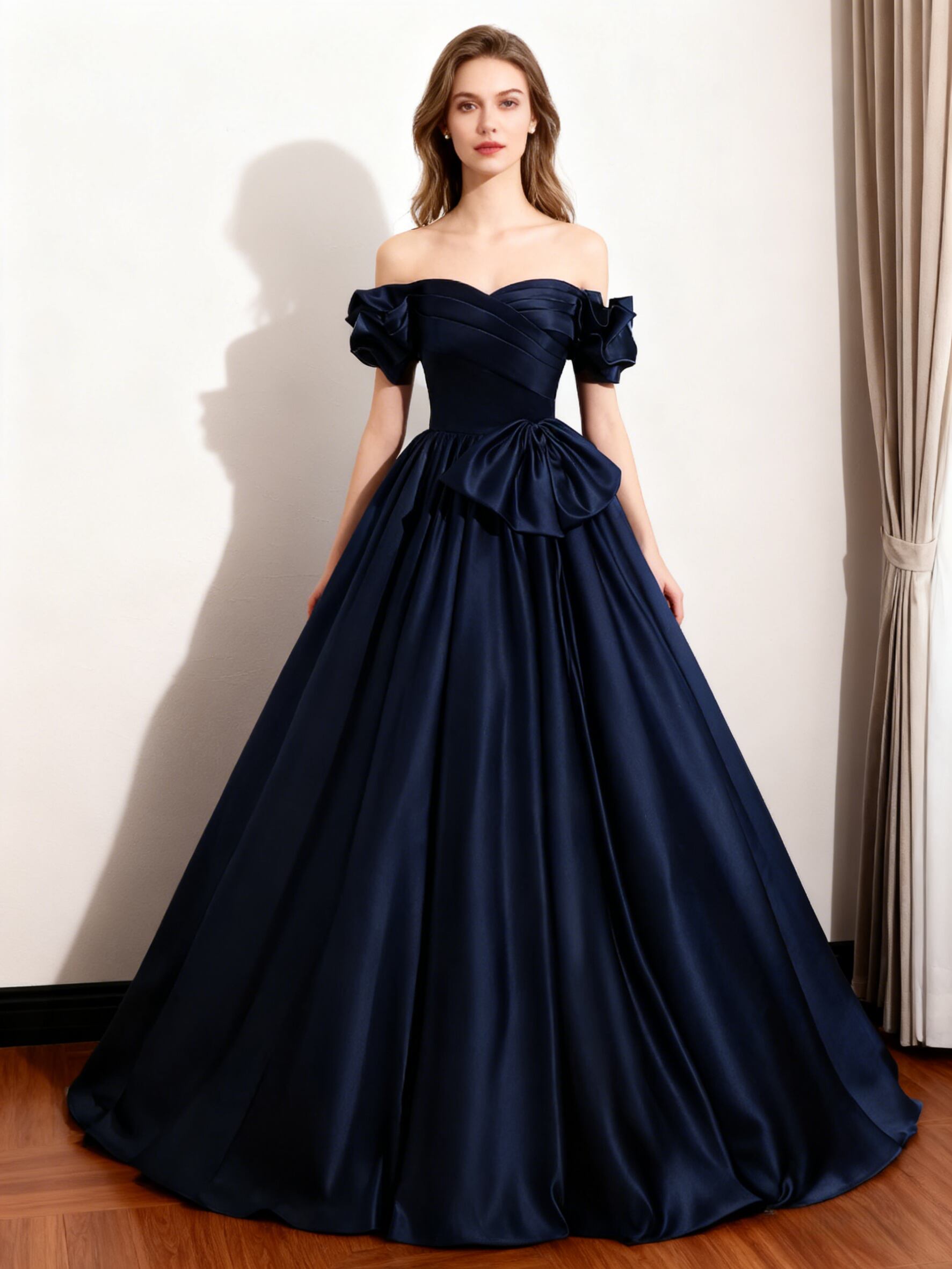 カラードレス ネイビー オフショルダー フリル袖 光沢サテン フレアスカート 音楽会 編み上げ
