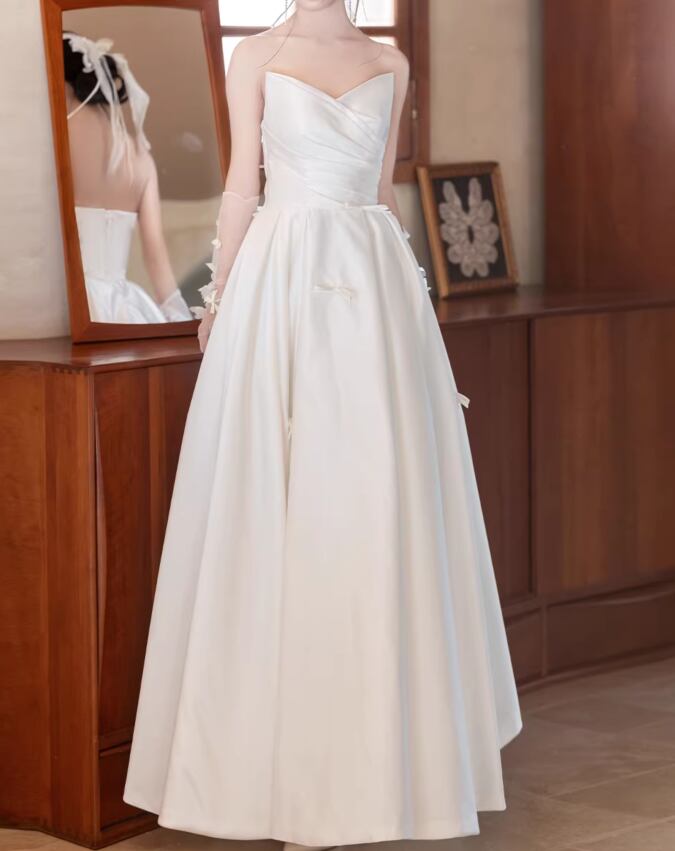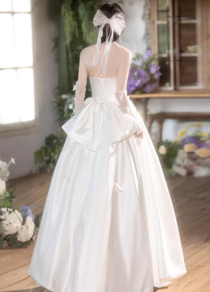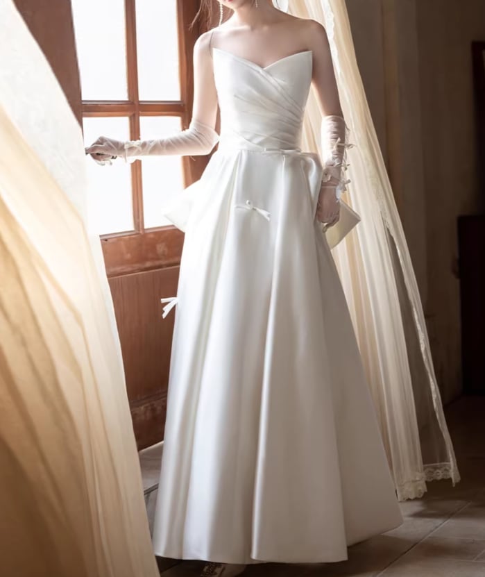 ウェディングドレス Vネック 優雅なシルエット 豪華なバックリボン 揺らめく裾 編み上げ 光沢サテン 結婚式