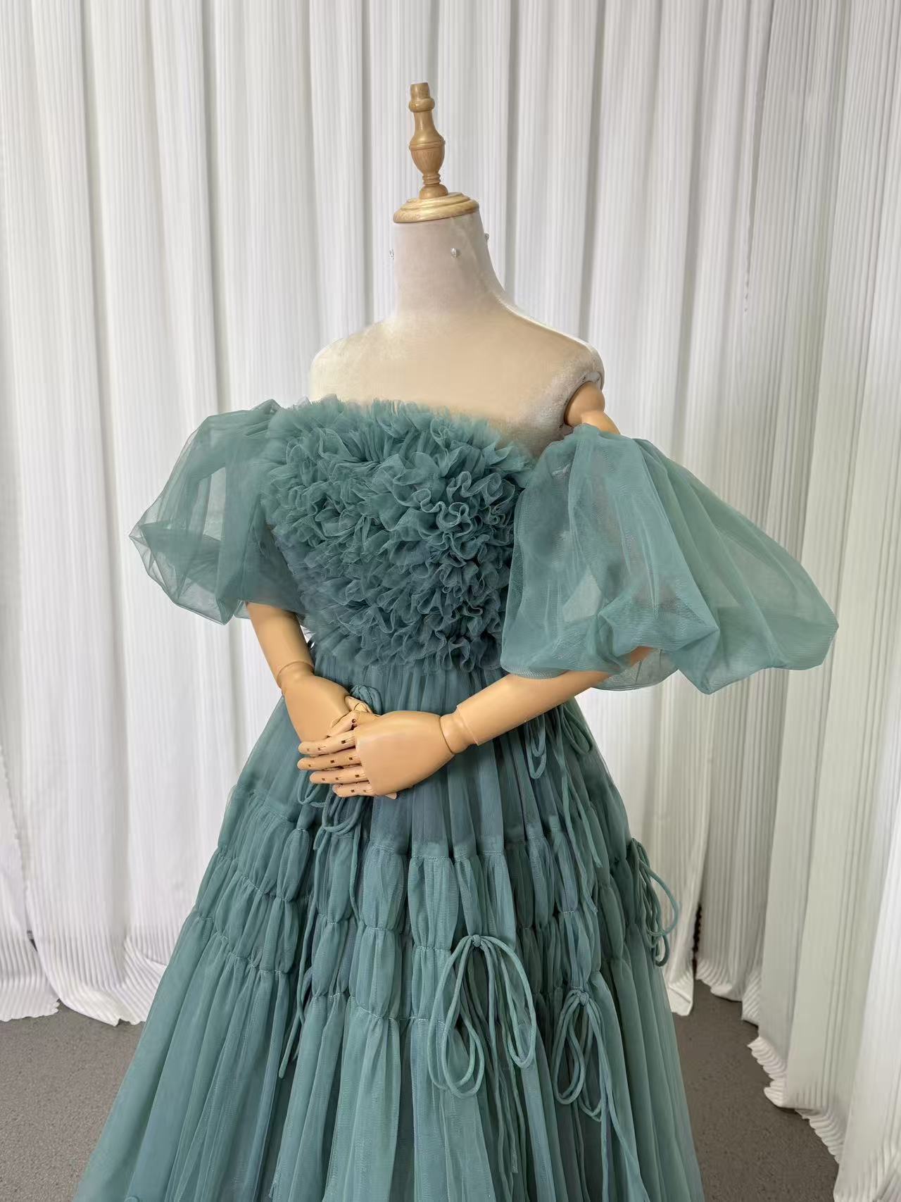 パーティードレス ミントグリーン ベアトップ シースルー袖 ラッフルフリル デザイン感 リボン 編み上げ 前撮り