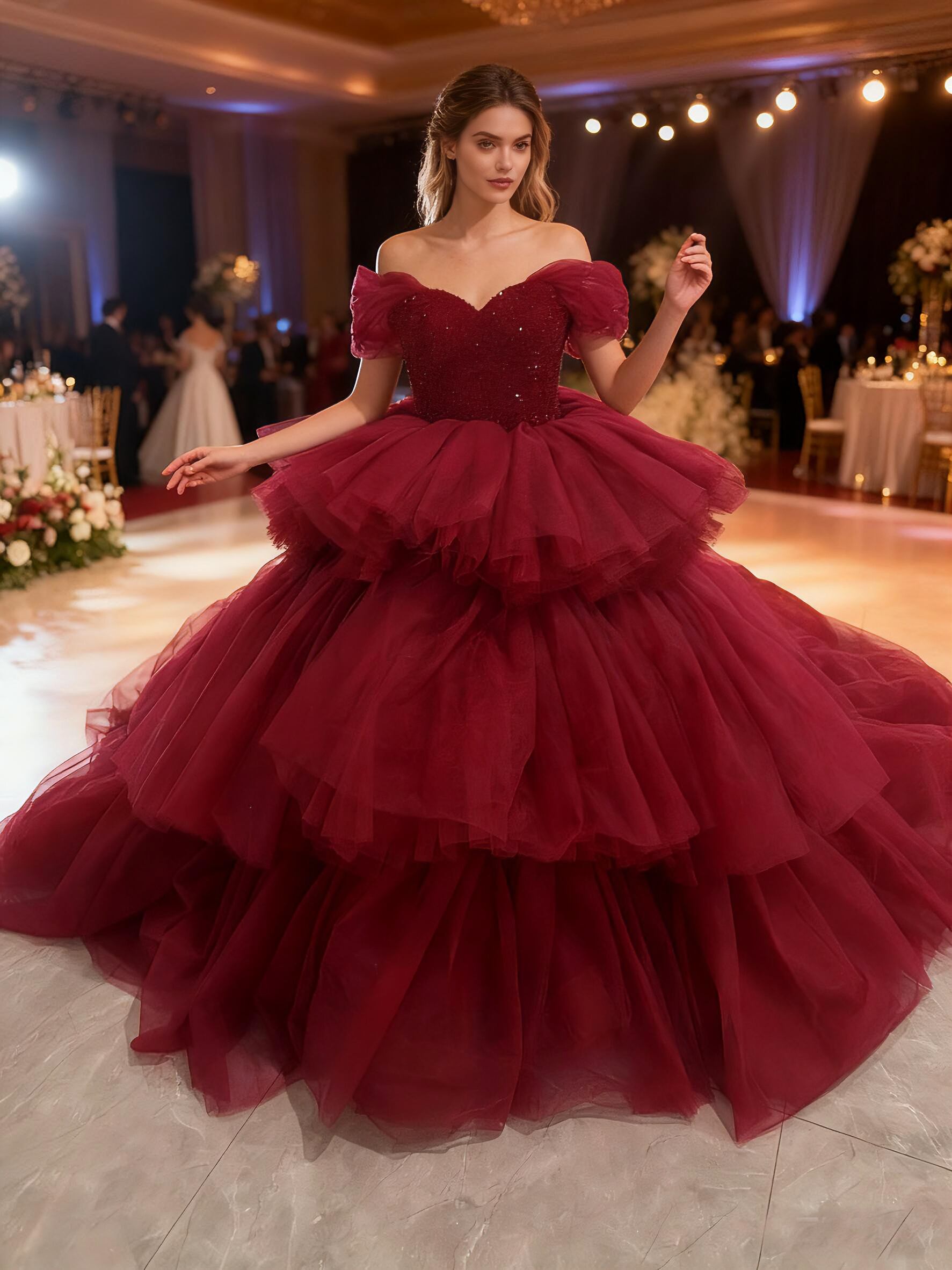 実例写真!カラードレス ビビッドピンク 花嫁 オフショルダー ビジュー ボリュームドレス 大人っぽい