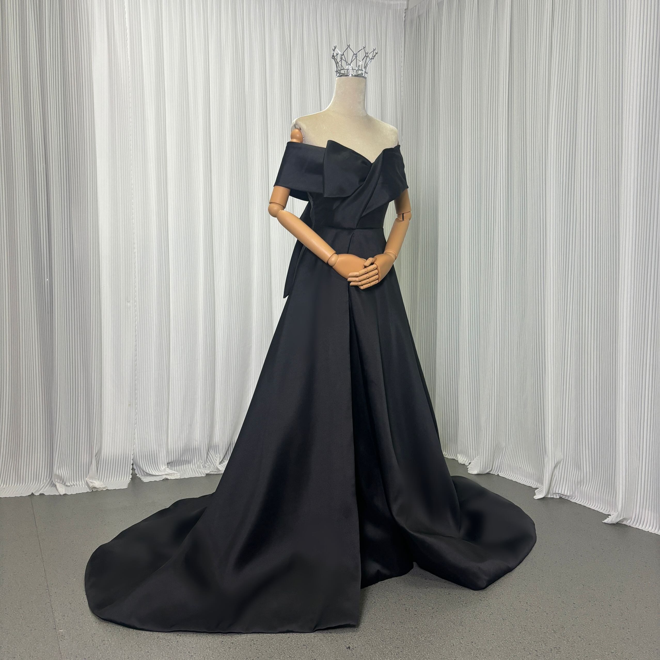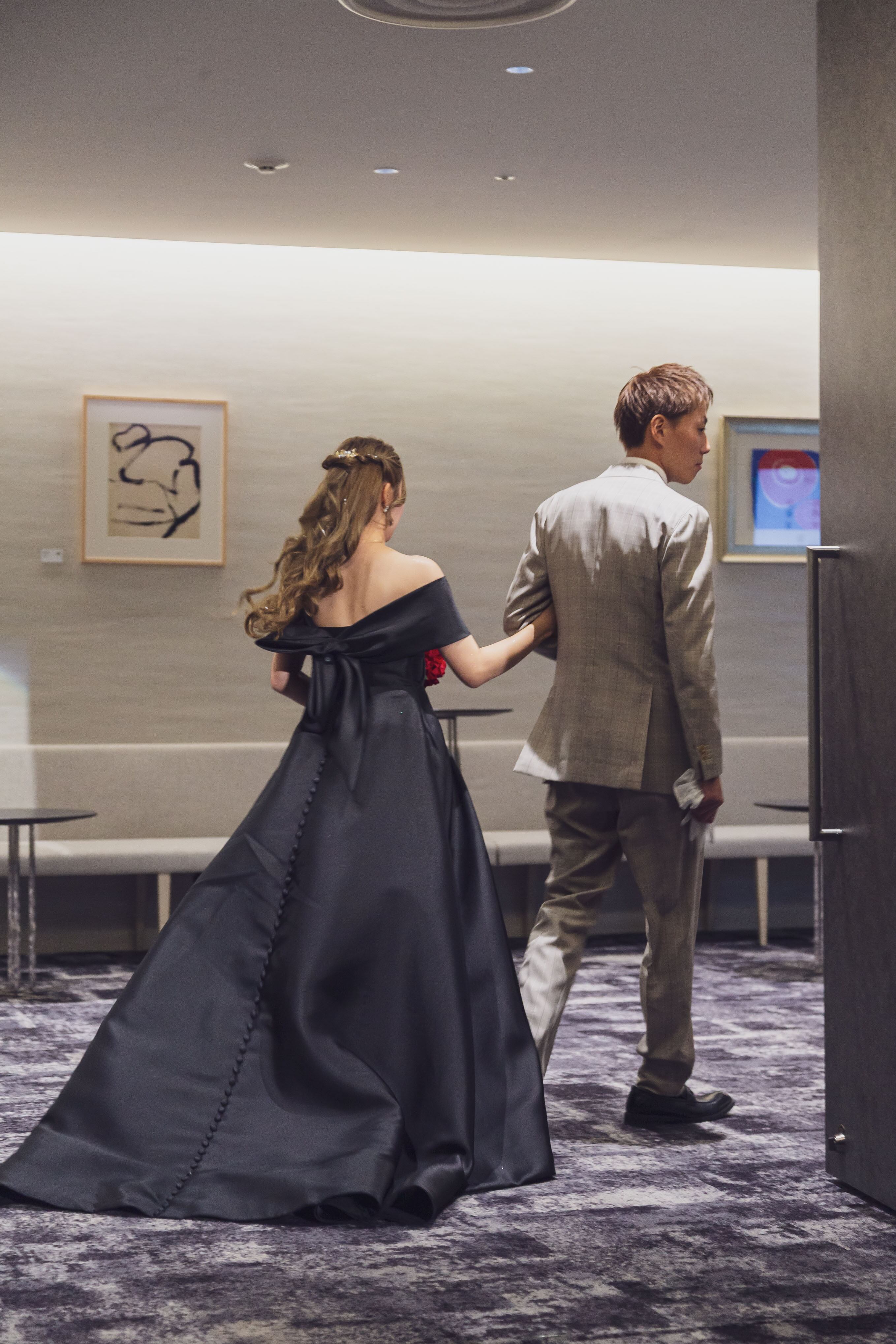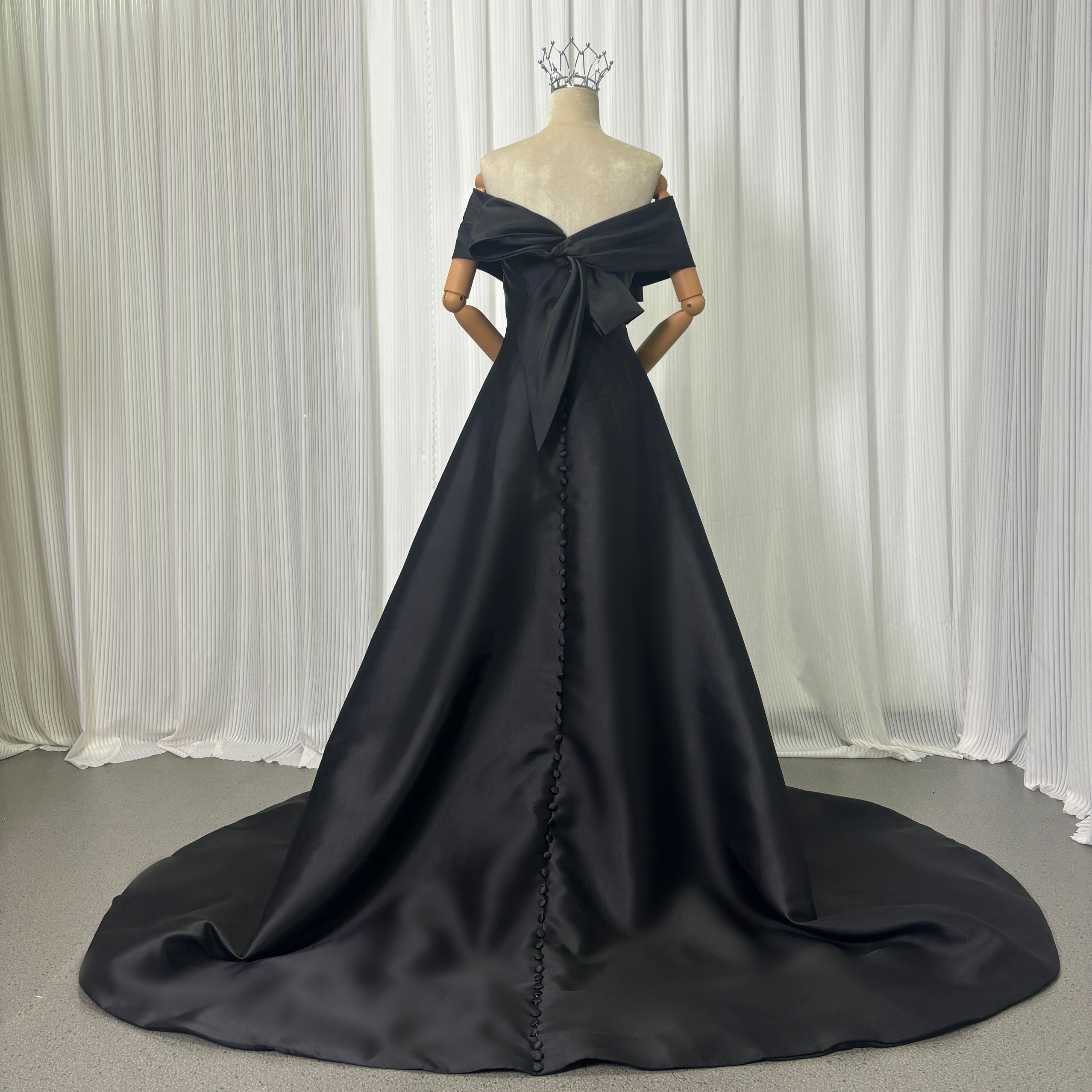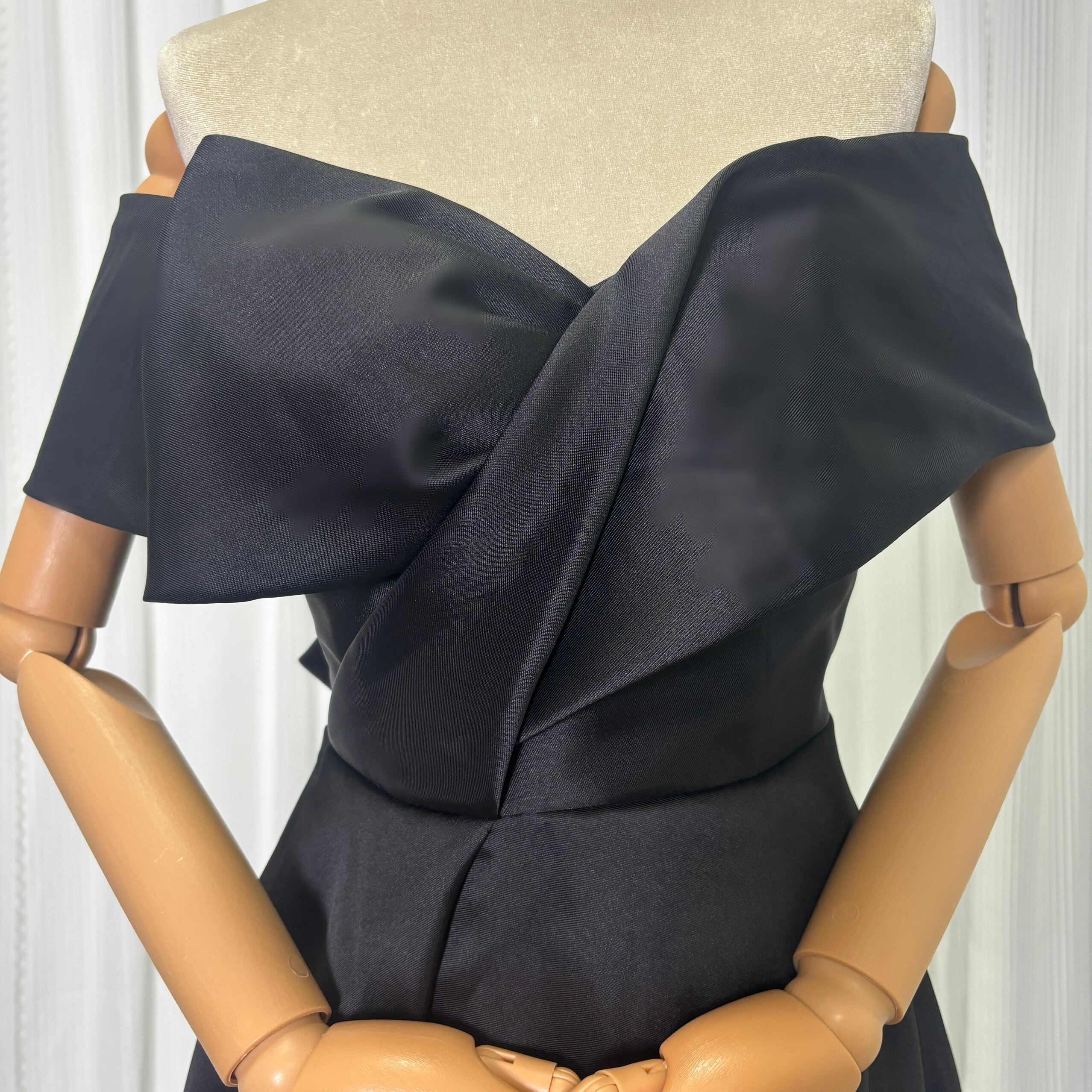 実例写真!パーティードレス ブラック オフショルダー くるみボタン ハンドドレープ 披露宴 前撮り