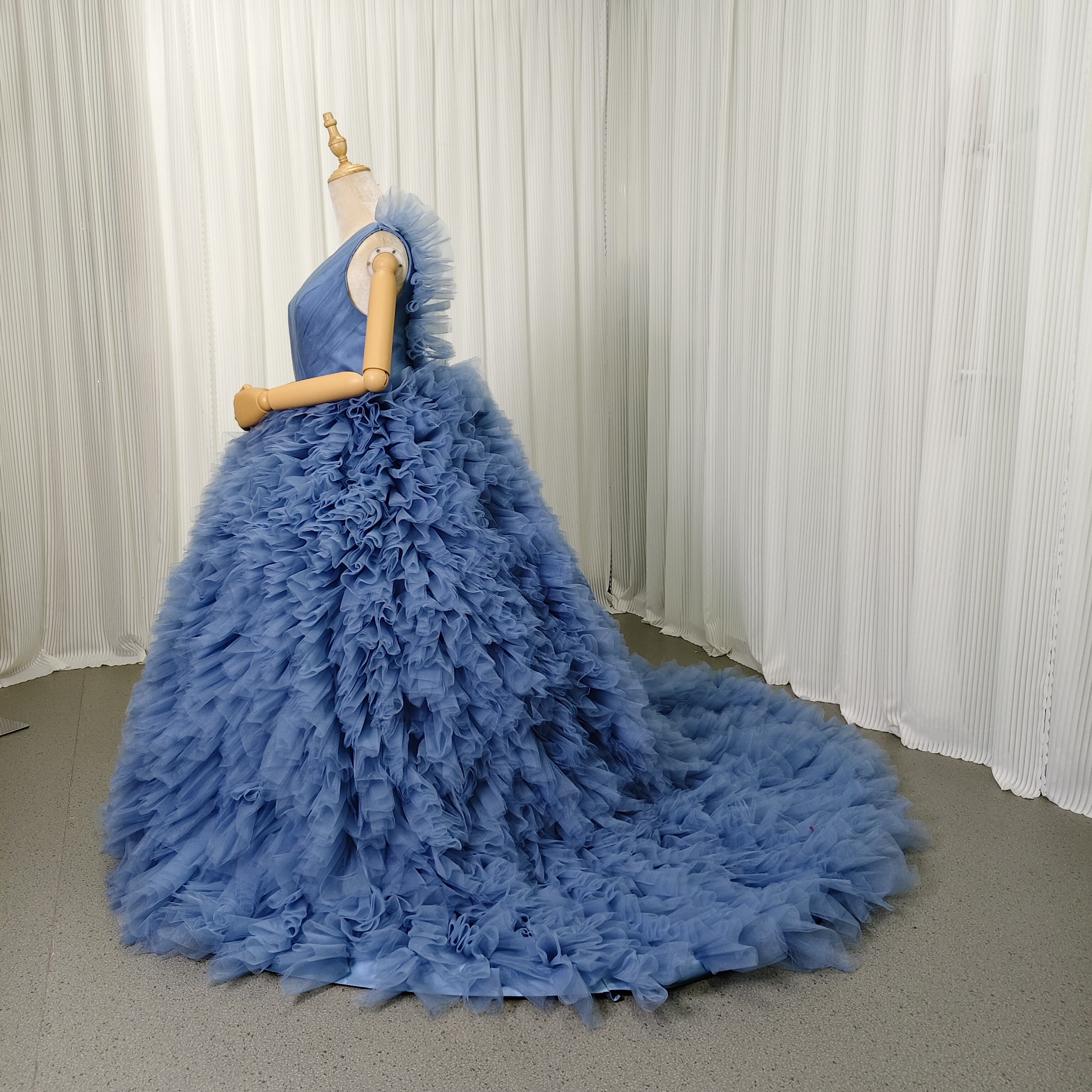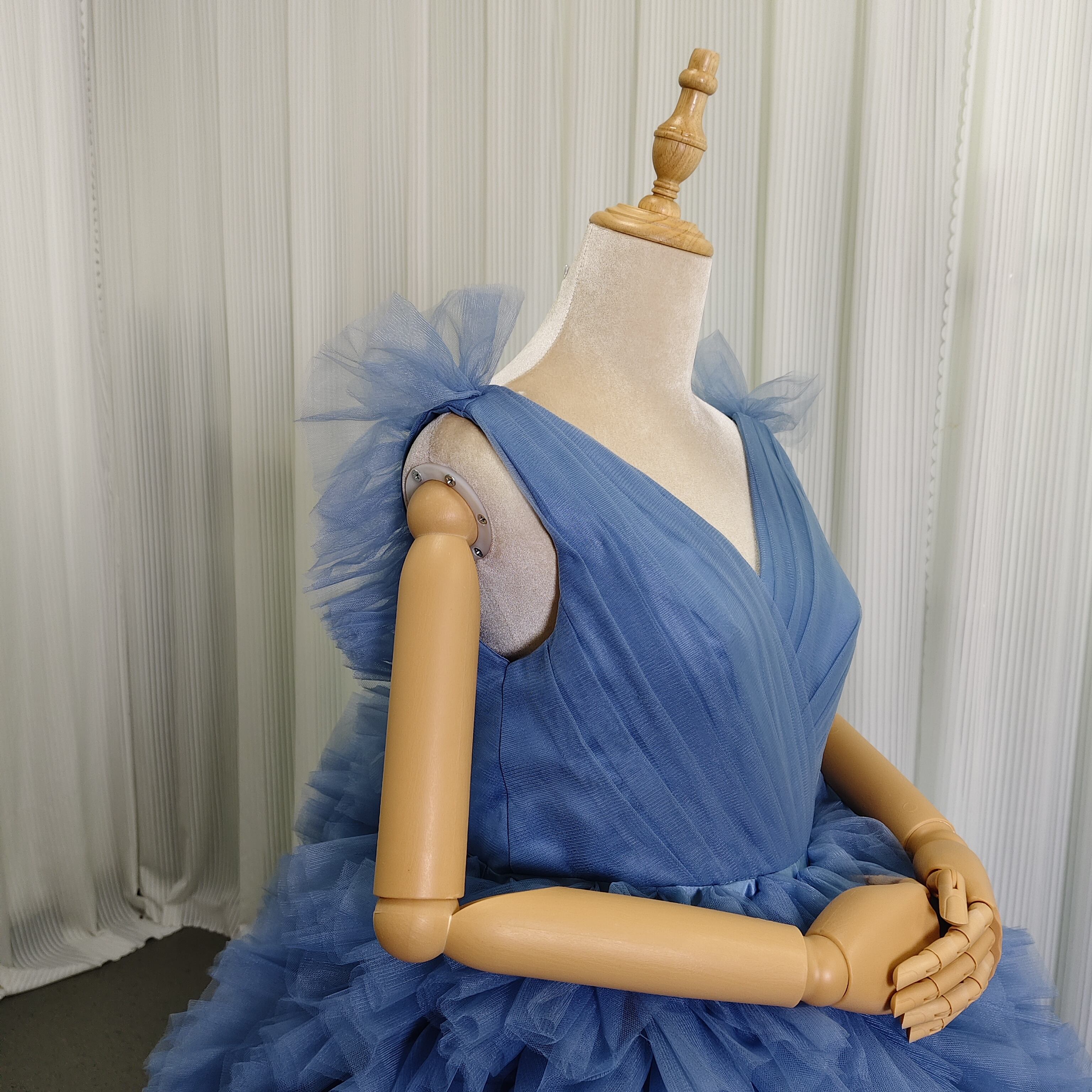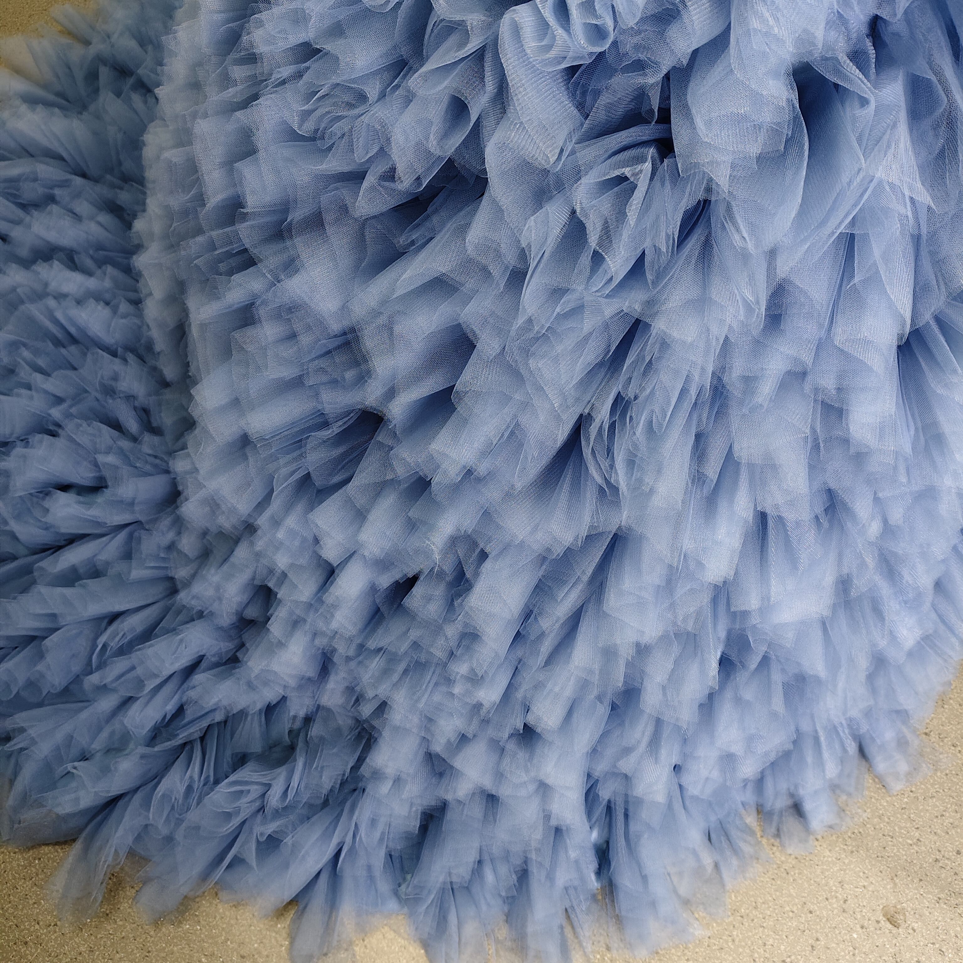 フランス風 カラードレス ブルー Vネック 背中見せ もこもこドレス 柔らかく重ねたチュールスカート 前撮り
