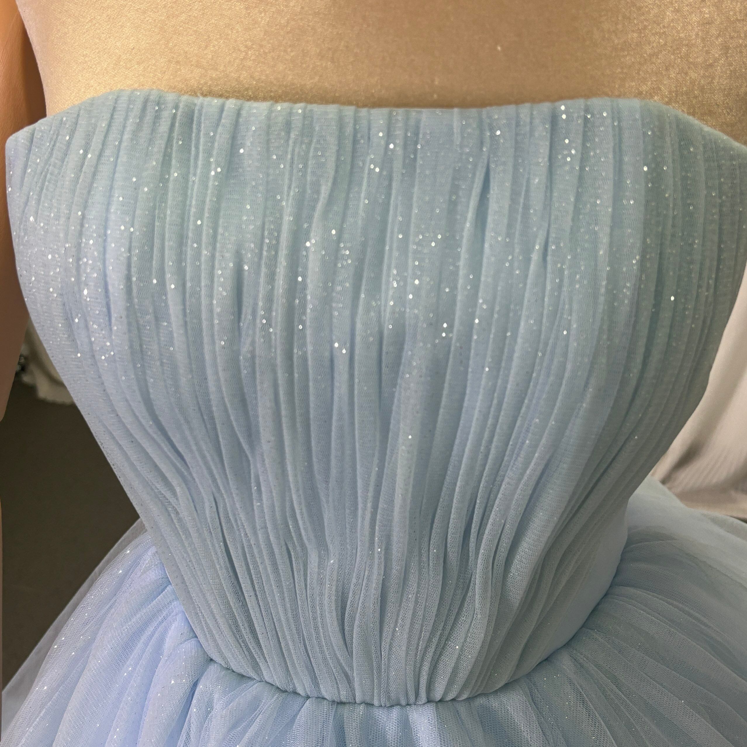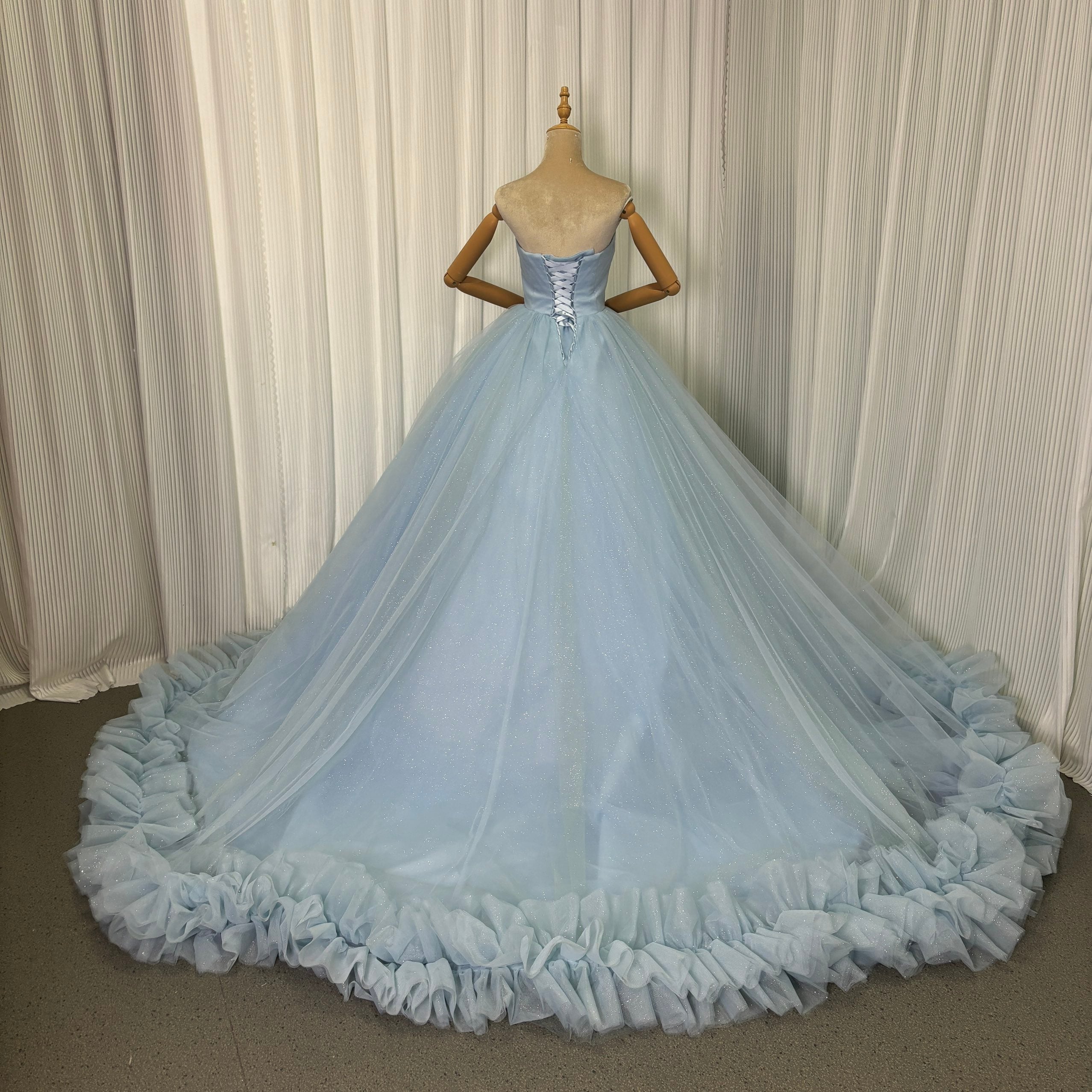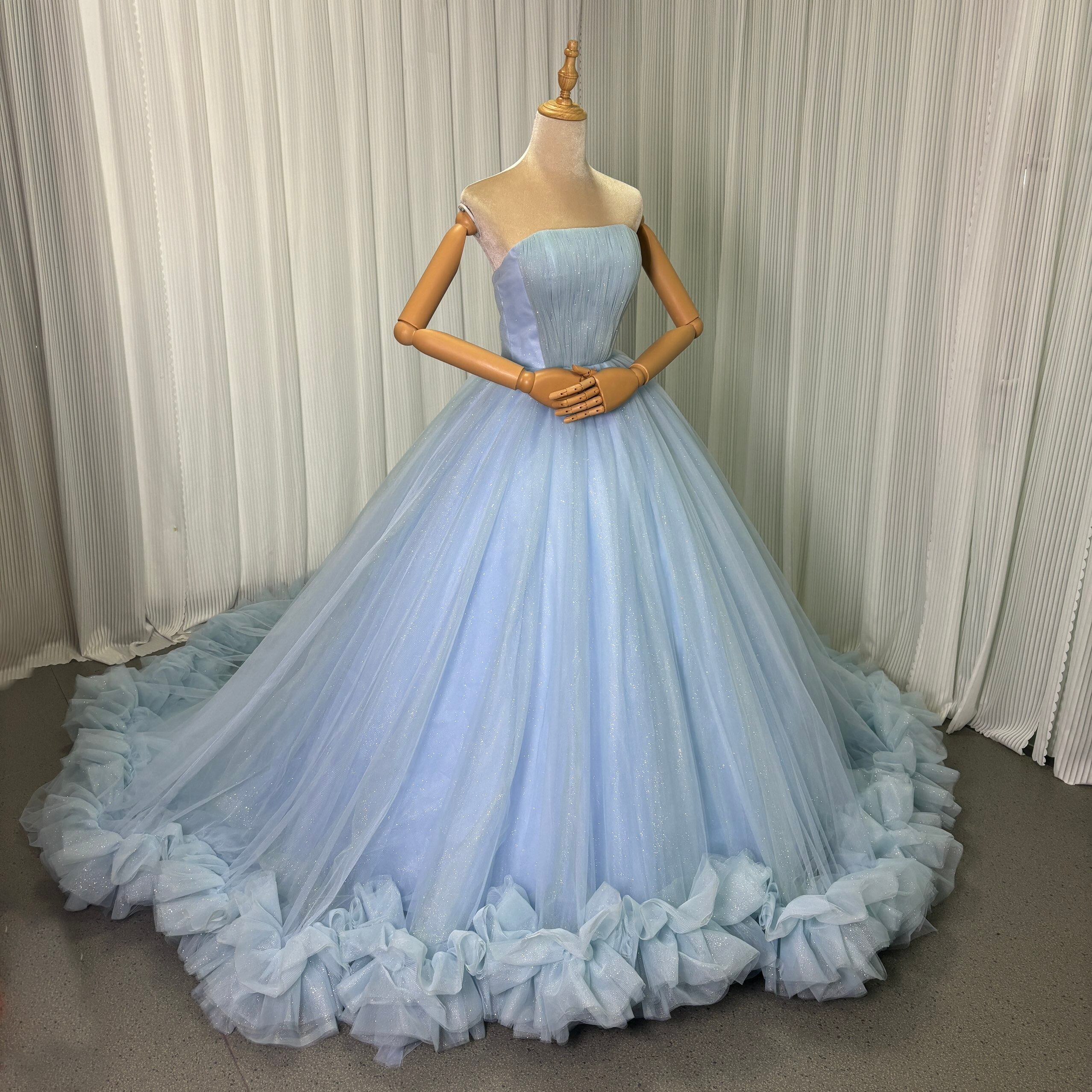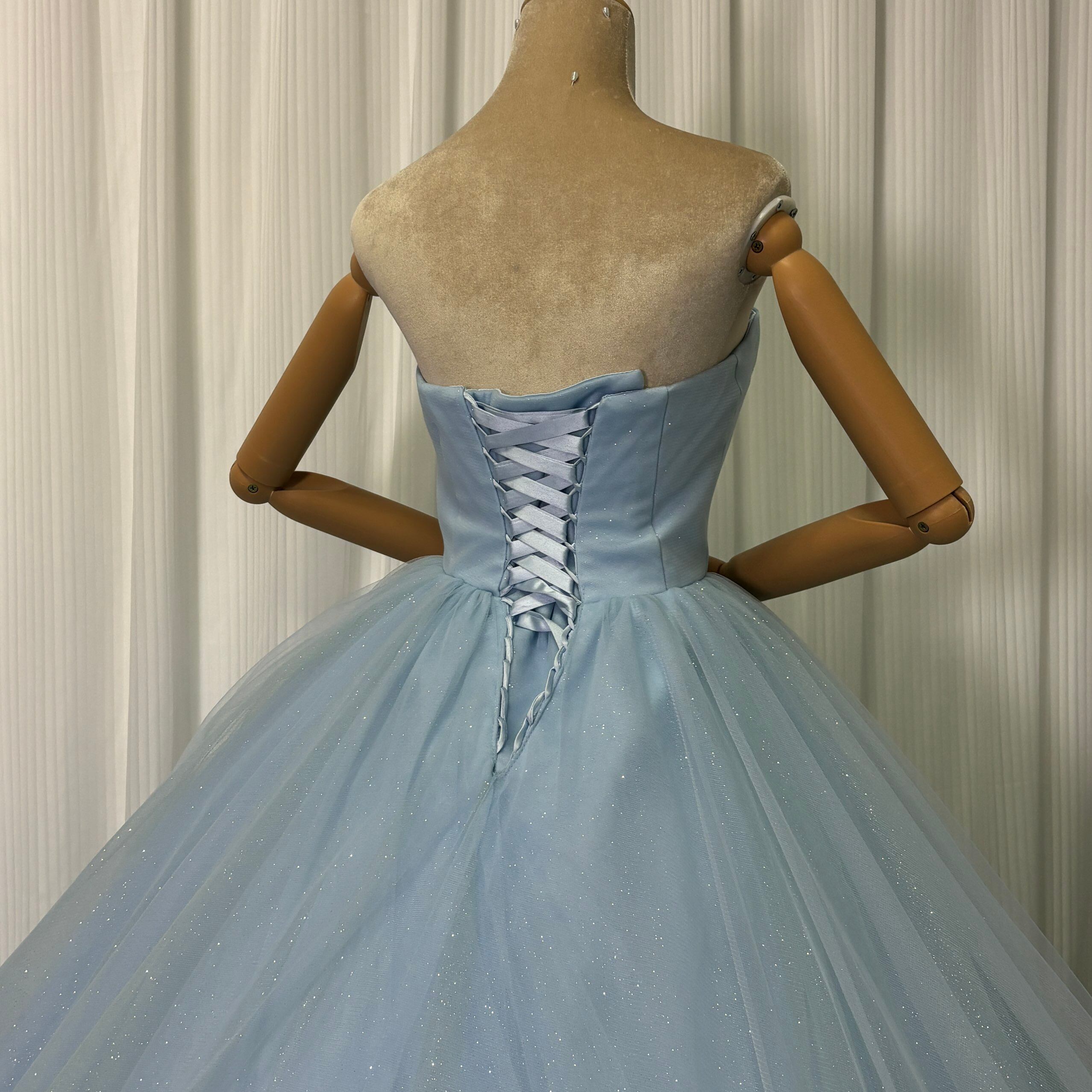 カラードレス ブルー ベアトップ キラキラチュール フレアスカート 華やかなトレーン 編み上げ 披露宴