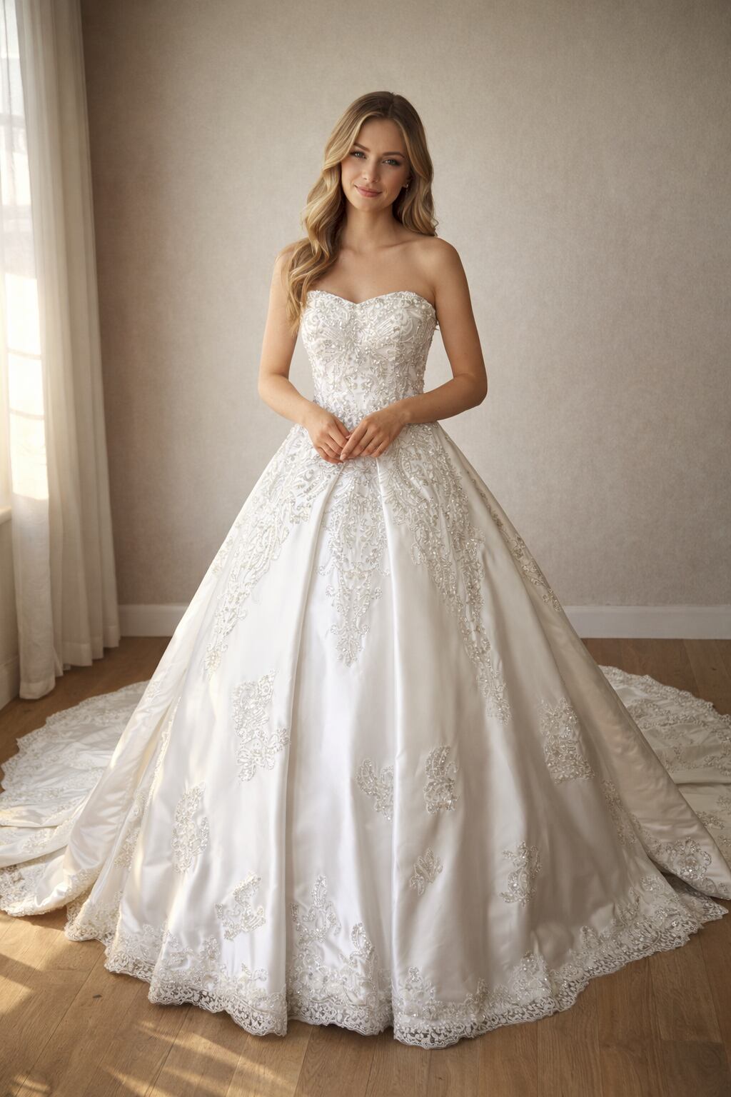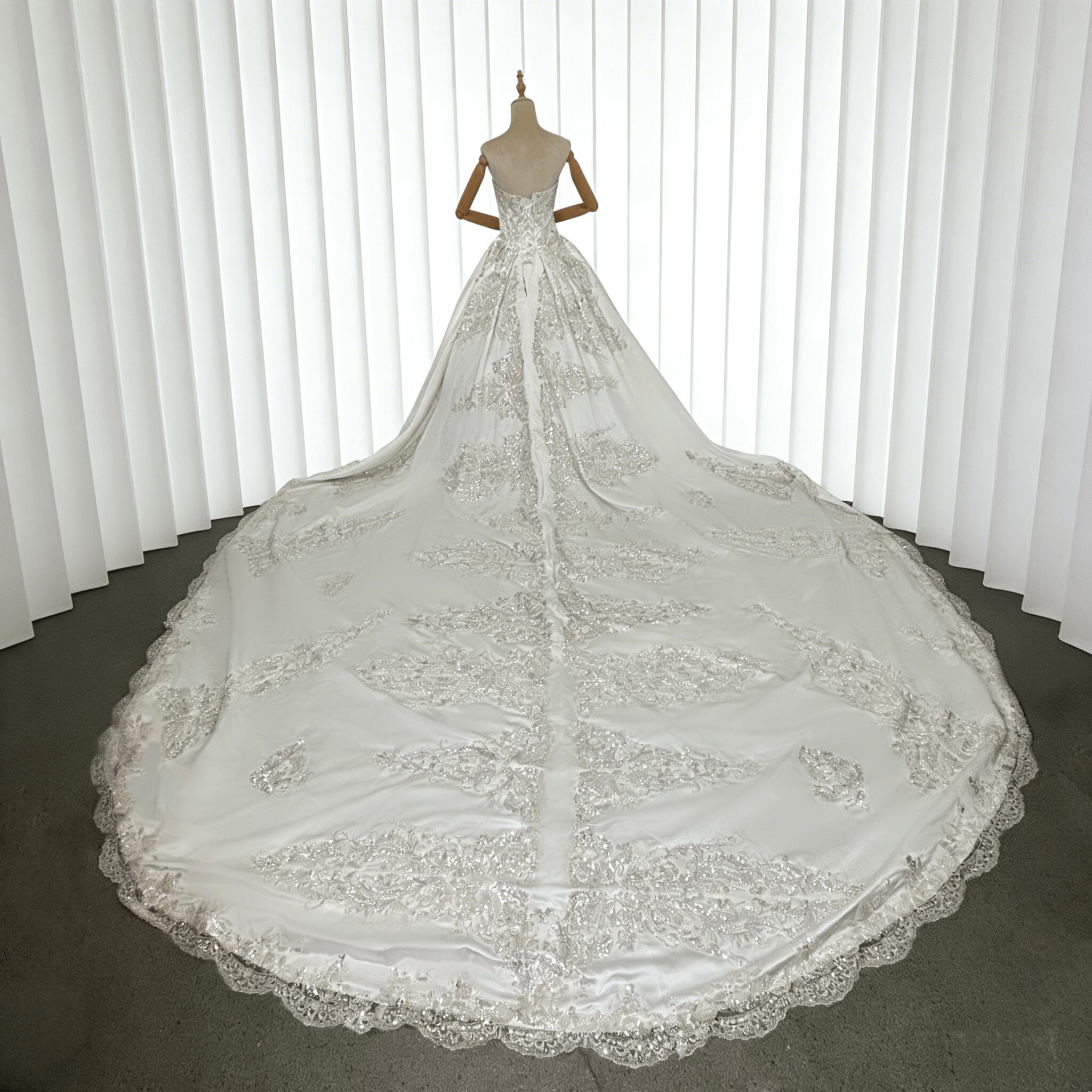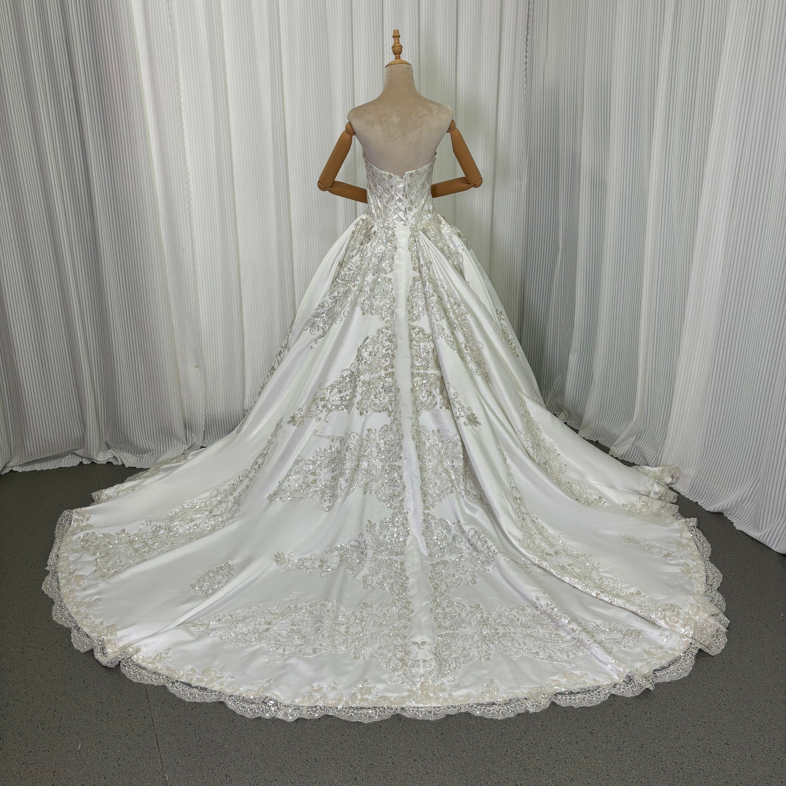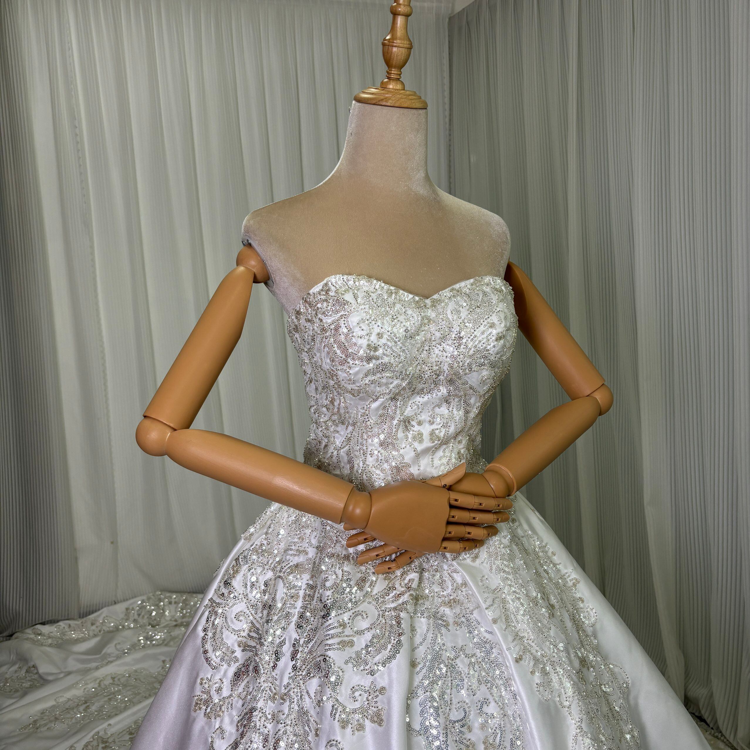 豪華!ウェディングドレス 韓国風ドレス ベアトップ キラキラ光る刺繍 拳式 華やかなトレーン デザイン感 編み上げ