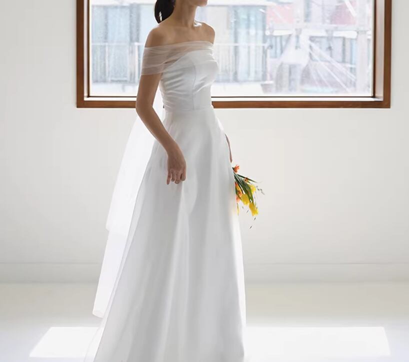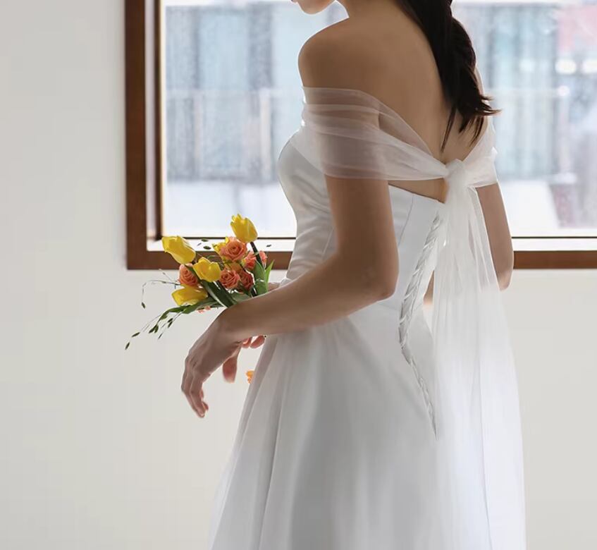 ウェディングドレス 取り外しオフショルダー ふわふわドレス 揺らめく裾 2次会/合コン エレガント