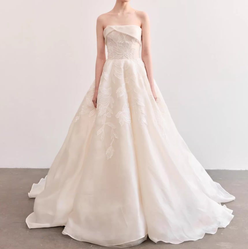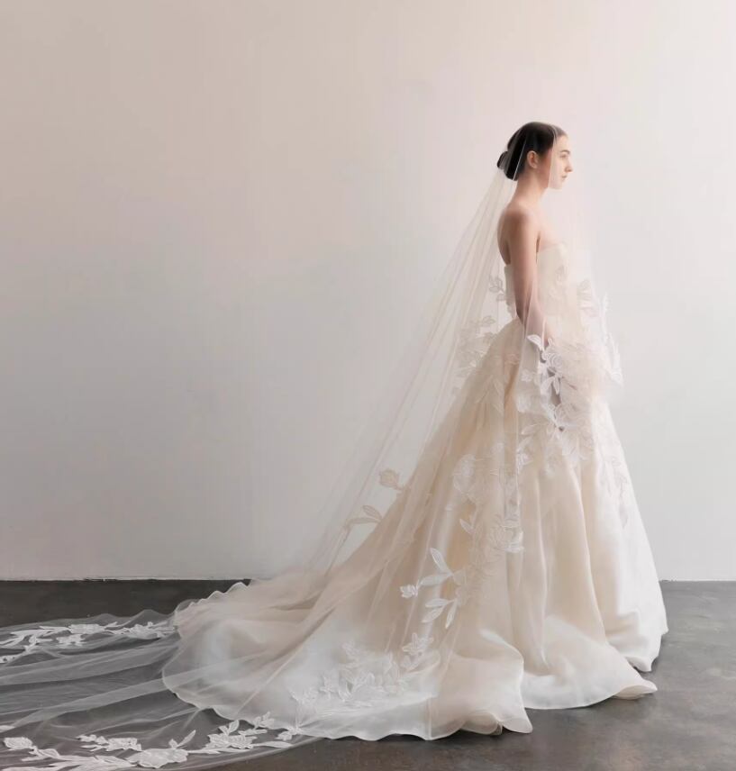 フランス風 ウェディングドレス ベアトップ 美しい花レース 大人っぽい ロングトレーン 結婚式