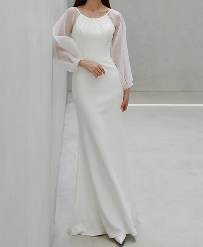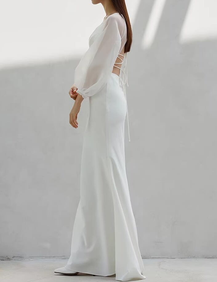 ウェディングドレス シースルー袖 マーメイドライン 背中見せ デザイン感 大人っぽい 披露宴