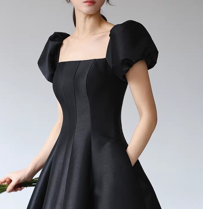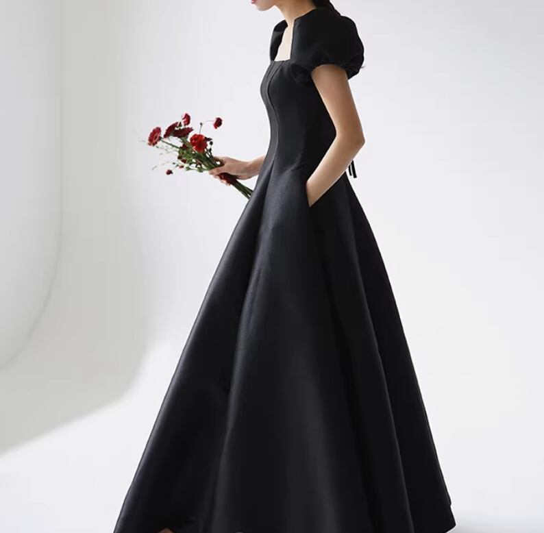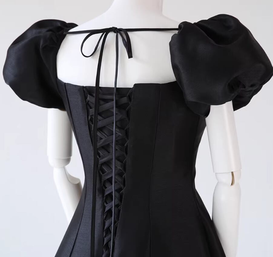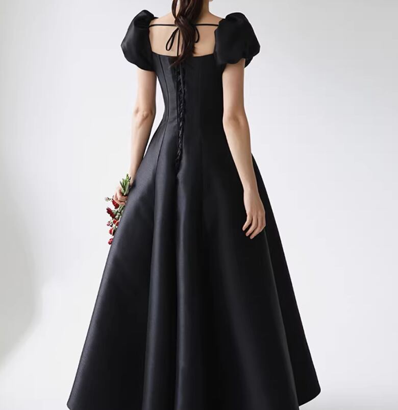 パーティードレス ブラック スクエアネック パフスリーブ ロング 編み上げ Aライン 演奏会/音楽会