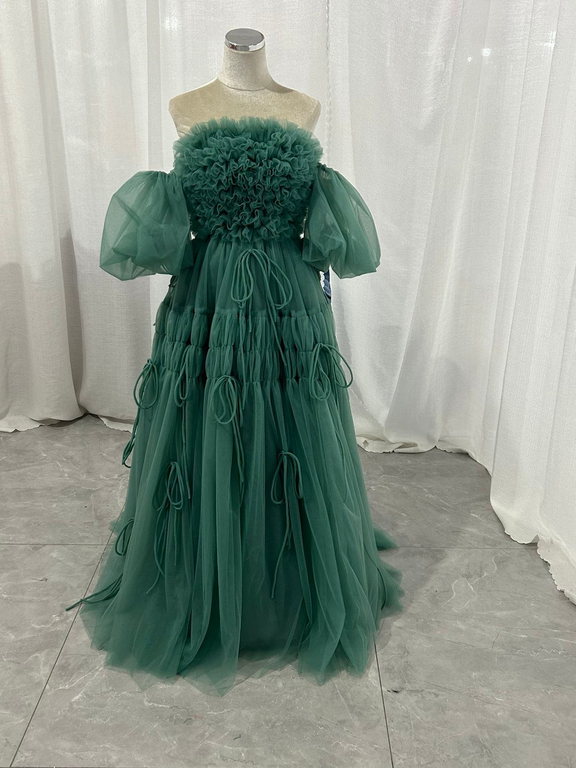 人気上昇!パーティードレス ミントグリーン ベアトップ ふわふわ袖 ラッフルフリル ロング デザイン感 リボン 前撮り