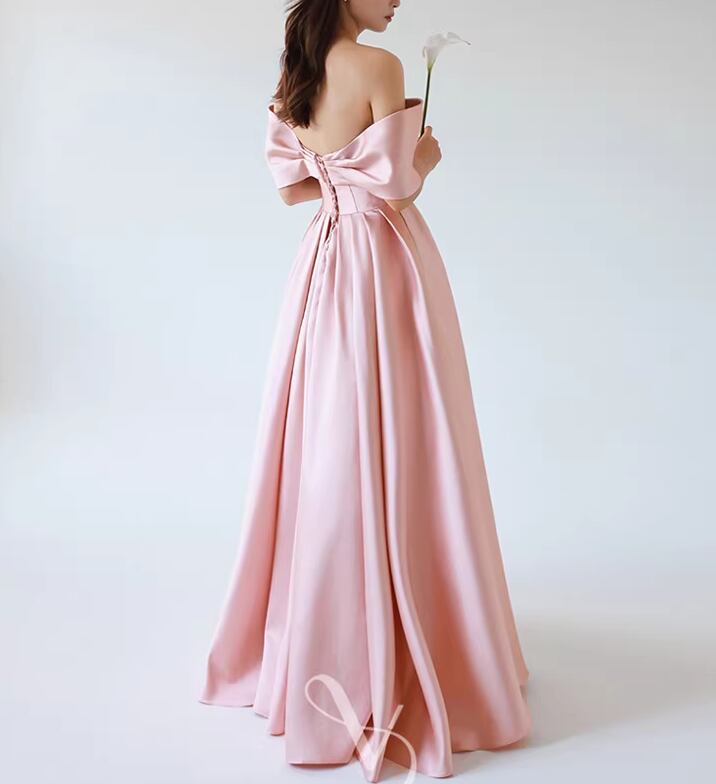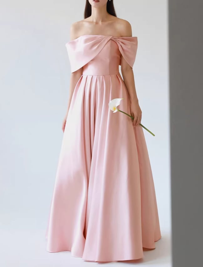 カラードレス ピンク 光沢サテン オフショルダー ハンドドレープ ロング 揺らめく裾 披露宴