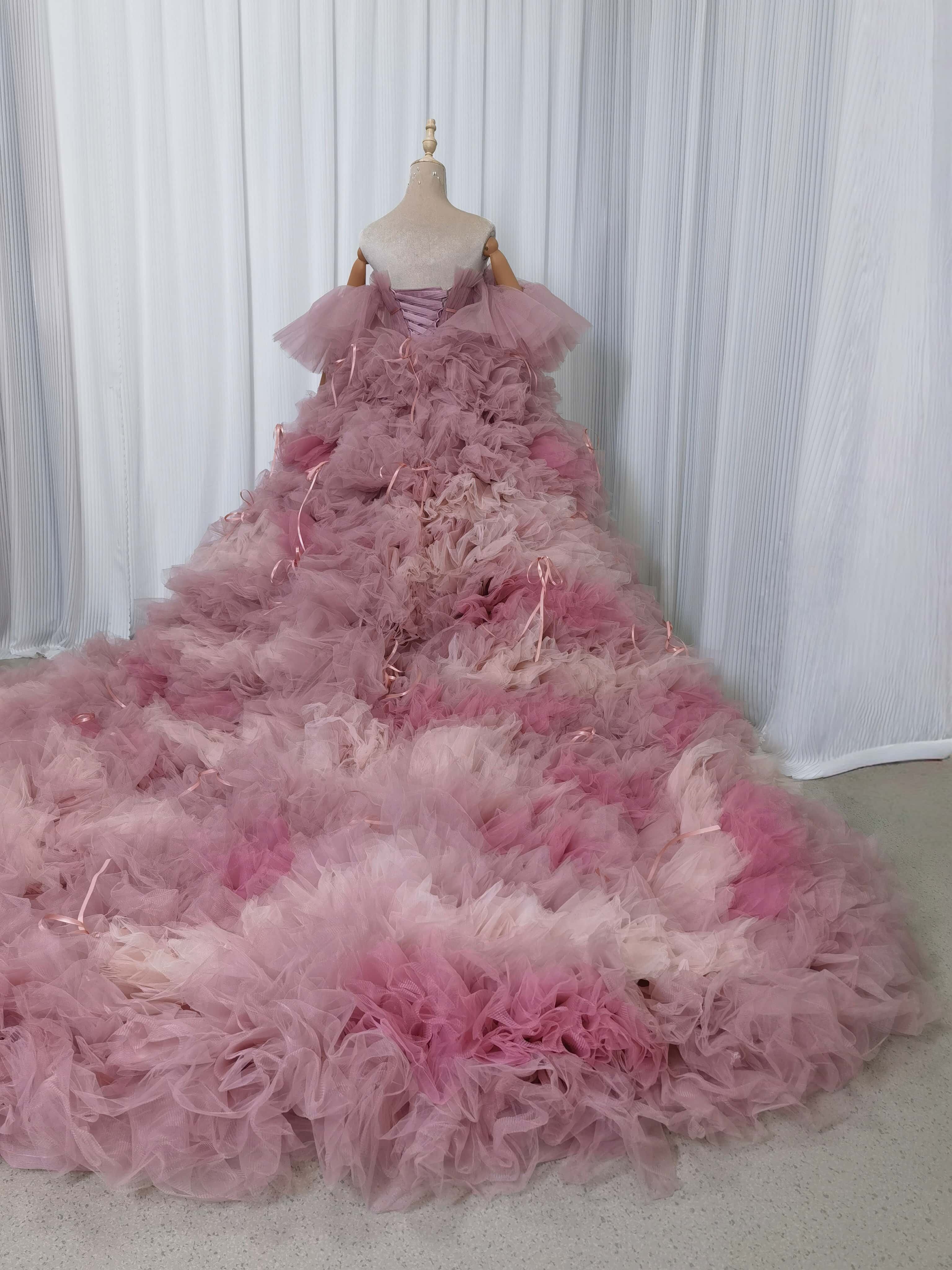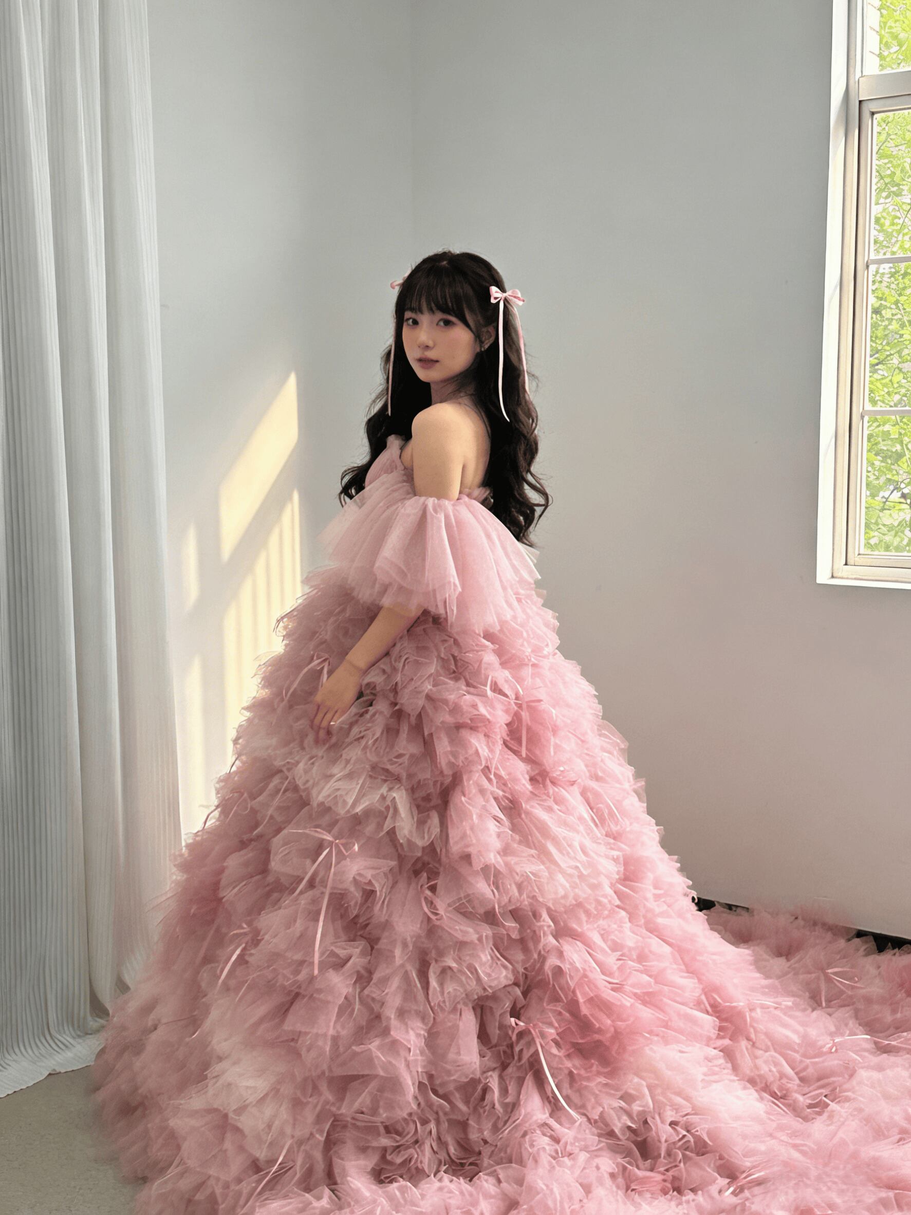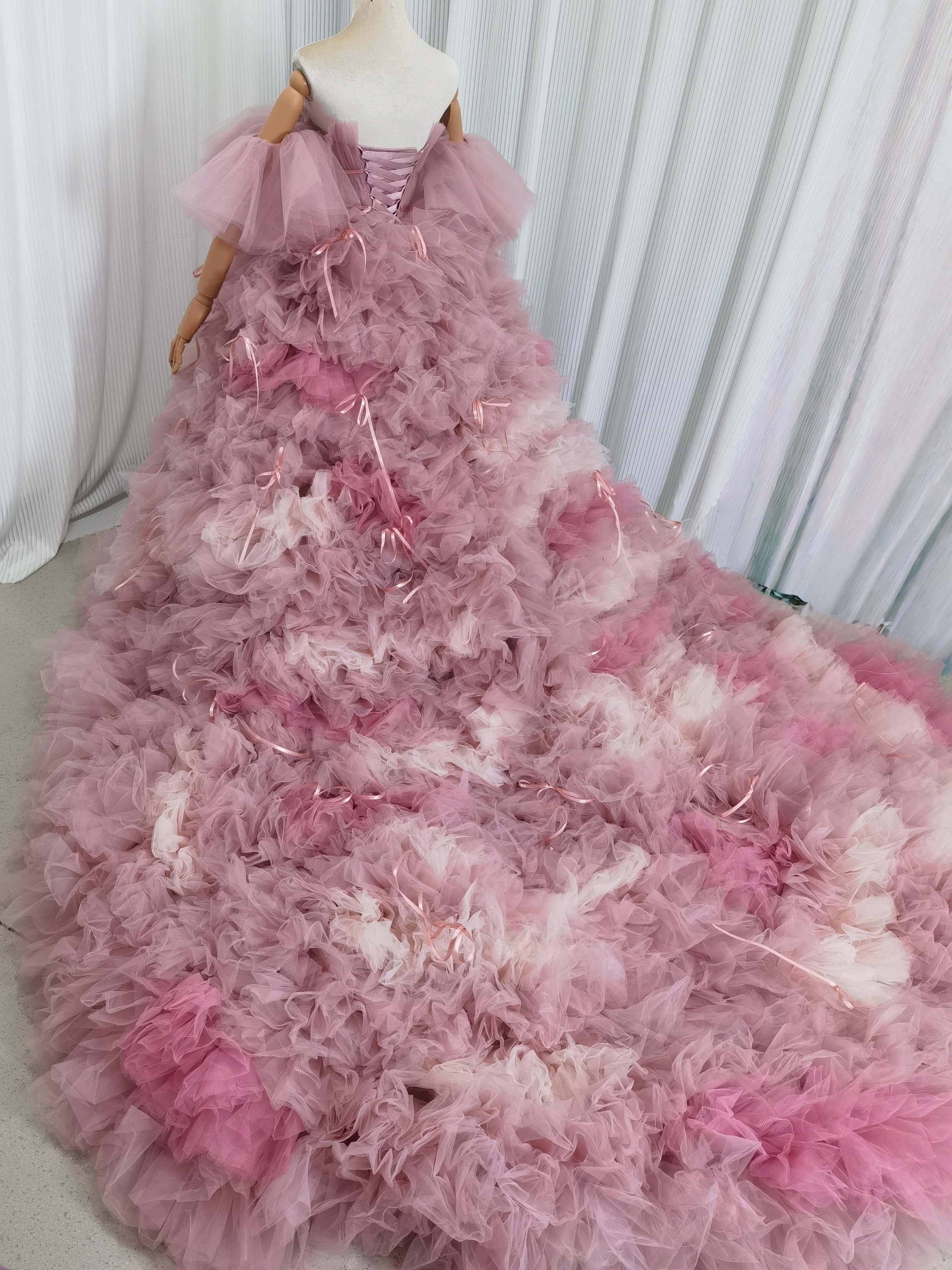 豪華!カラードレス ピンク グラデーション ふわふわ袖 ボリュームドレス ロングトレーン 花嫁 前撮り