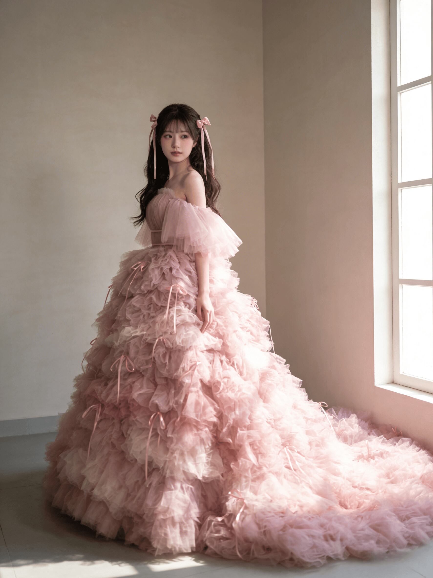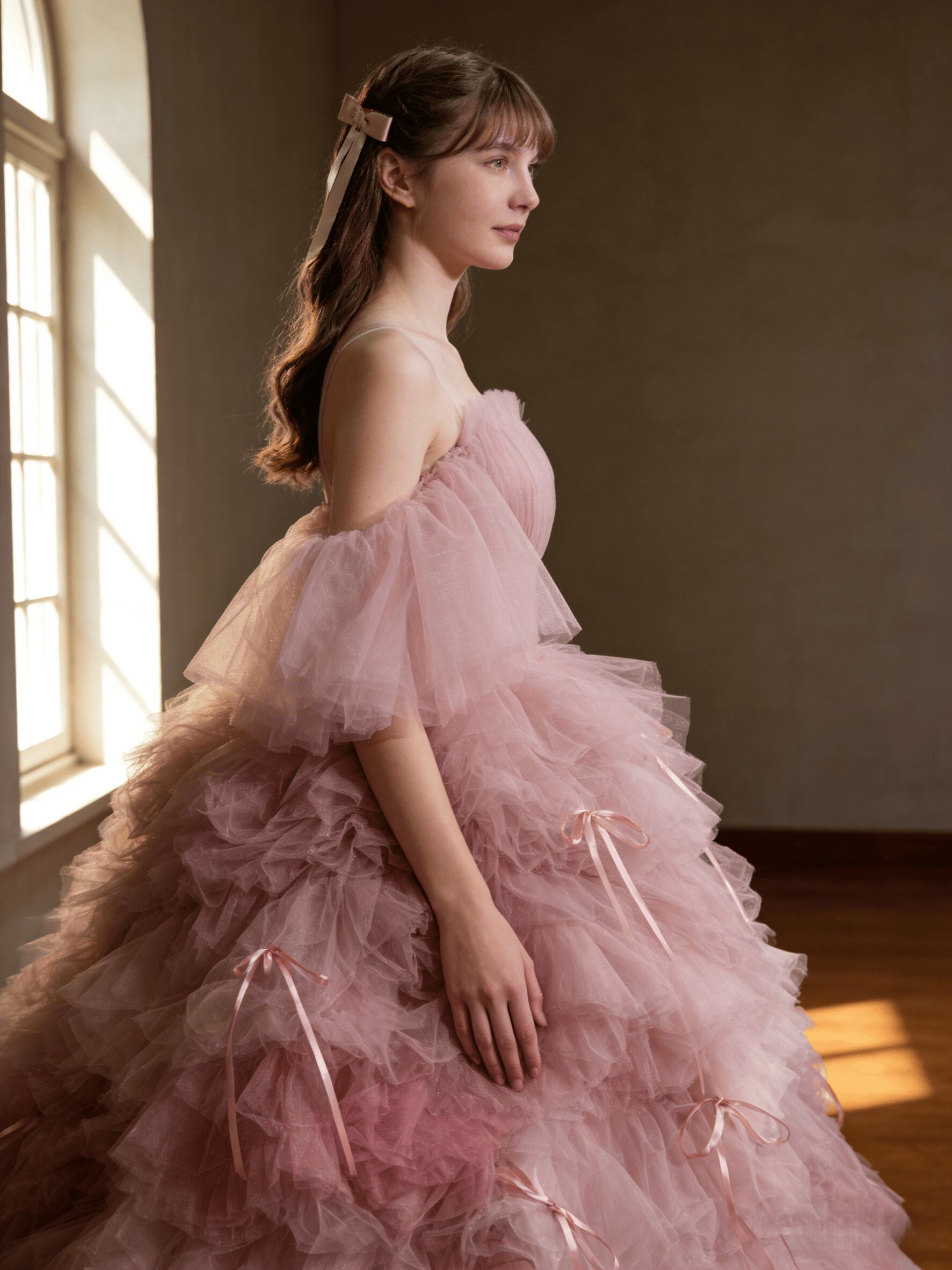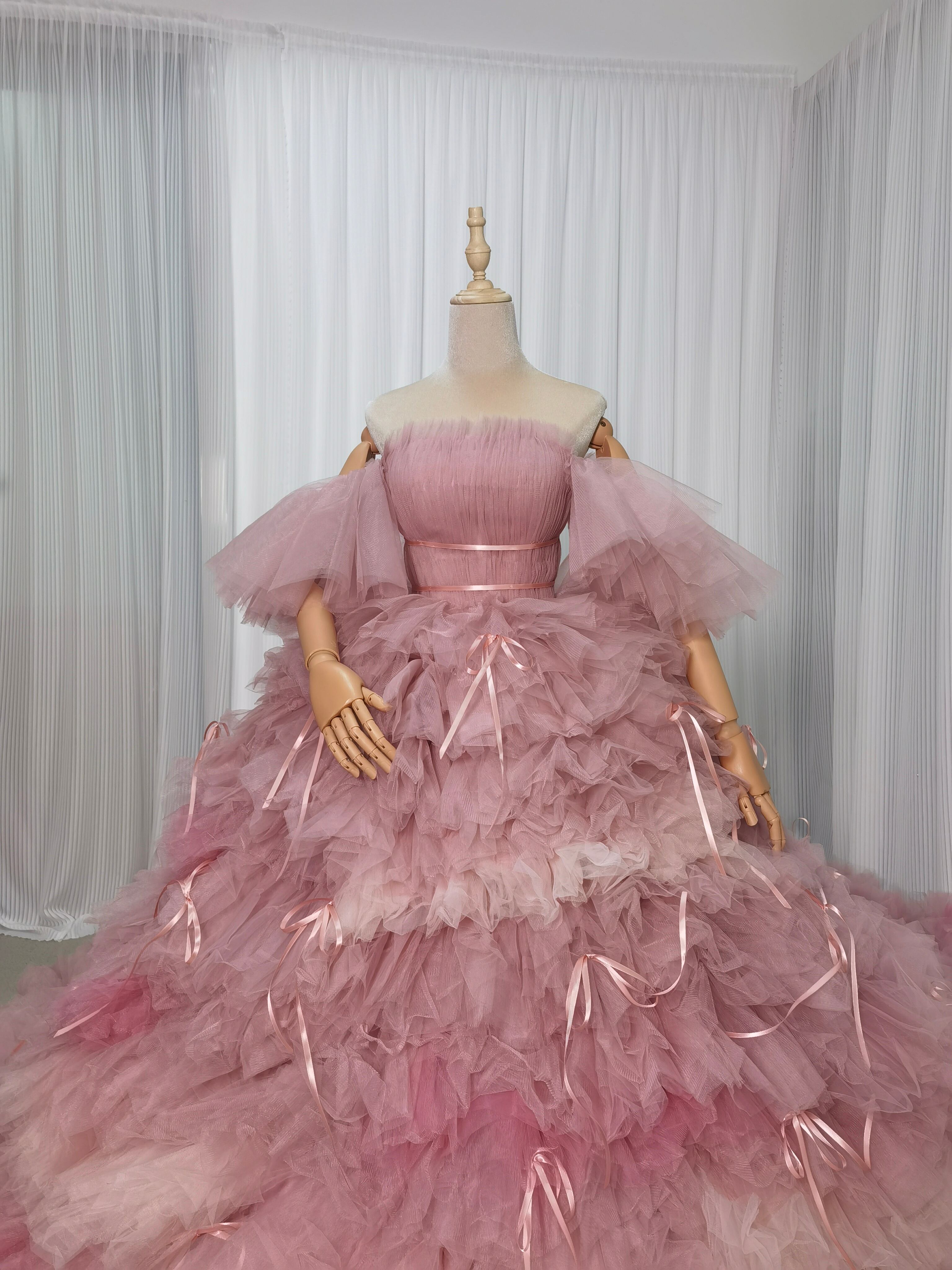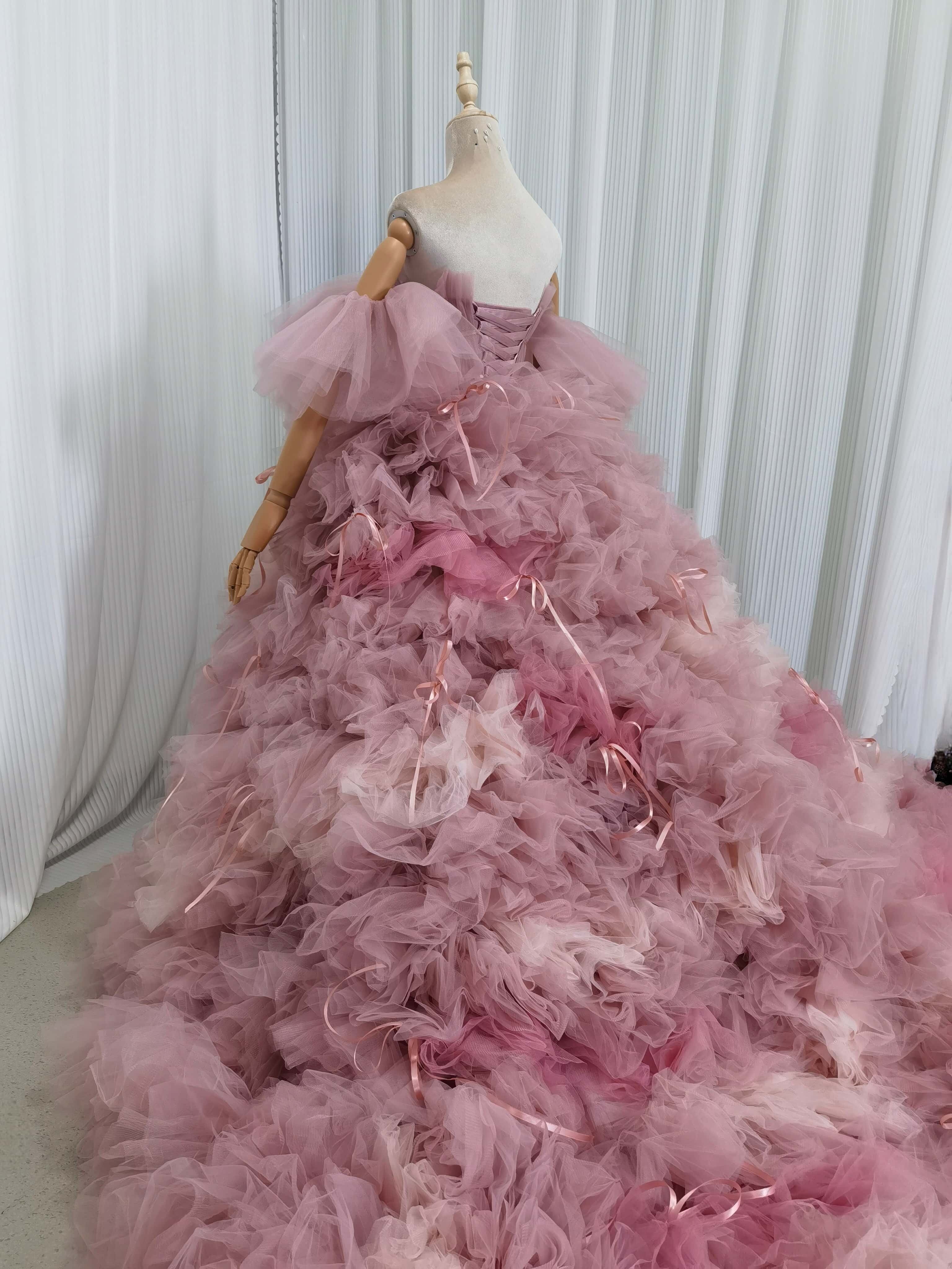 豪華!カラードレス ピンク グラデーション ふわふわ袖 ボリュームドレス ロングトレーン 花嫁 前撮り