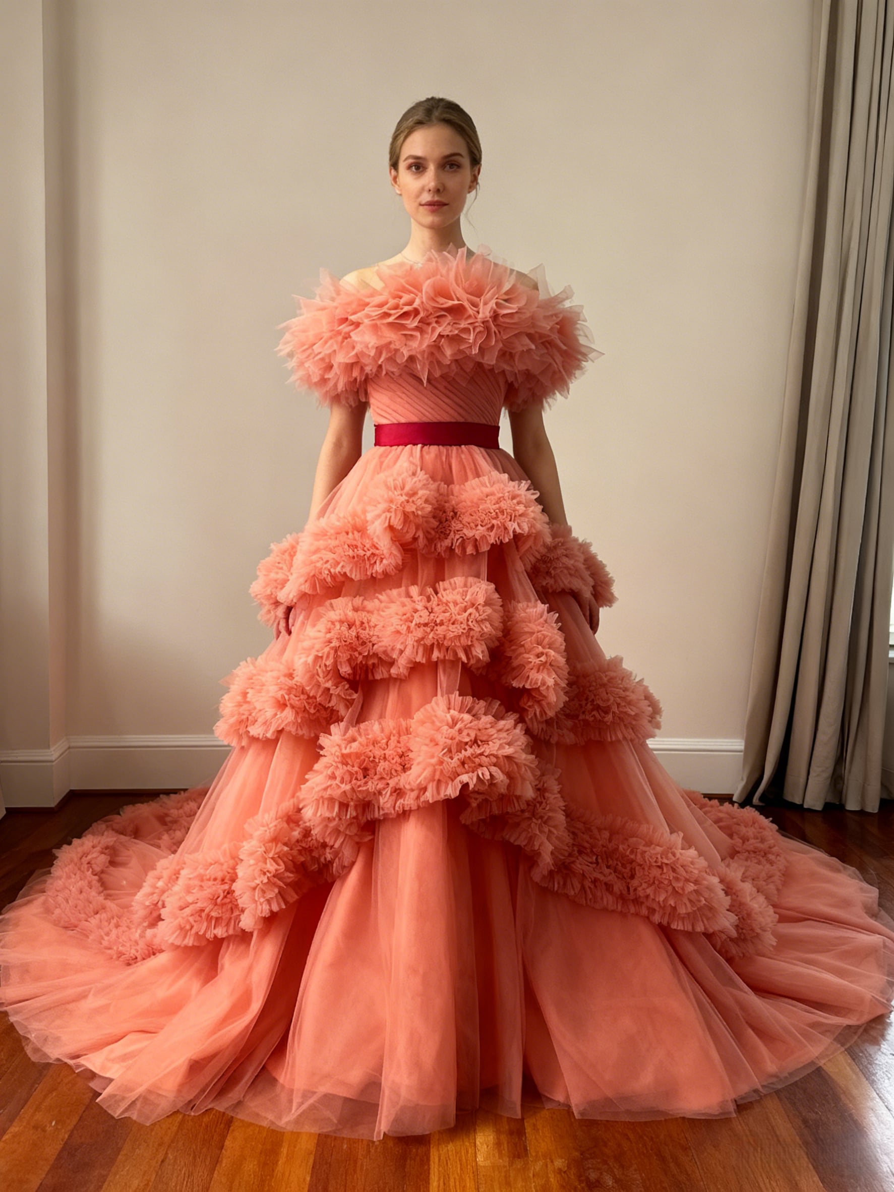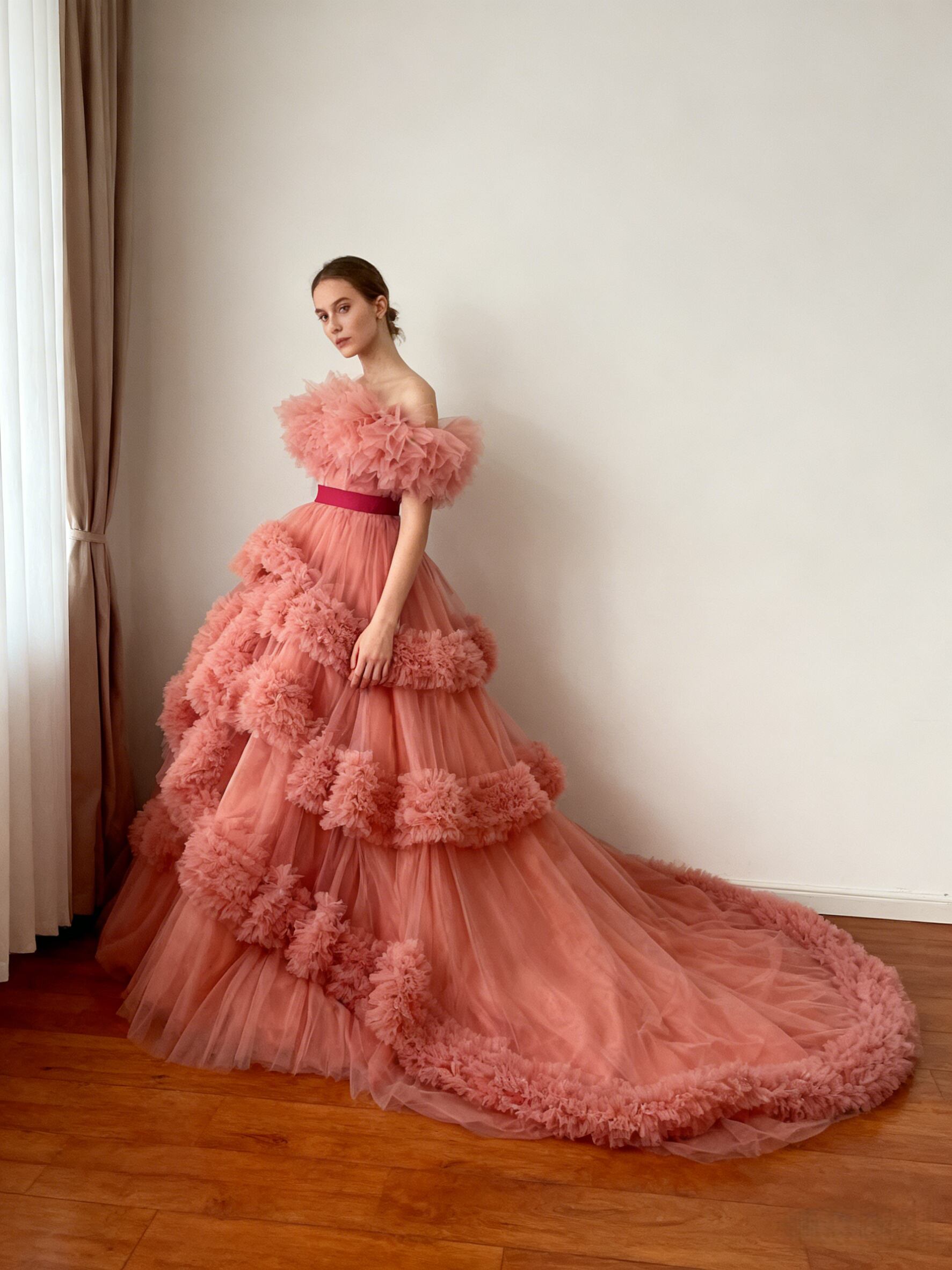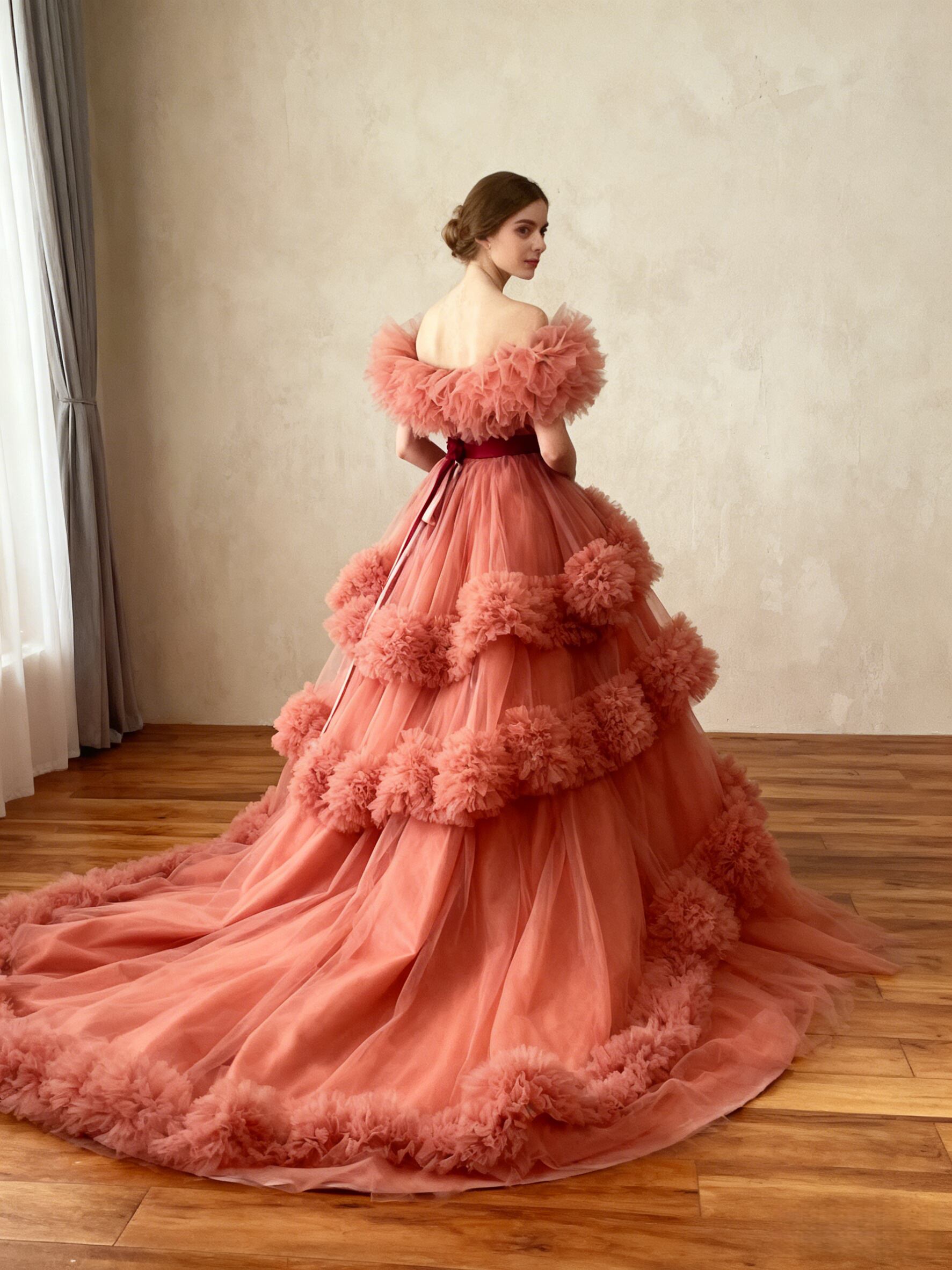 美品!カラードレス オフショルダー ローズピンク ラッフルフリル デザイン感 ロングトレーン 花嫁