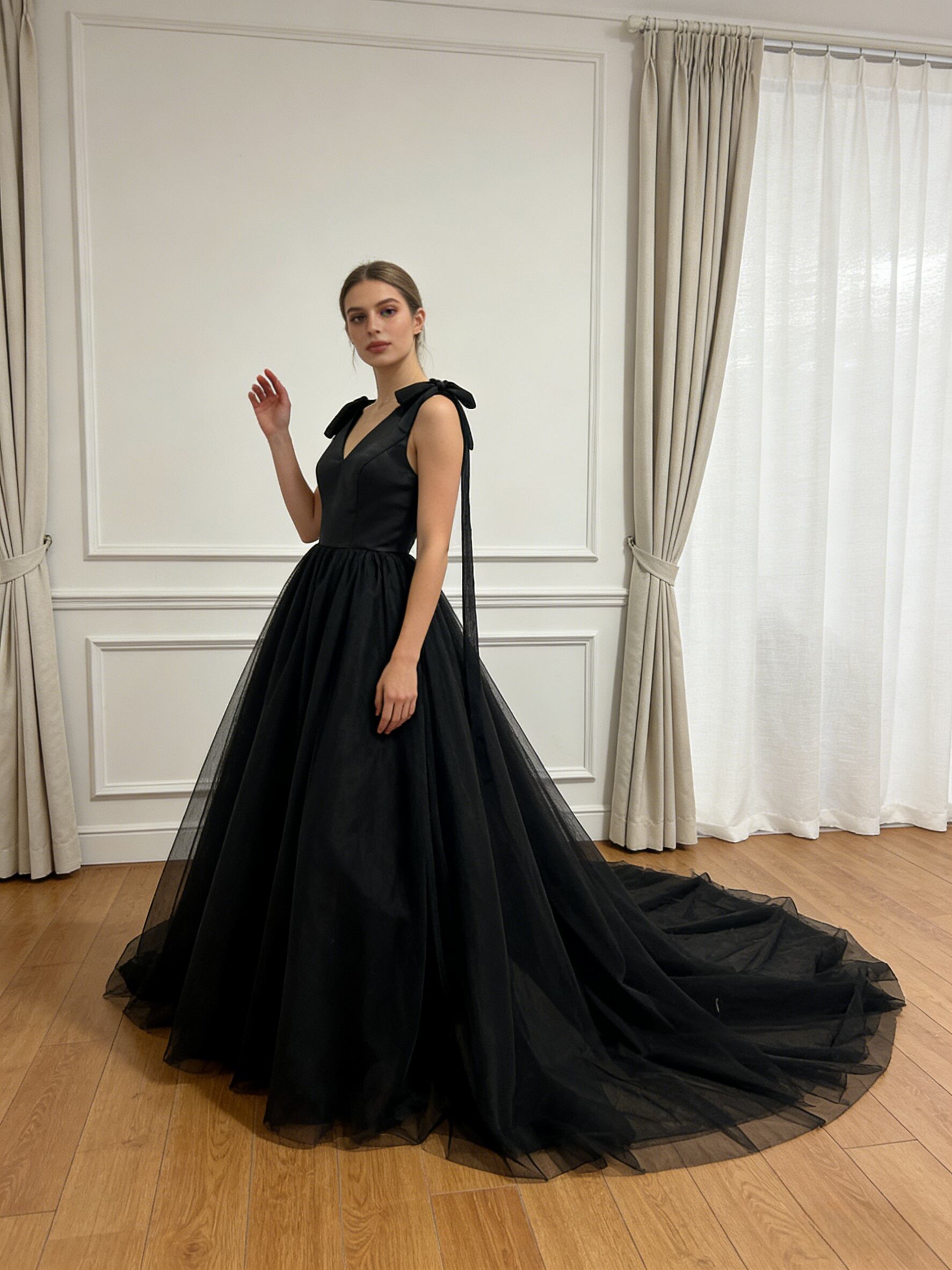 キャミソール パーティードレス ブラック Vネック 背中見せ ソフトチュール ハンドメイド オーダードレス 演奏会