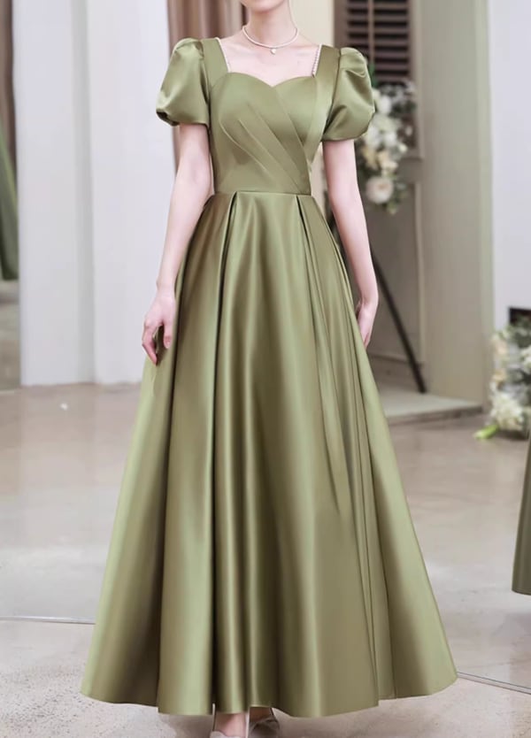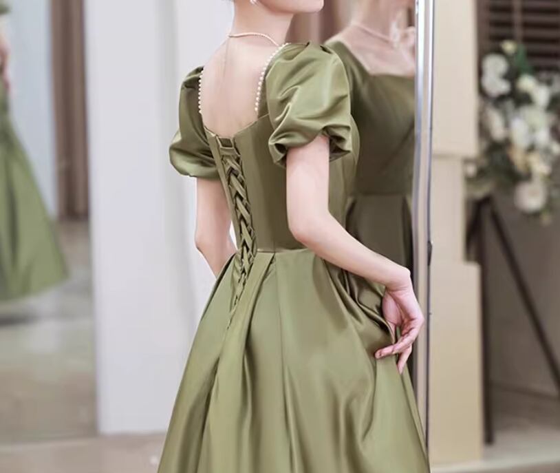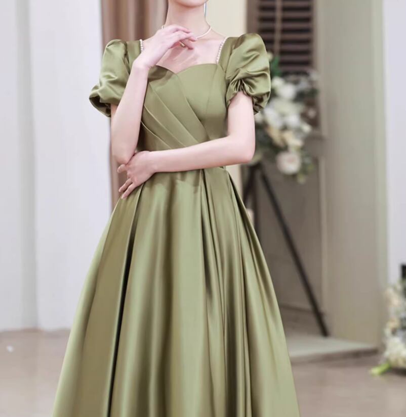 カラードレス グリーン 胸元フリル パフスリーブ パール ワンピース Aライン 編み上げ 披露宴