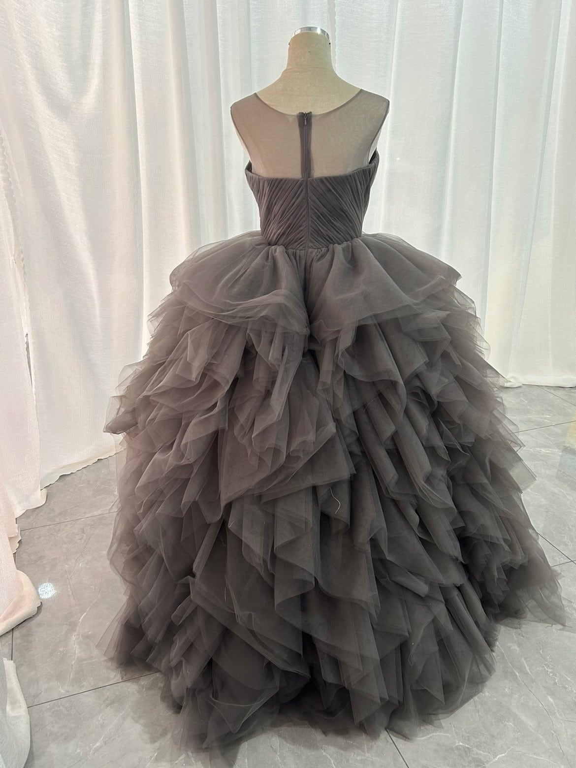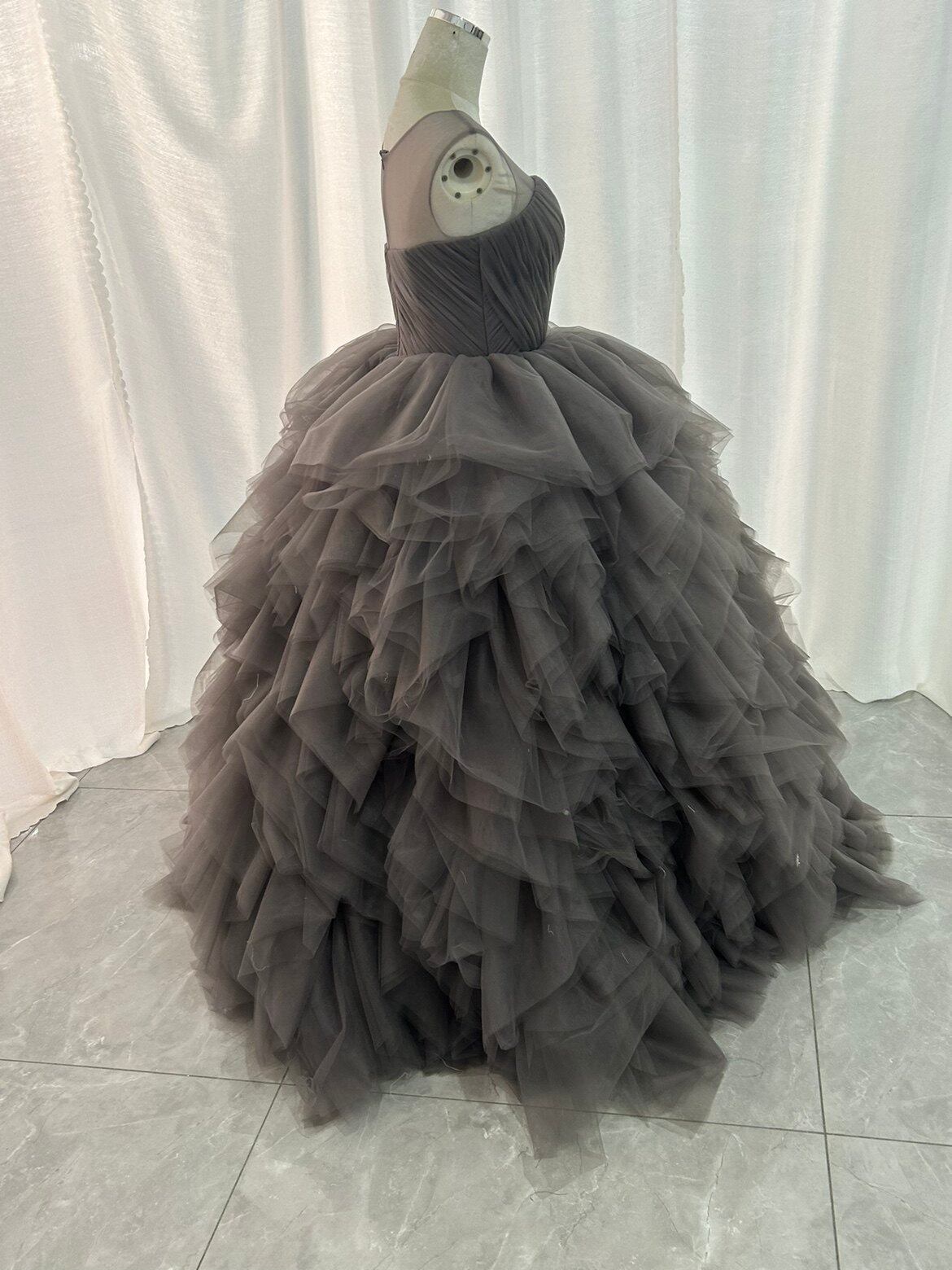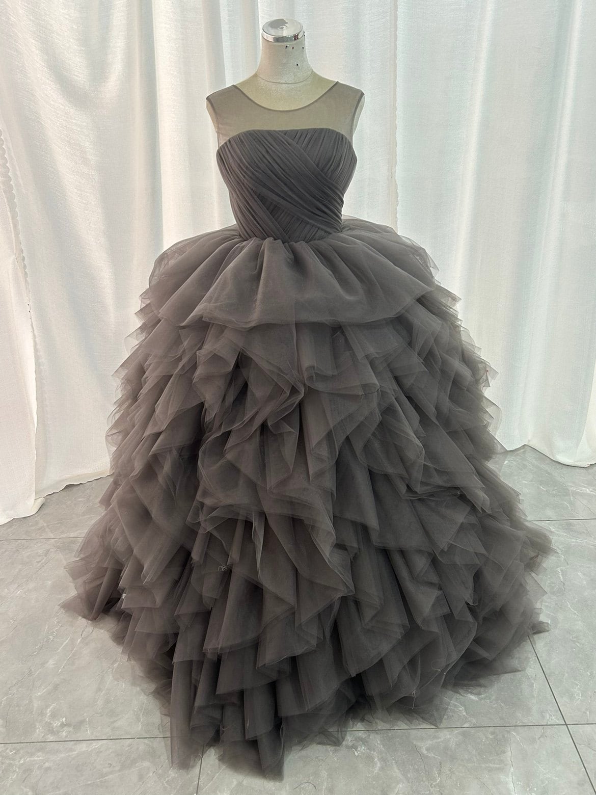カラードレス グレー ラウンドネック オリジナルドレス ラッフルフリル ボリュームドレス 披露宴