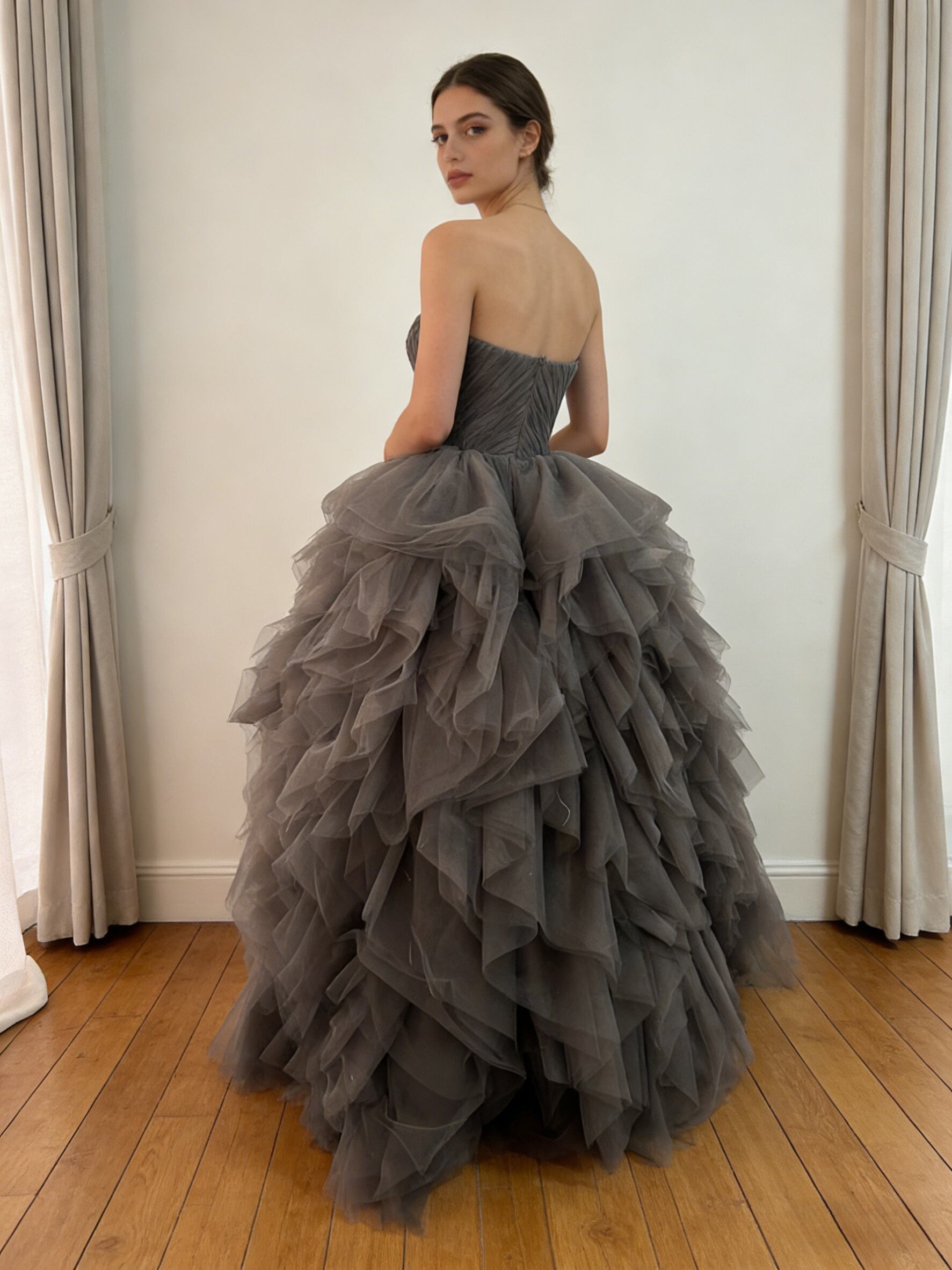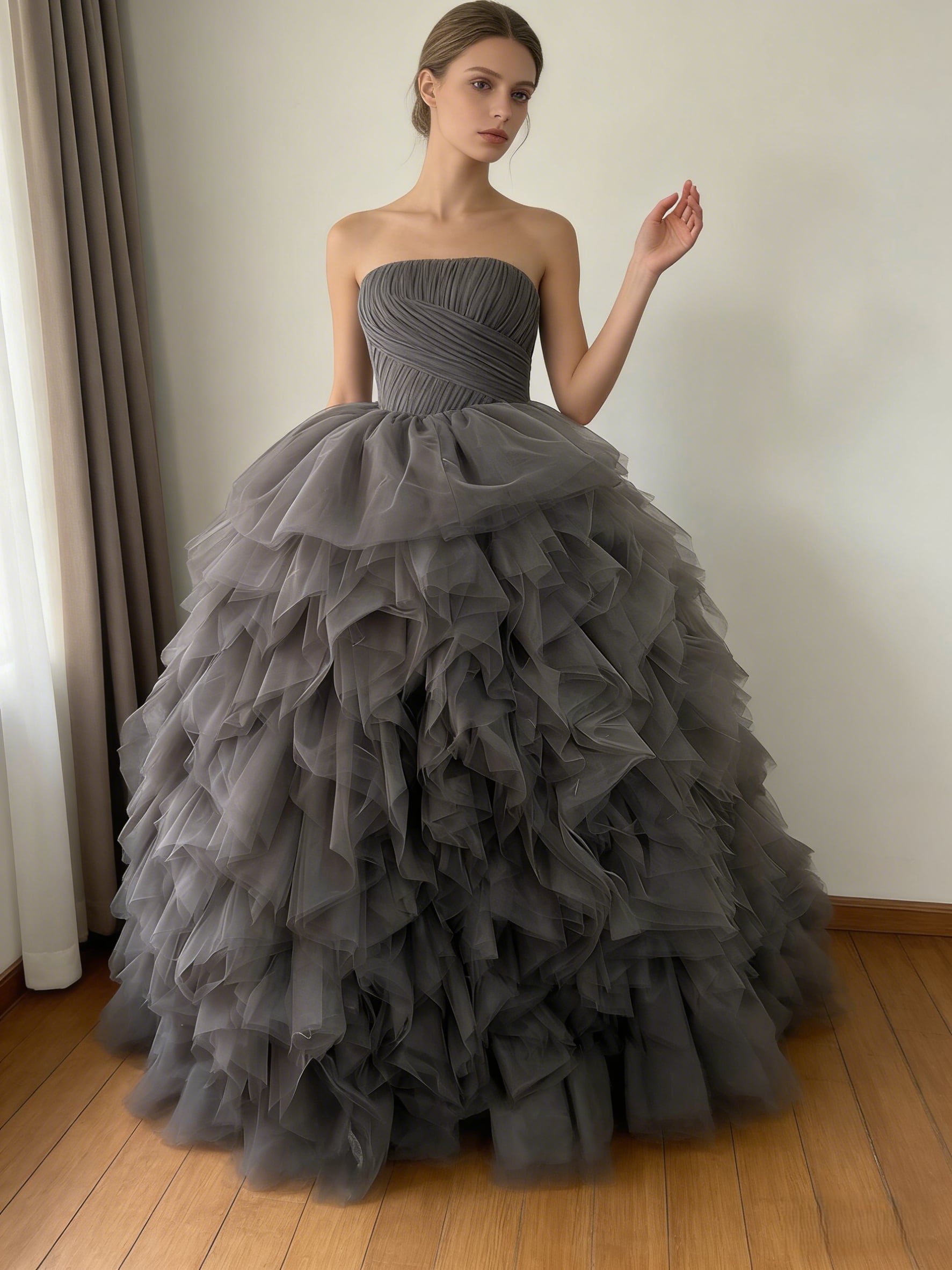 カラードレス グレー ベアトップ オリジナルドレス ラッフルフリル ボリュームドレス 披露宴
