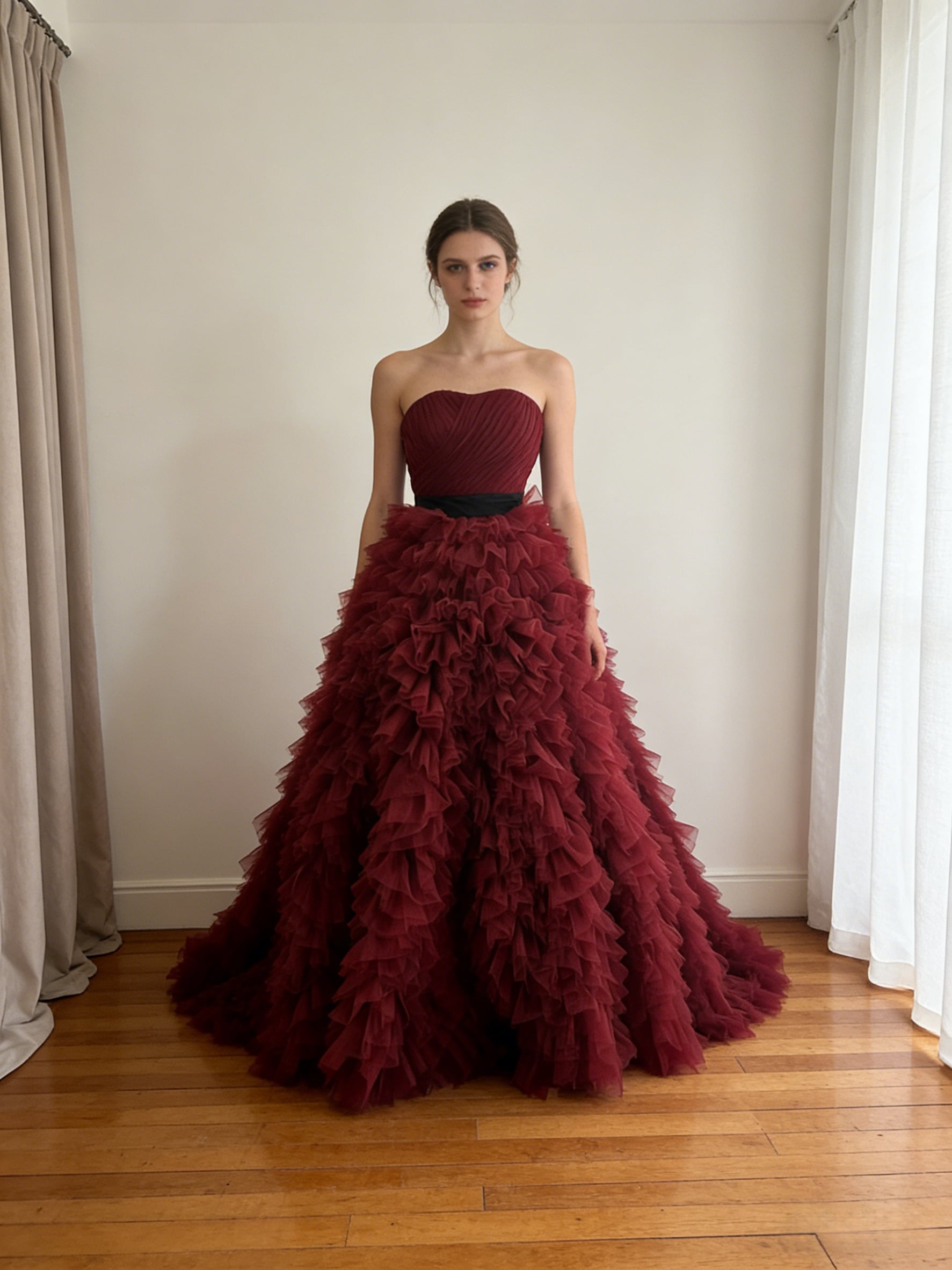 豪華!カラードレス ボルドー色 ベアトップ もこもこドレス サッシュベルト プリンセスライン 花嫁 前撮り