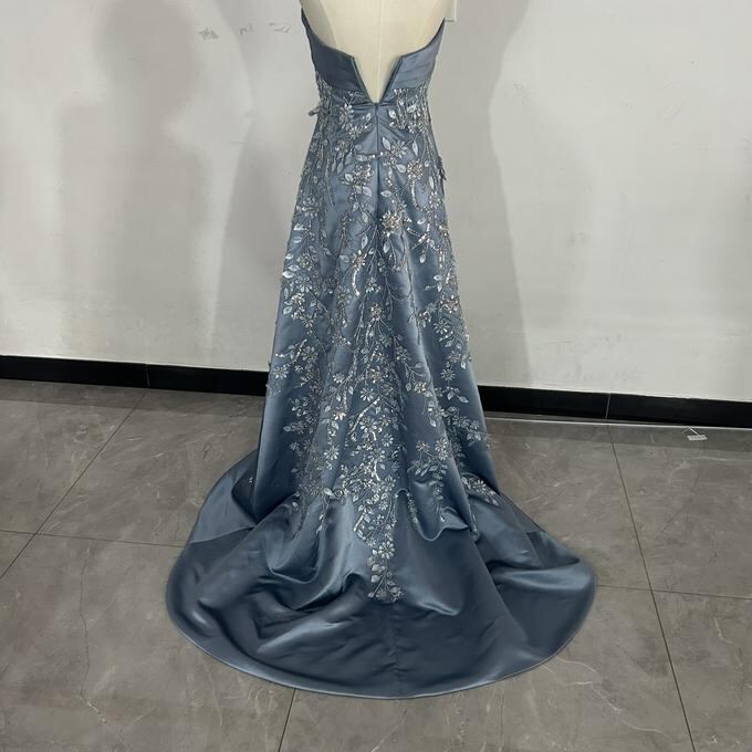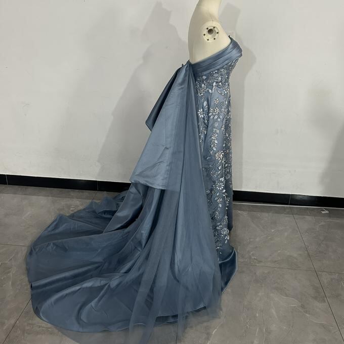 実例写真!パーティードレス 深ブルーグレー ベアトップ 取り外し可能トレーン キラキラ光る刺繍 エレガント