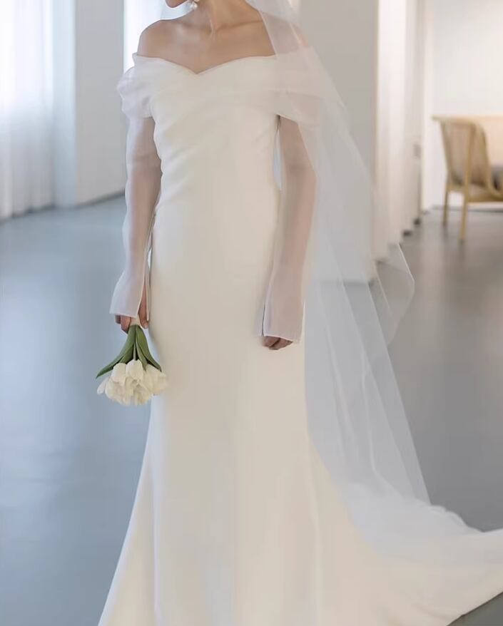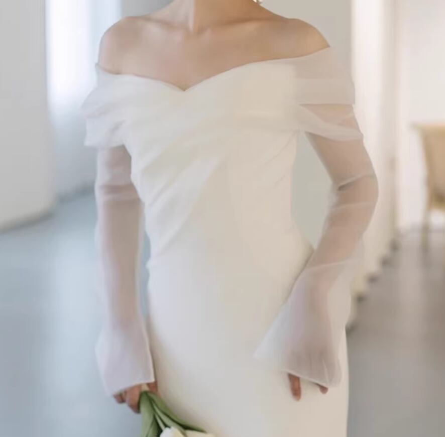 フランス風 ウェディングドレス オフショルダー シースルー袖 優雅なシルエット 大人っぽい 結婚式