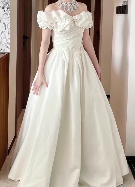 ウエディングドレス オフショルダー ハンドドレープ Aライン 光沢サテン 大人っぽい 結婚式