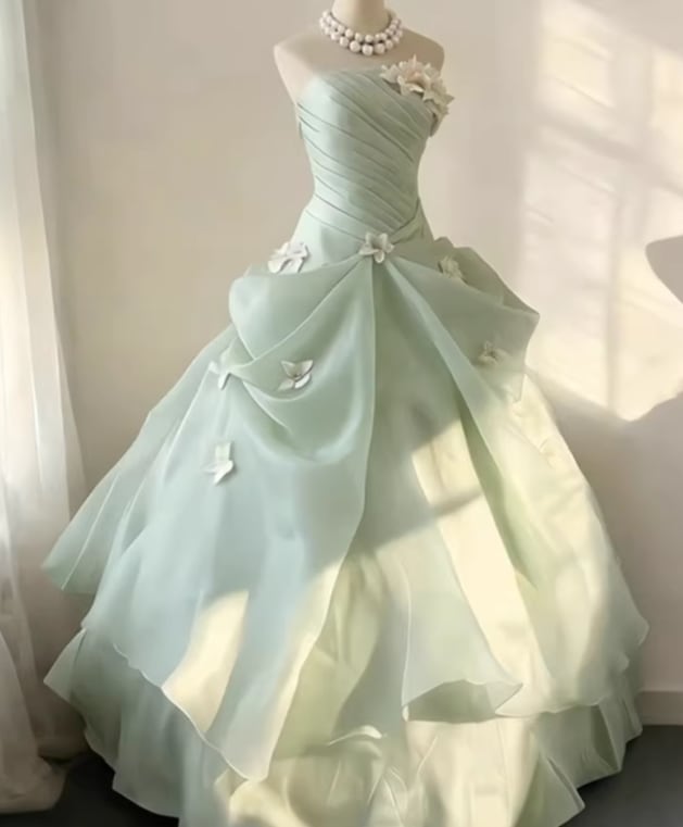 カラードレス グリーン ベアトップ 花モチーフ ハンドドレープ フレアスカート ボリュームドレス 花嫁