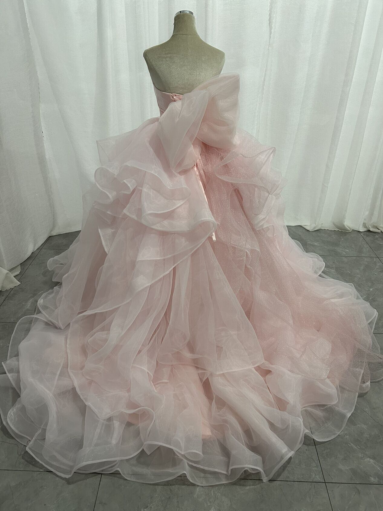豪華!カラードレス 薄桃色 ベアトップ ラッフルフリル 豪華なバックリボン プリンセスライン 花嫁
