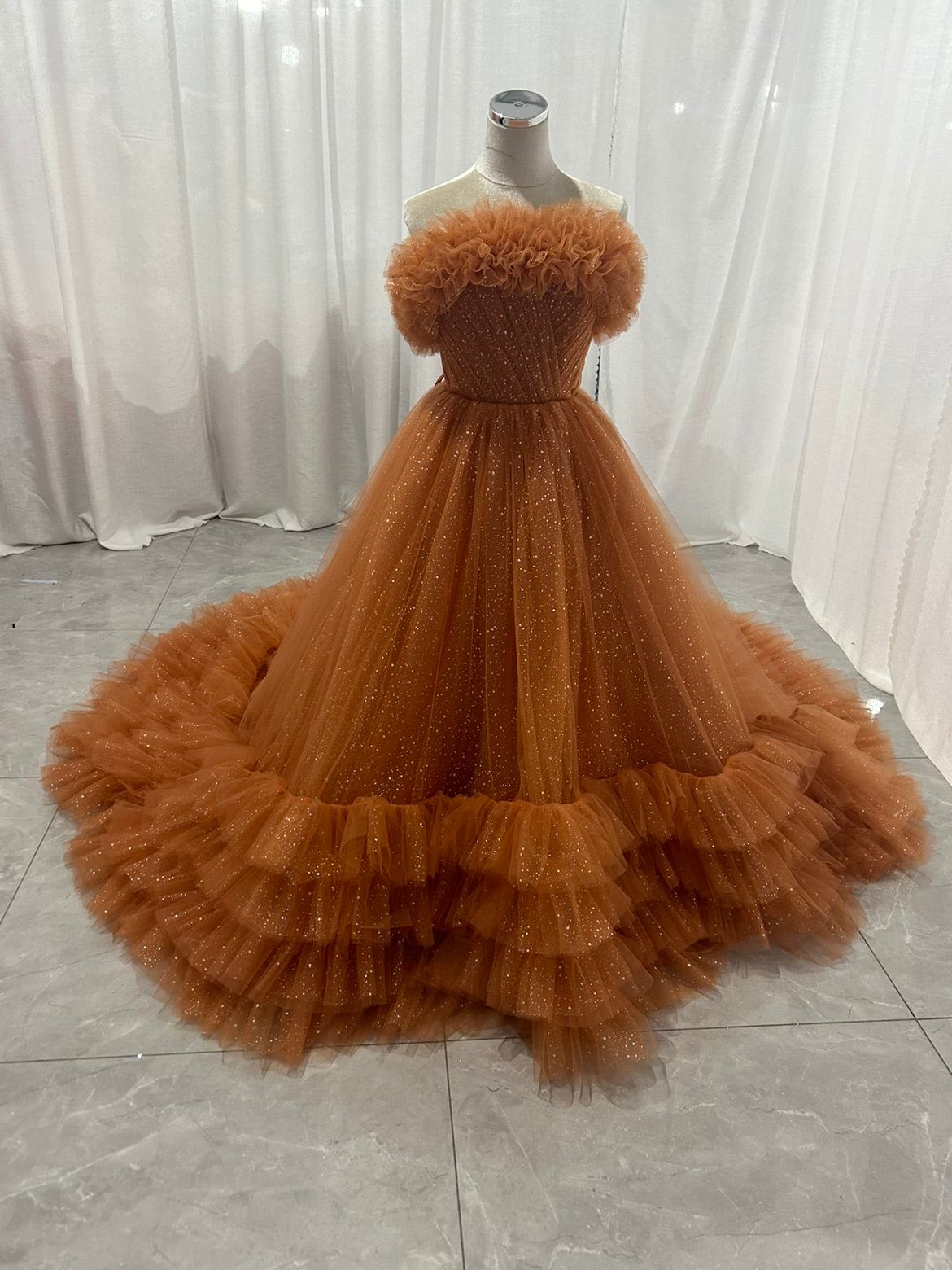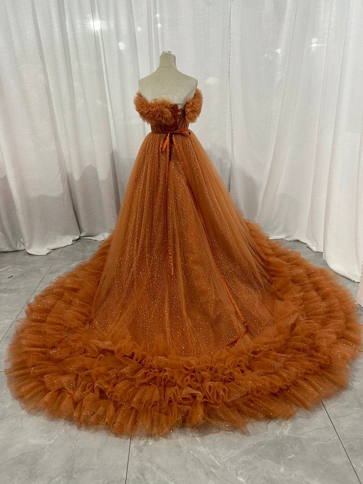 カラードレス オレンジ ベアトップ 取り外し ラッフルフリル 華やかなトレーン キラキラチュール 花嫁