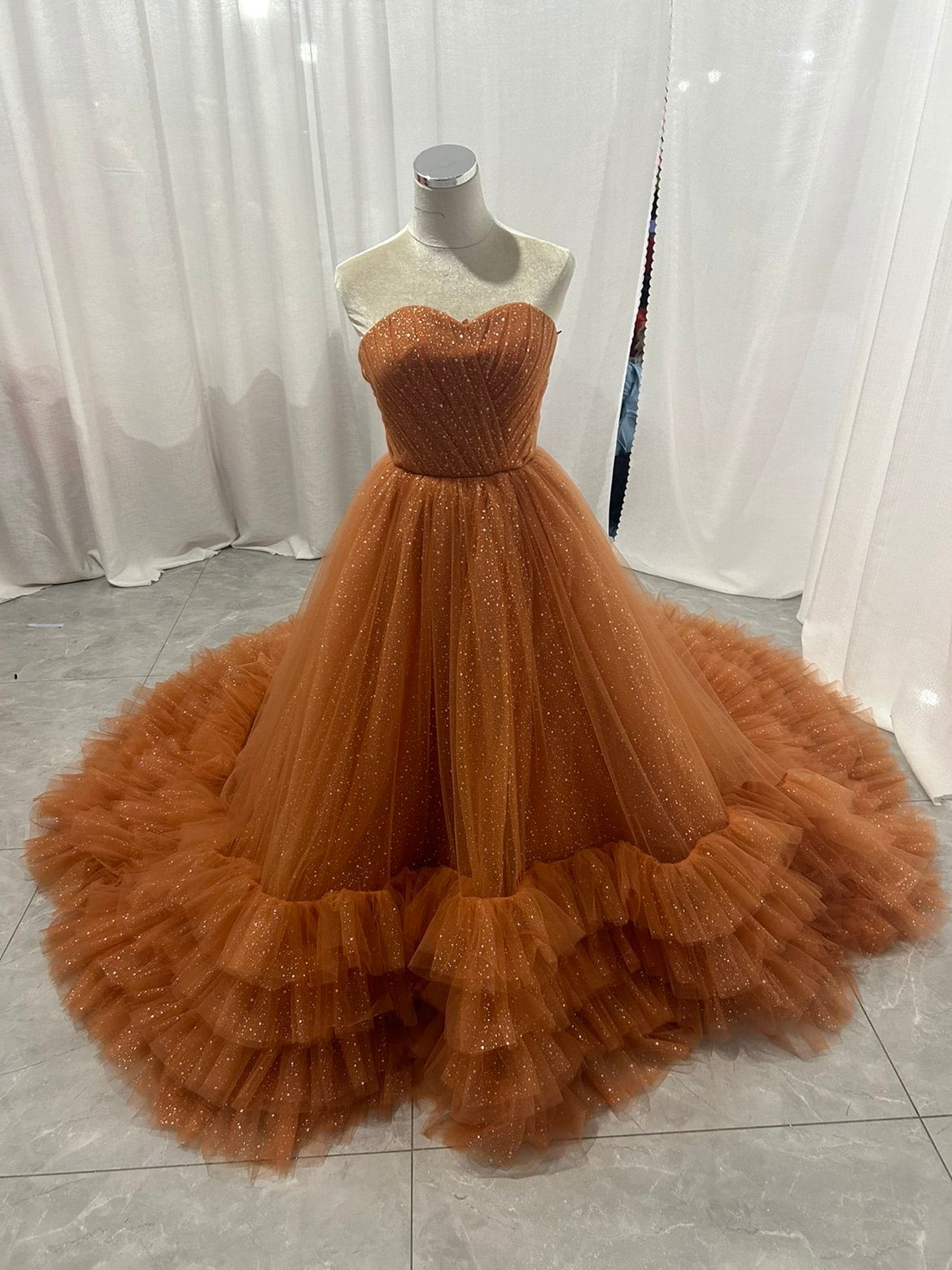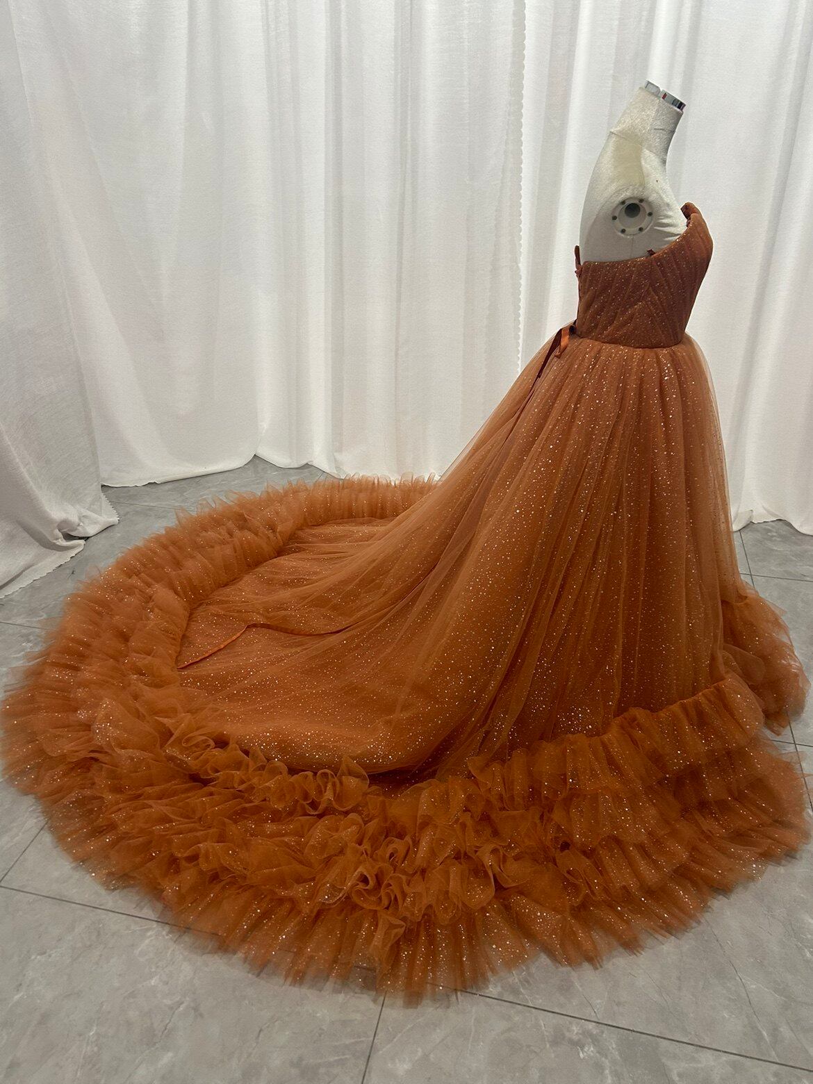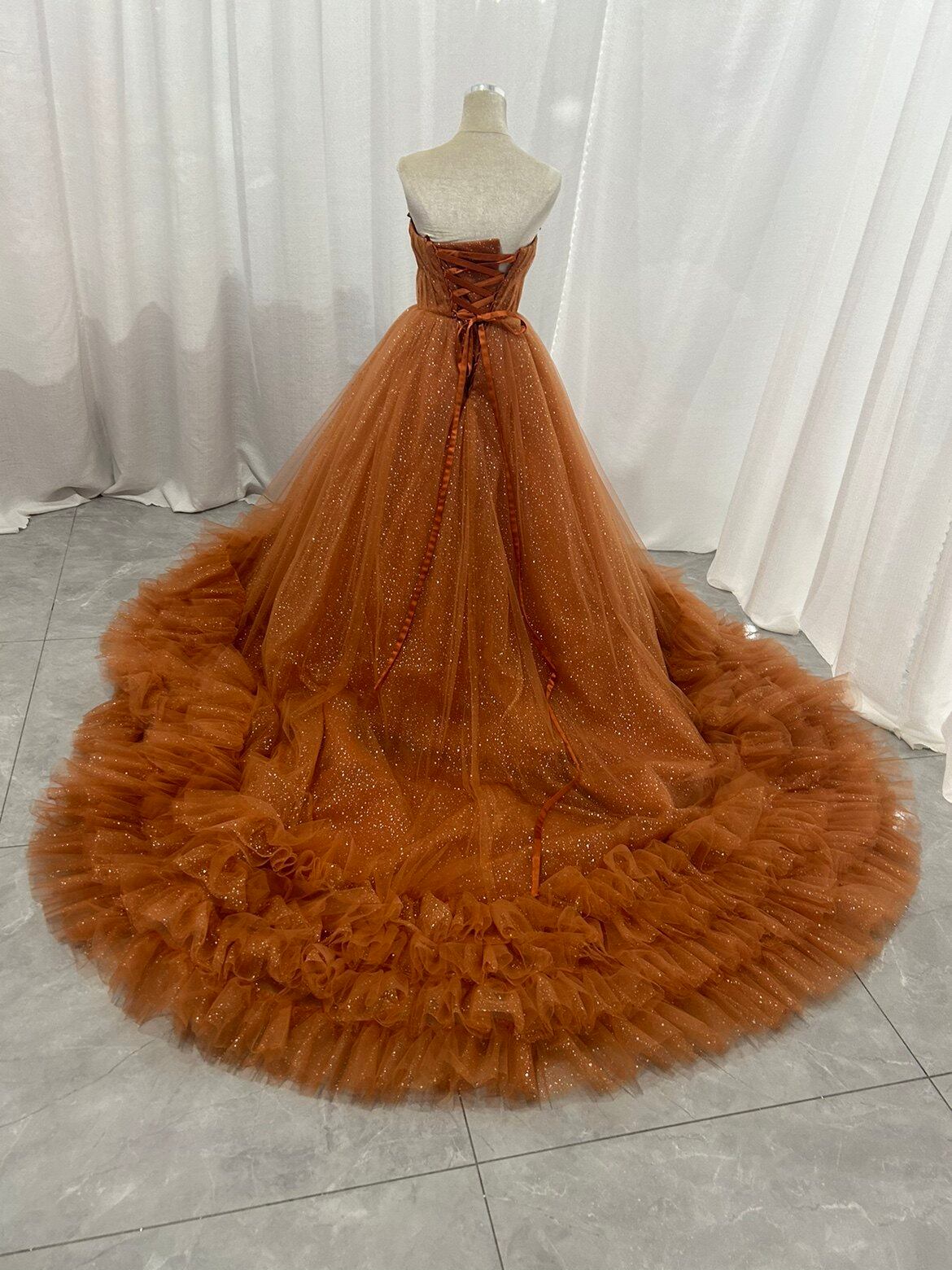 カラードレス オレンジ ベアトップ ラッフルフリル 華やかなトレーン キラキラチュール 花嫁