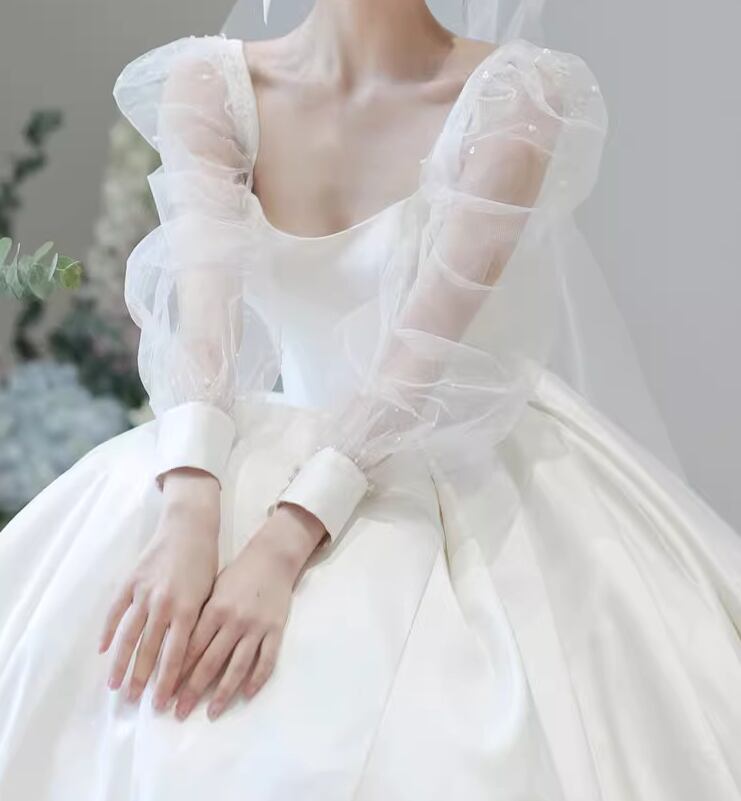 フランス風 ウェディングドレス シースルー袖 ロイヤルサテン ロング 大人っぽい 結婚式