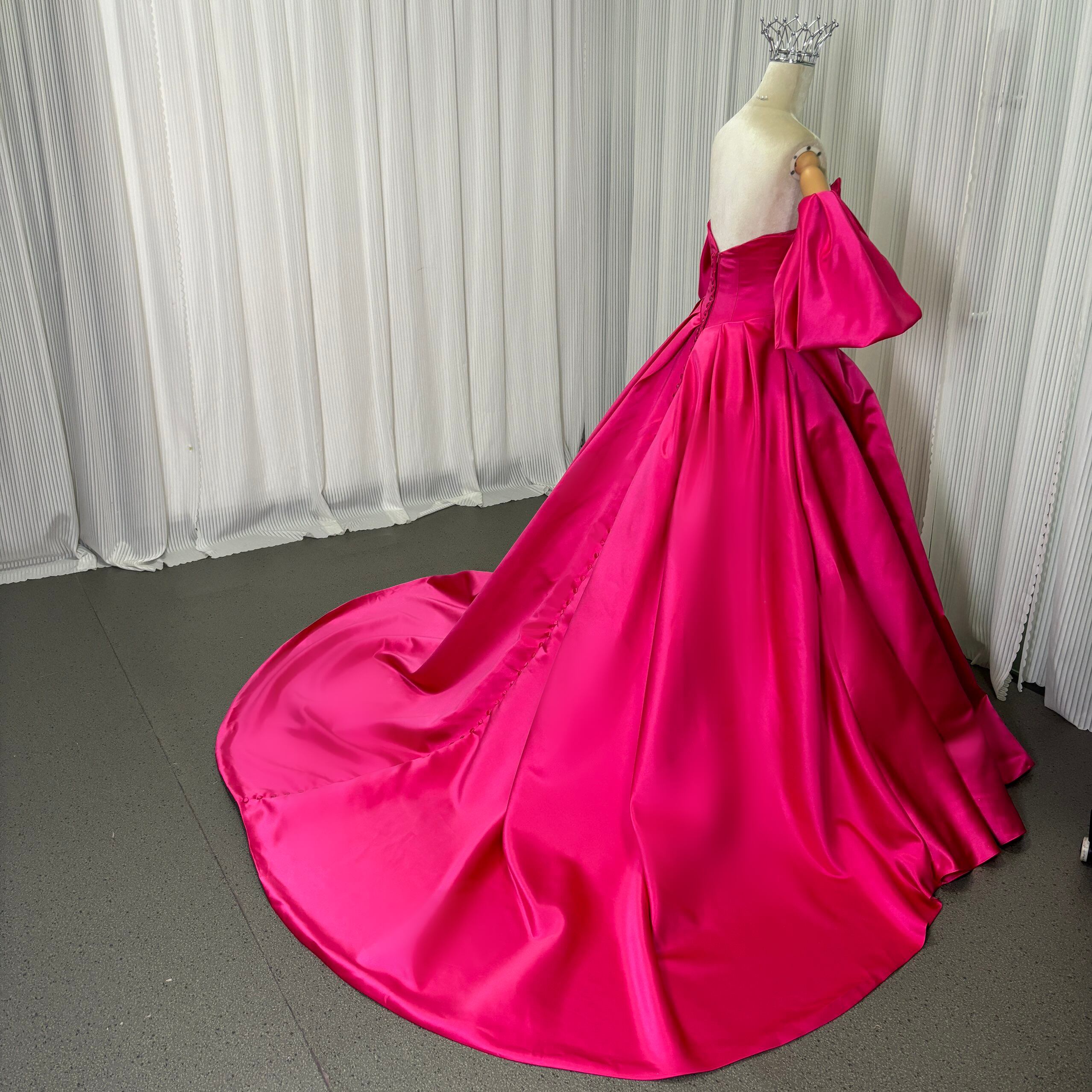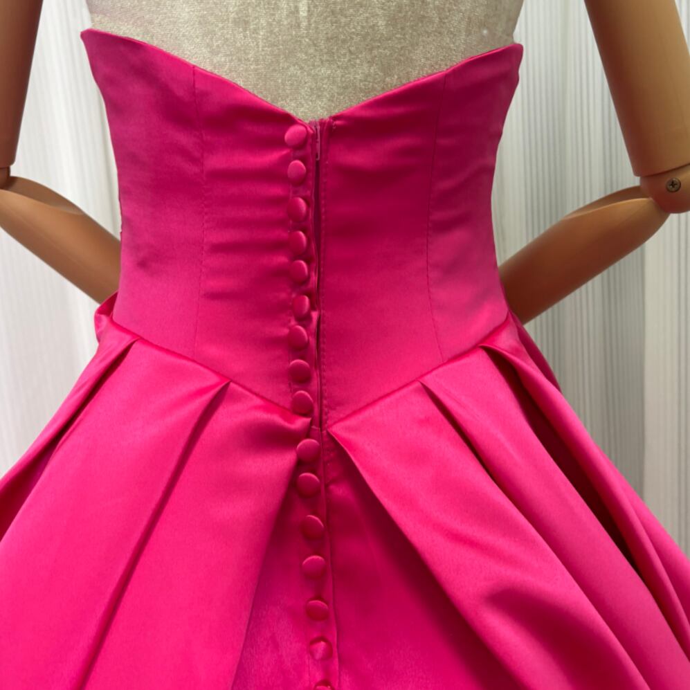 カラードレス ビビッドピンク ベアトップ パフスリーブ 光沢サテン ロング Aライン くるみボタン 発表会