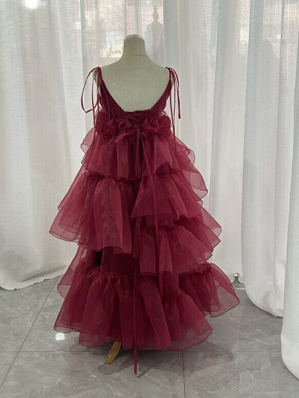 実例写真!ボルドー色 カラードレス キャミソール 上質オーガンジー デザイン感 可愛い 編み上げ 前撮り