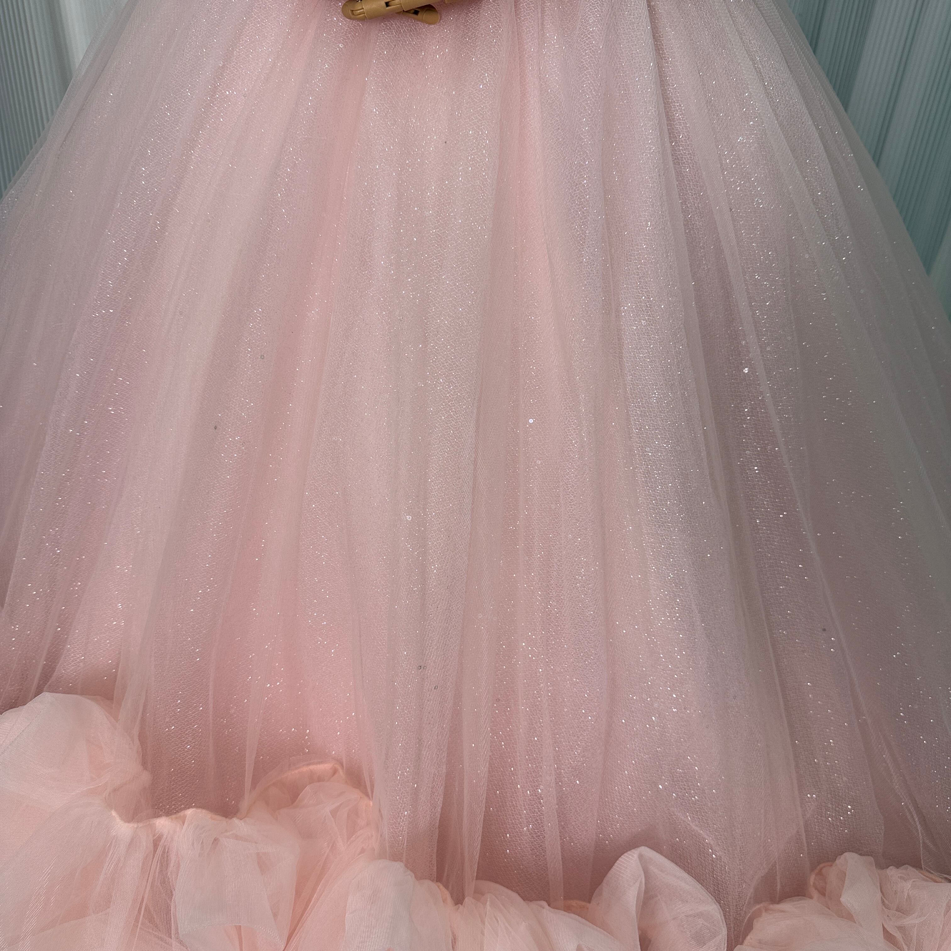 美品!カラードレス 薄ピンク オフショルダー 華やかなトレーン プリンセスライン キラキラチュール 前撮り