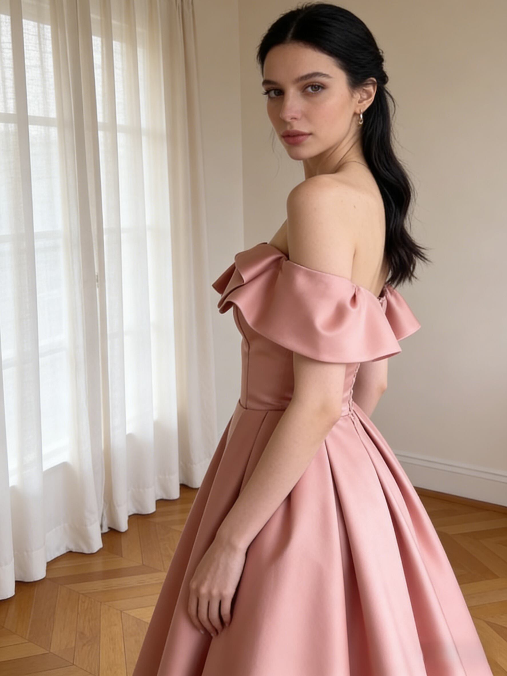 カラードレス ピンク オフショルダー ハンドドレープ Aライン ロング ファスナー 披露宴