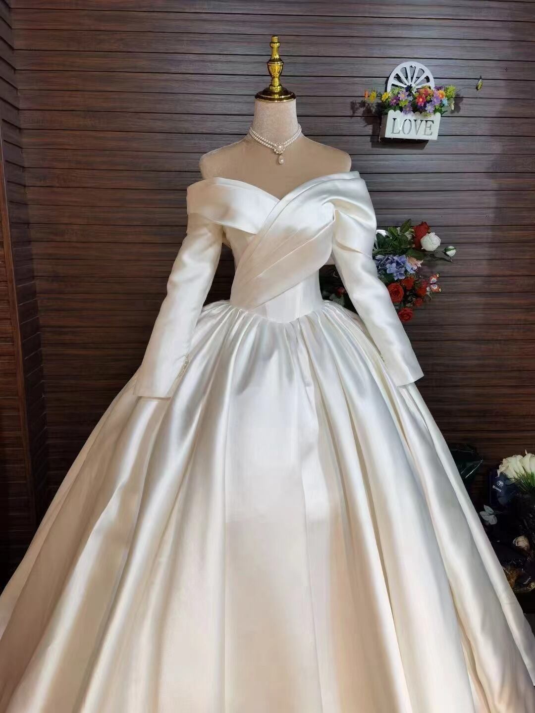 高品質!ウェディングドレス オフショルダー ロングスリーブ 光沢サテン 結婚式