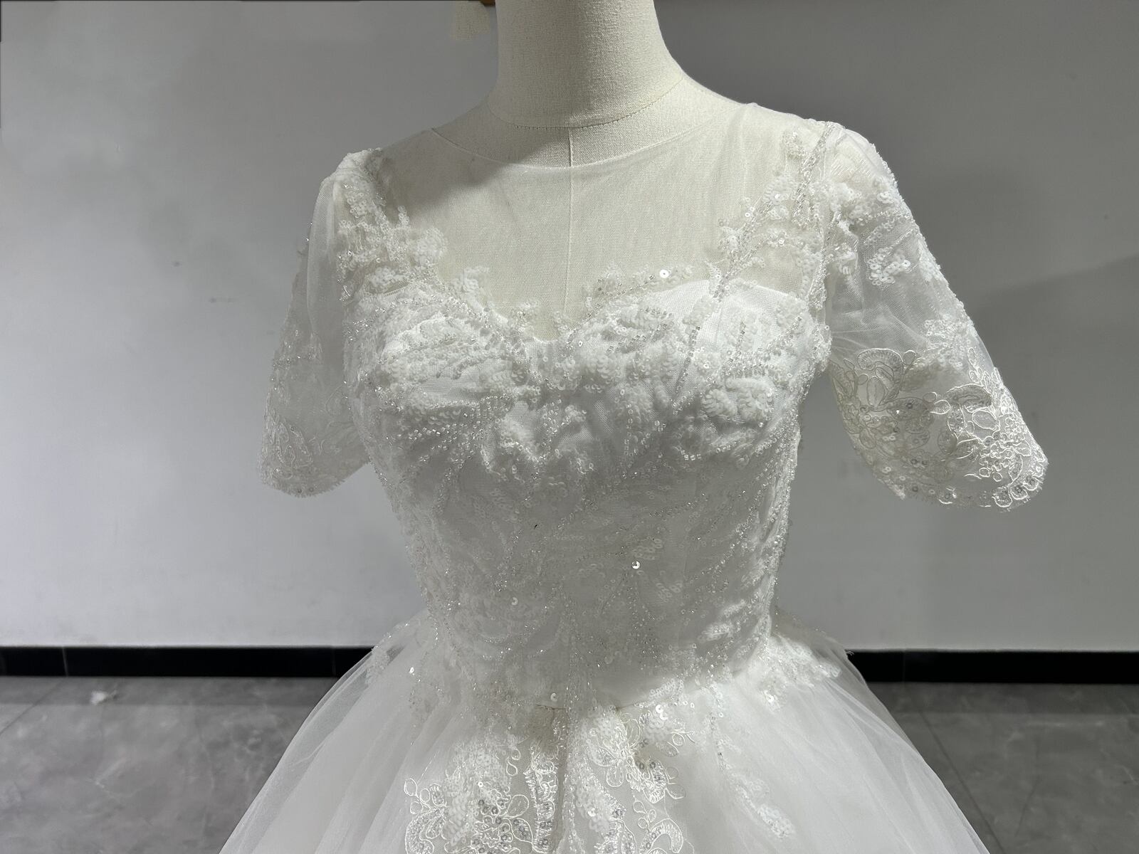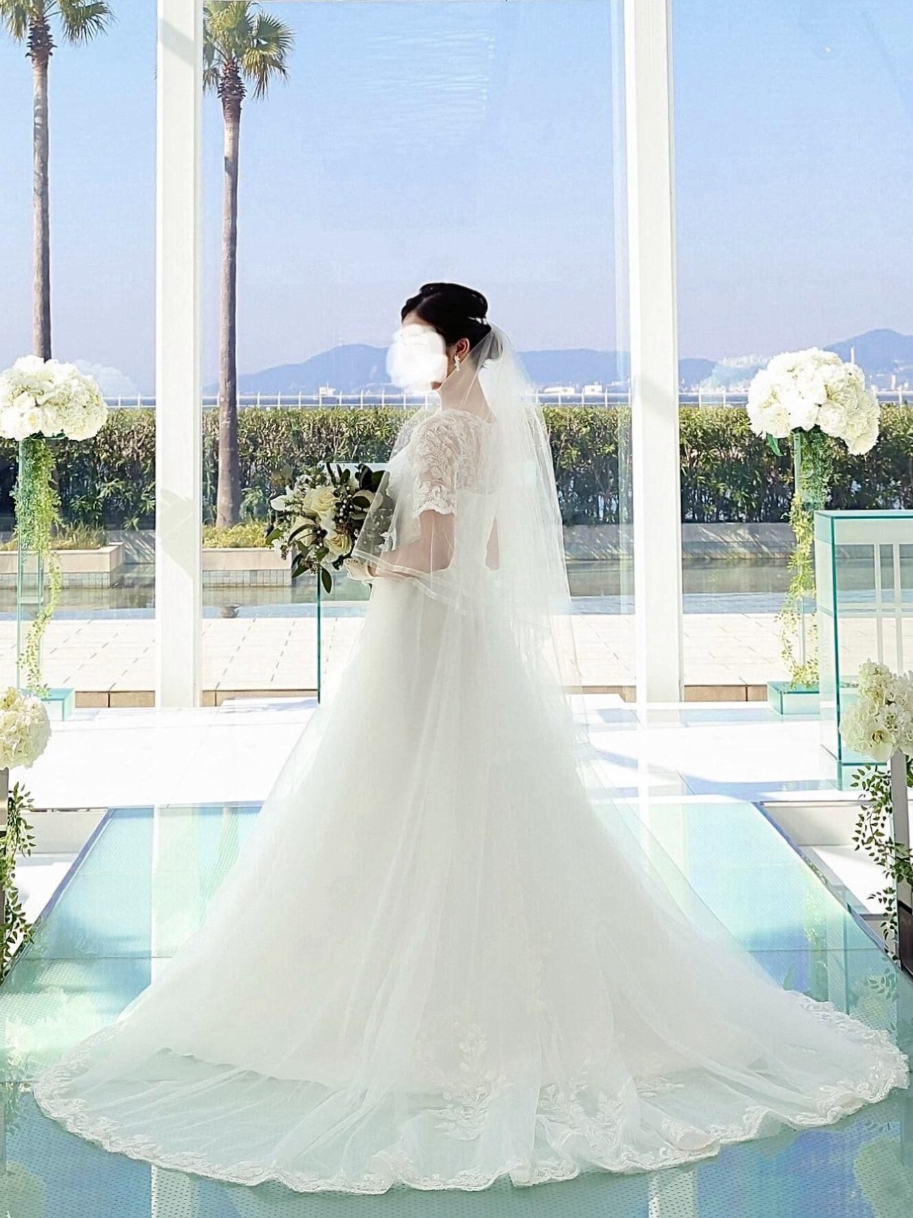 実例写真!ウェディングドレス 半袖 キラキラ光る刺繍 華やかなトレーン デザイン感 拳式/前撮り