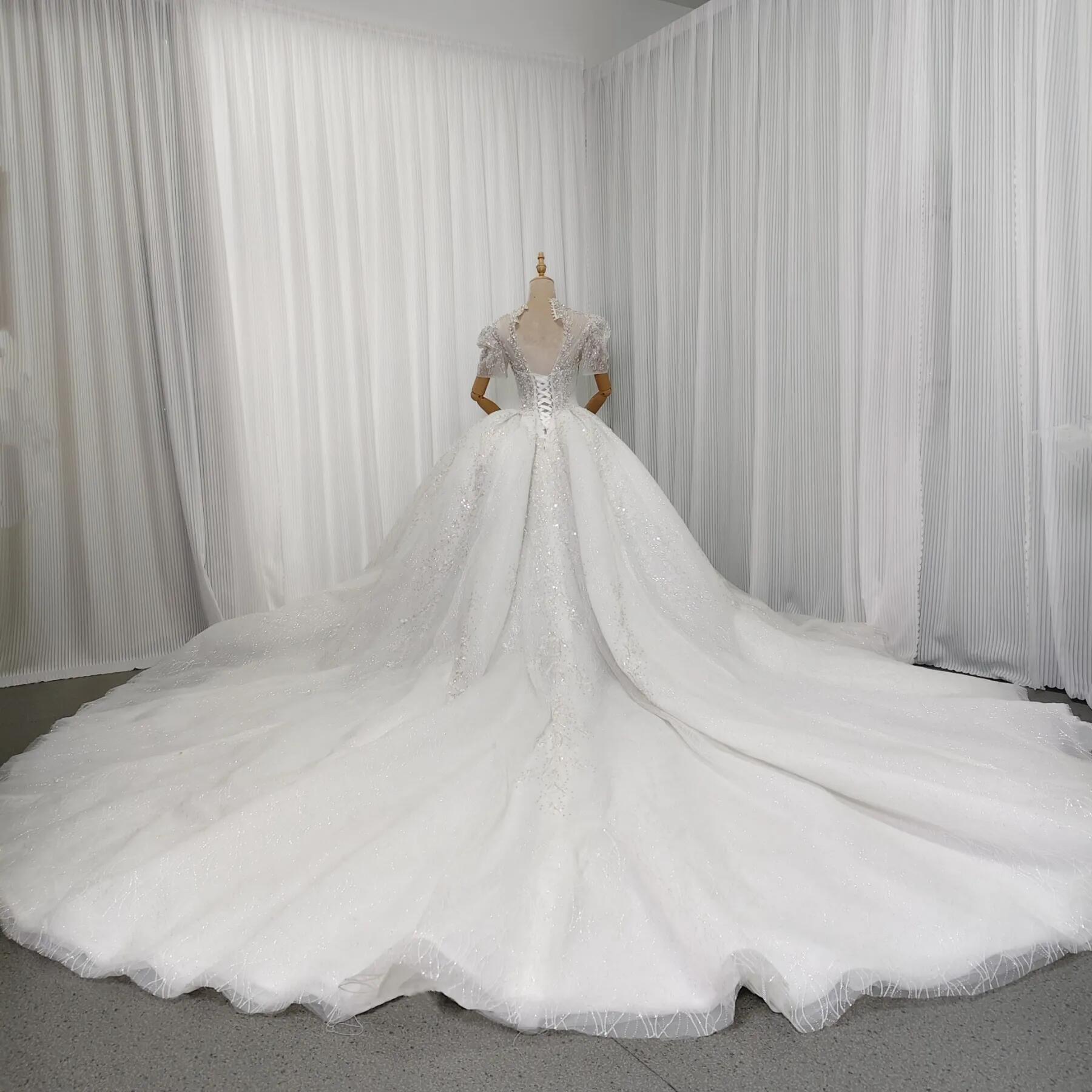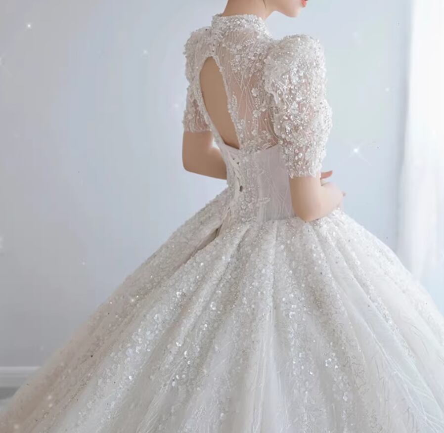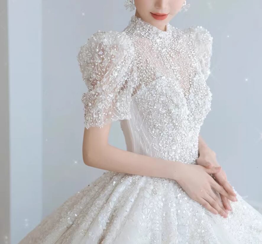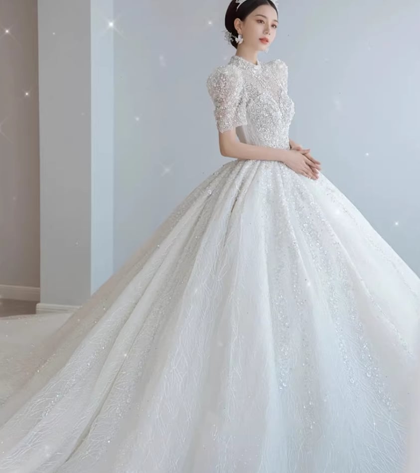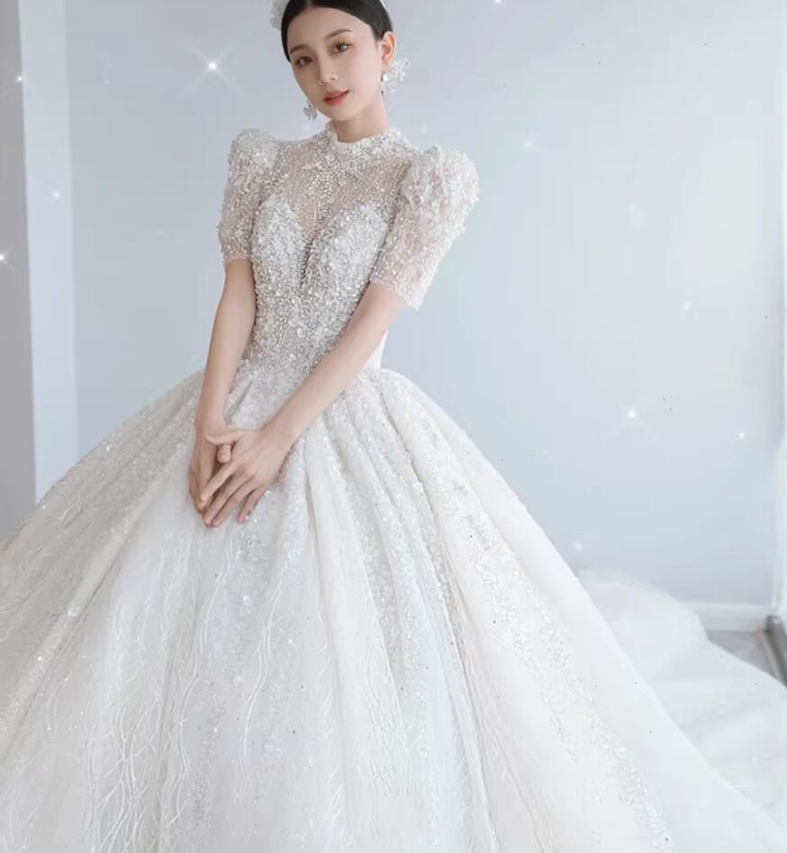 豪華!ウェディングドレス 韓国風ドレス 姫袖 キラキラ光る刺繍 ロングトレーン ボリュームドレス 結婚式
