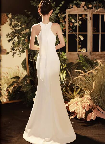 ウェディングドレス ホルターネック マーメイドライン ミニトレーン 光沢サテン 結婚式