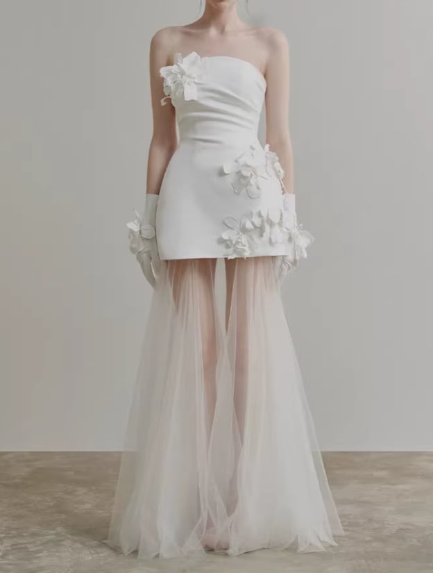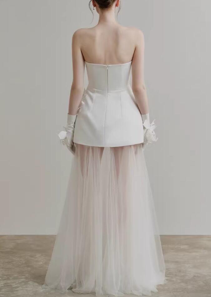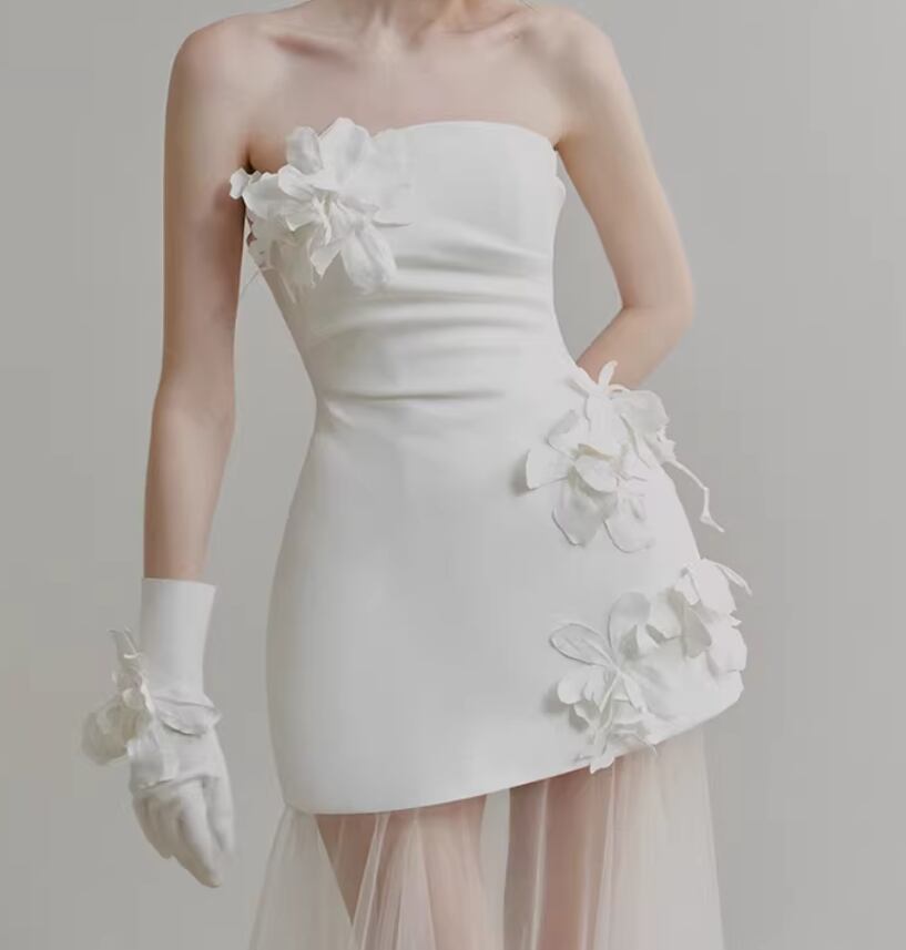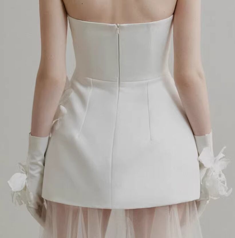 パーティードレス オフホワイト ベアトップ バラトレーン ミニワンピース デザイン感 セクシー 前撮り