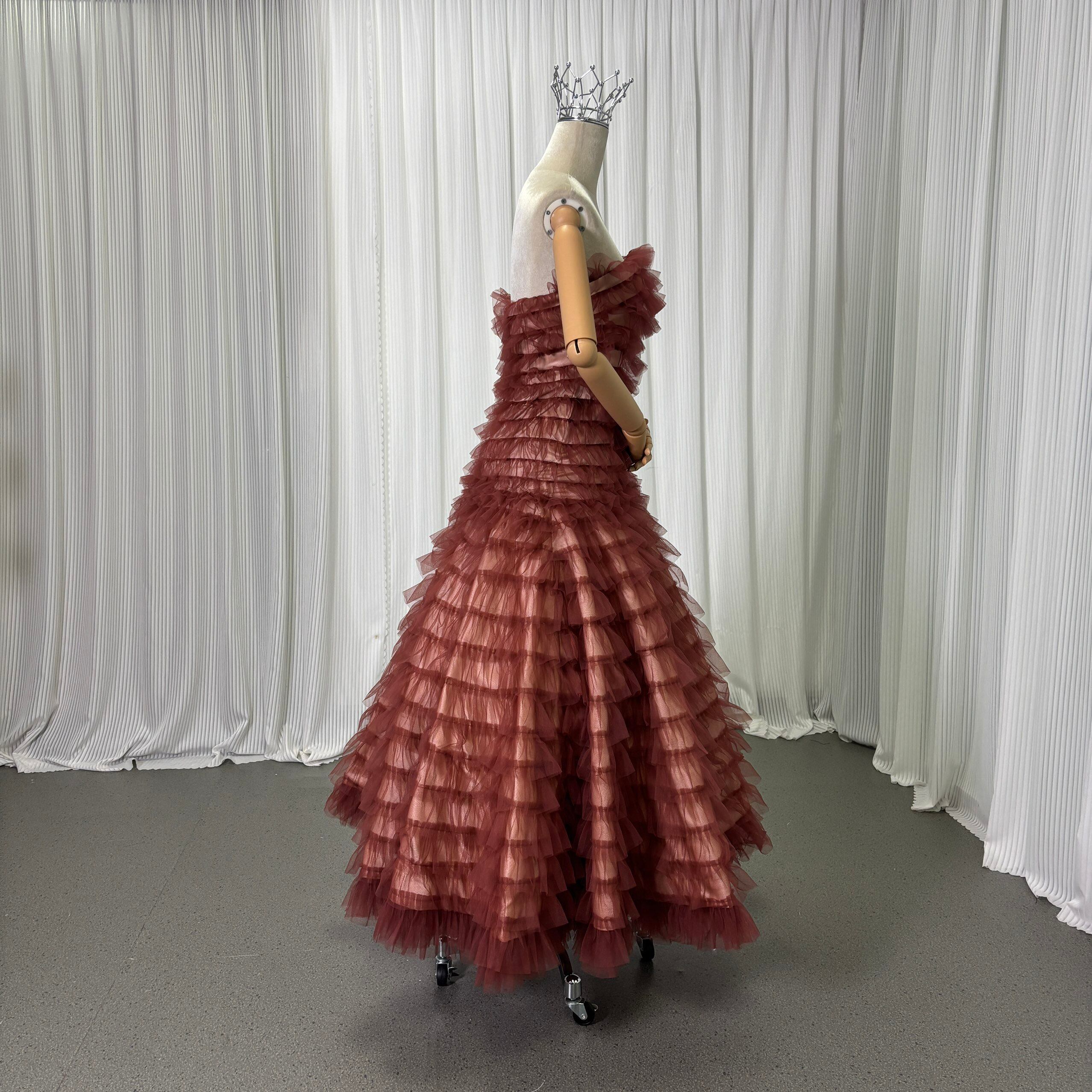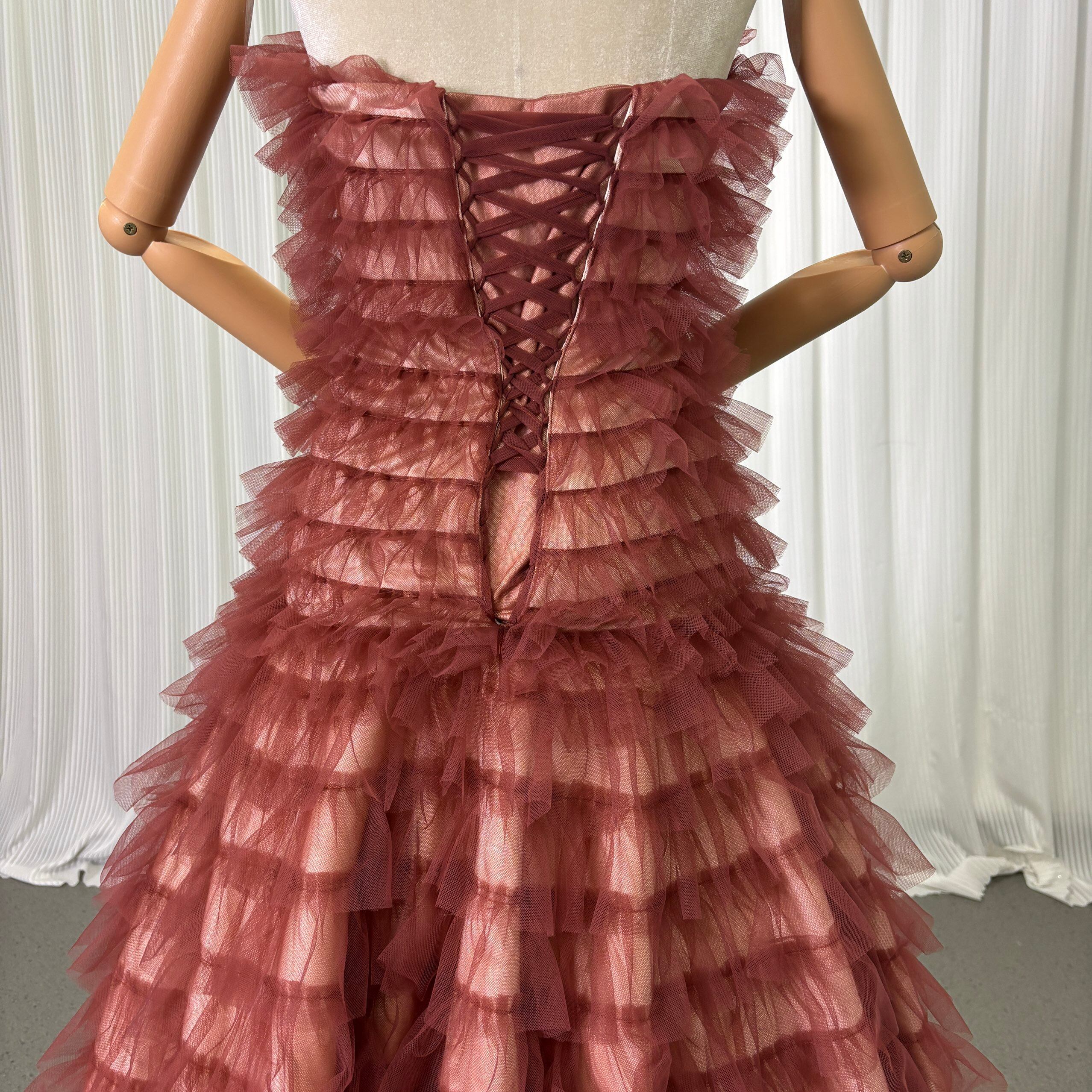 カラードレス ブラウン パーティードレス ベアトップ ソフトチュール 揺らめく裾 音楽会 編み上げ
