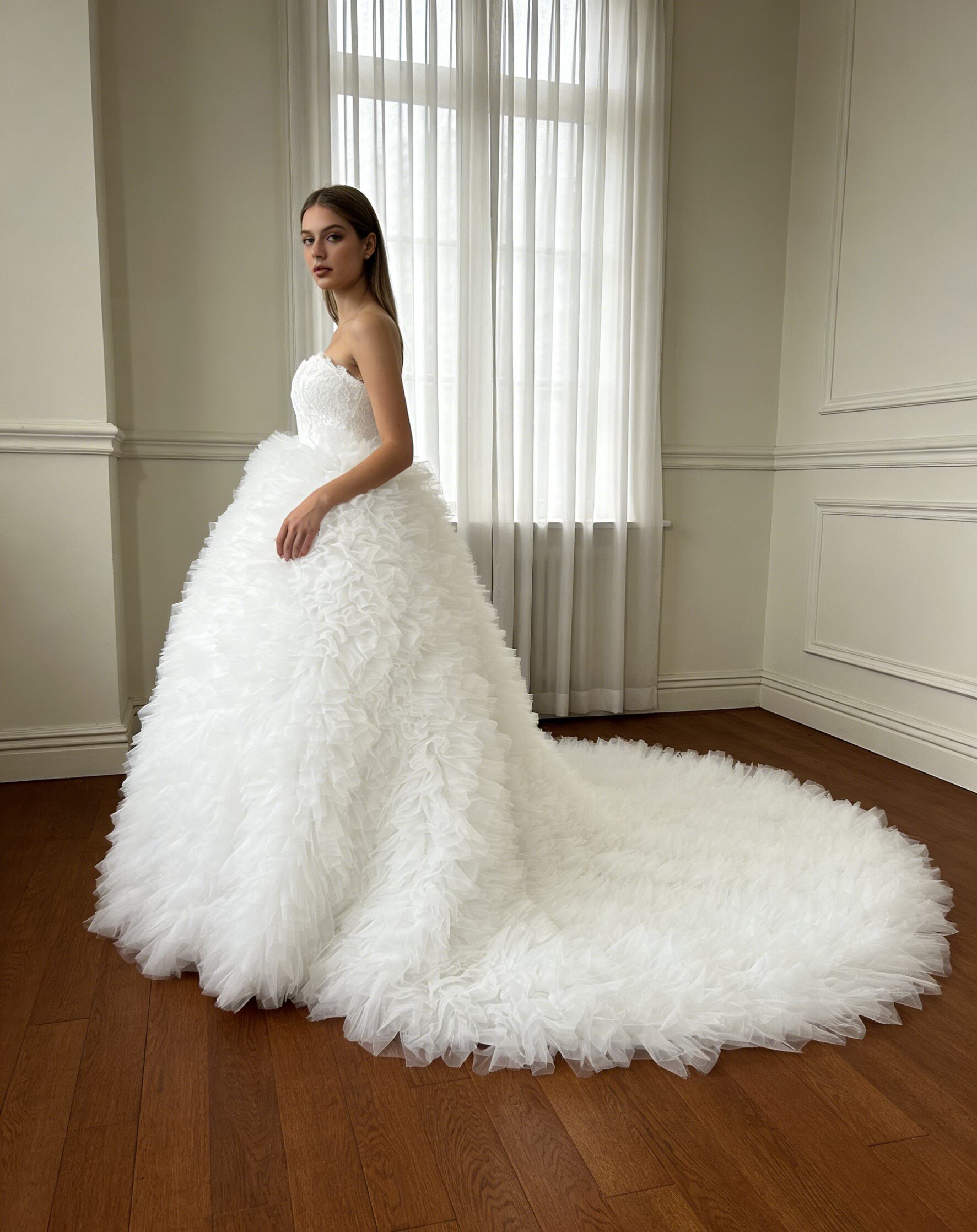豪華!ウェディングドレス ベアトップ 繊細レース ボリュームドレス 華やかなトレーン もこもこドレス 拳式