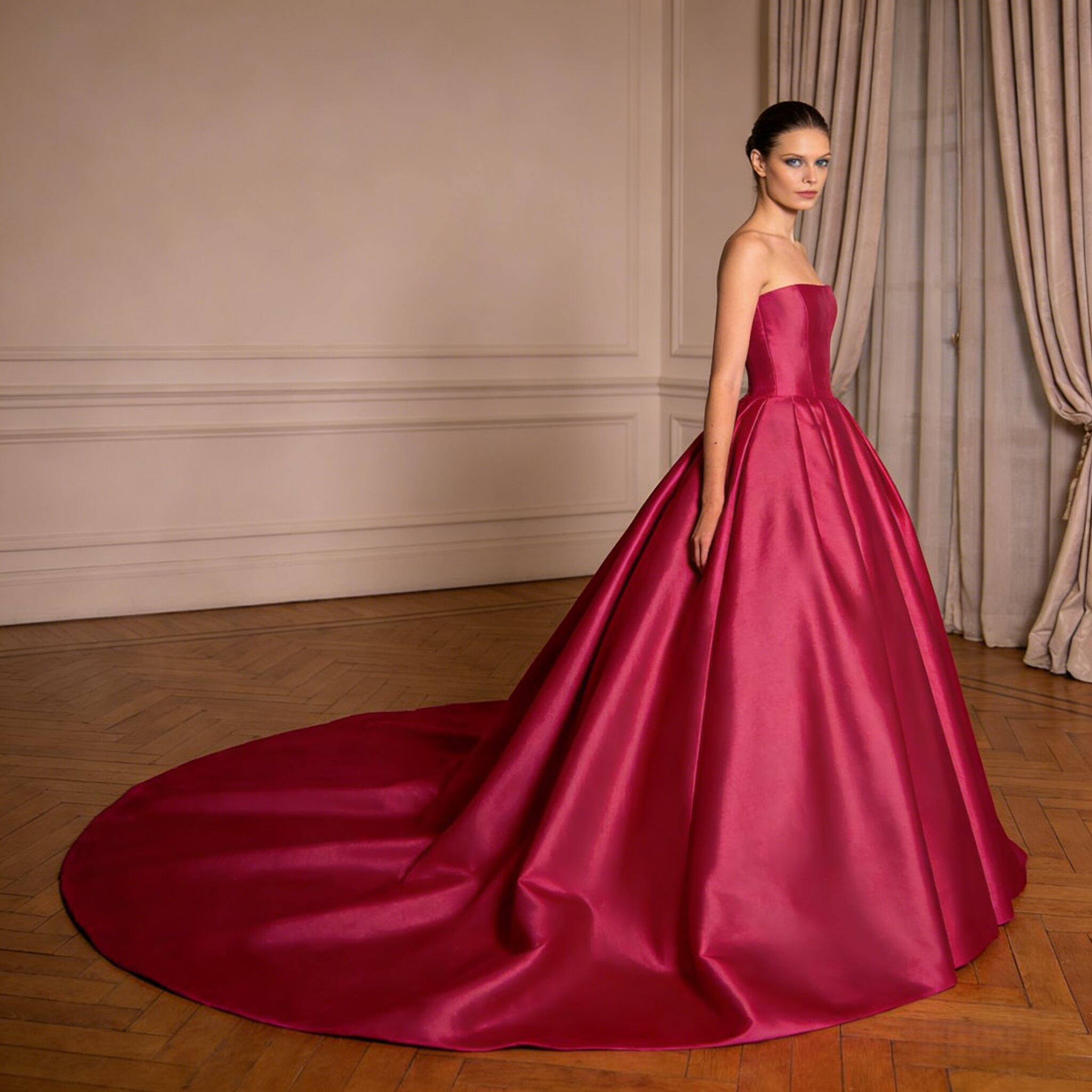 カラードレス ビビッドピンク ベアトップ 光沢サテン プリンセスライン ロングトレーン 披露宴
