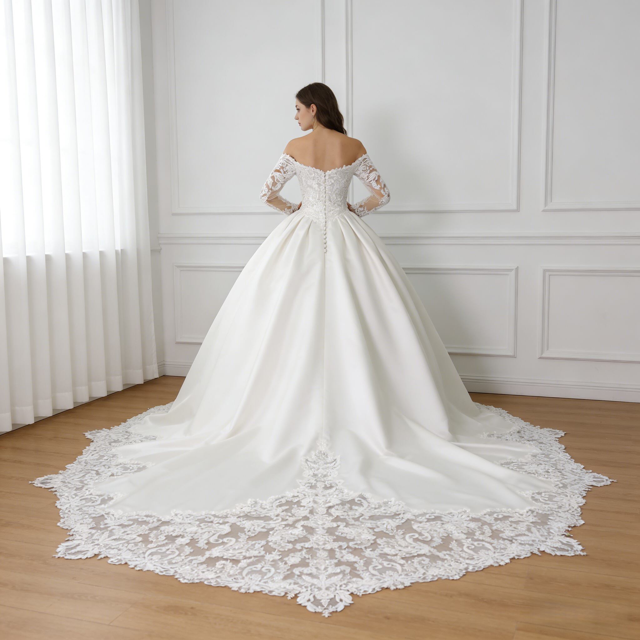 ウェディングドレス オフショルダー 上品レース 長袖 華やかなトレーン デザイン感 くるみボタン 結婚式 前撮り