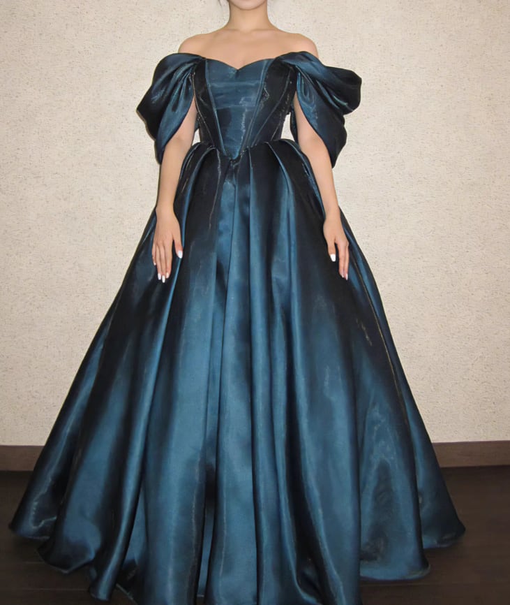 カラードレス ネイビー オフショルダー 光沢サテン フレアスカート 編み上げ クラシカル 披露宴