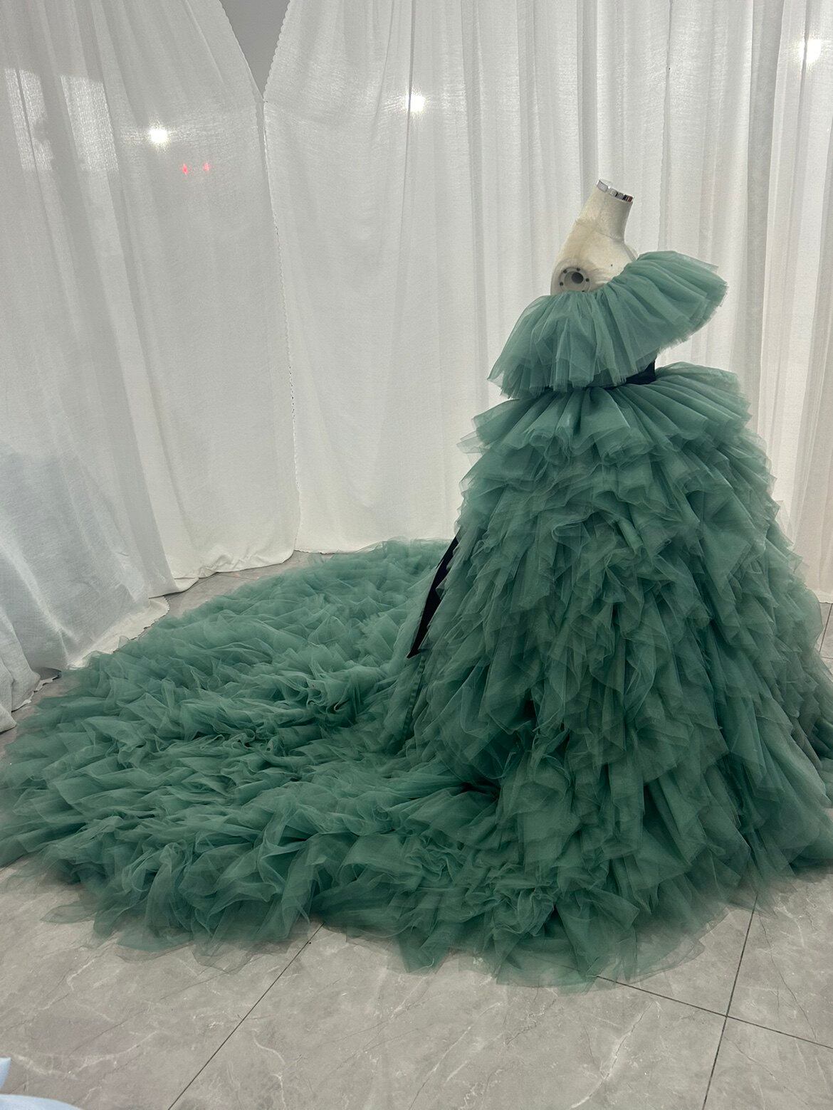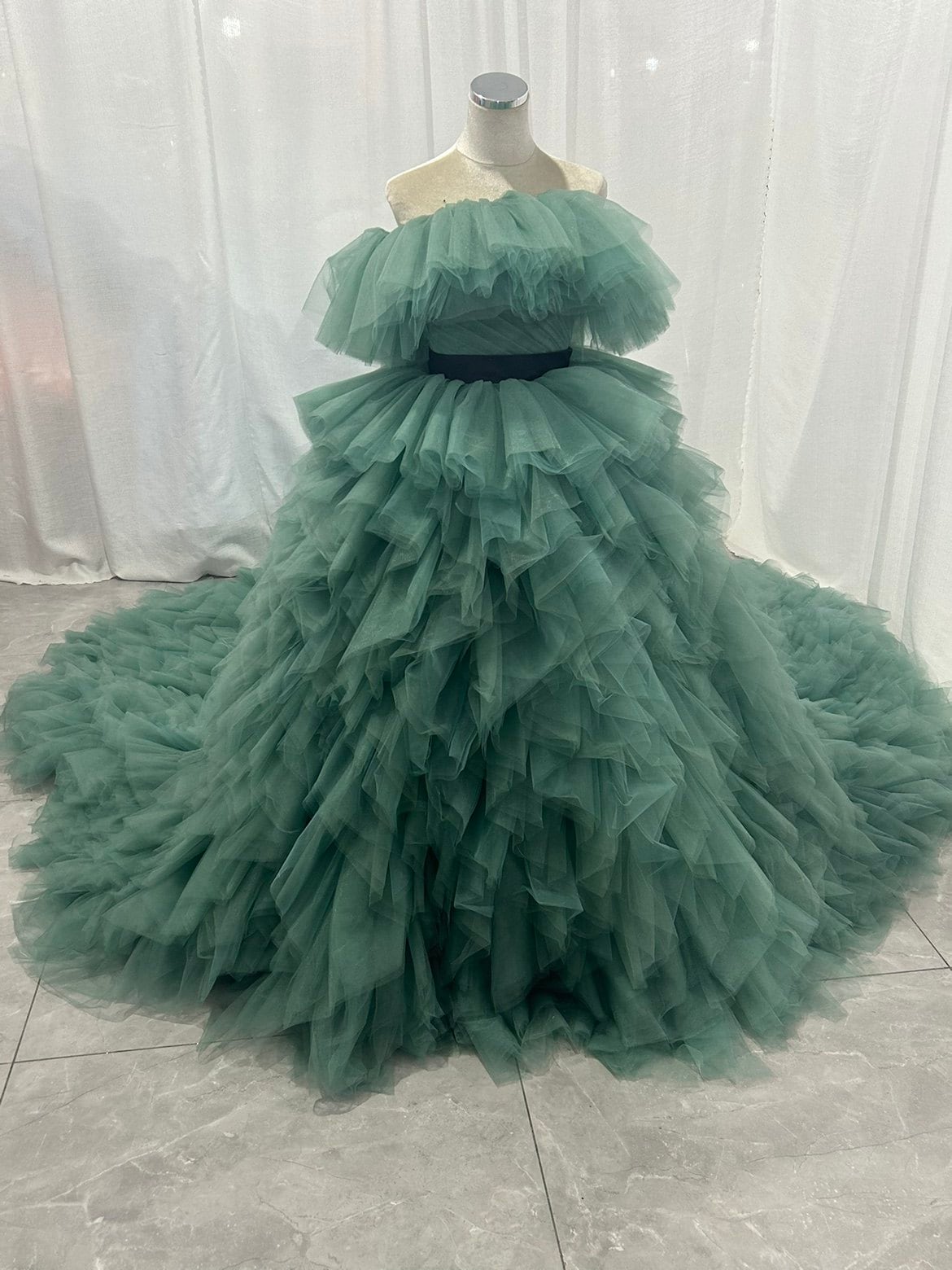 カラードレス グリーン 取り外しオフショルダー 柔らかく重ねたチュールスカート ボリュームドレス 前撮り