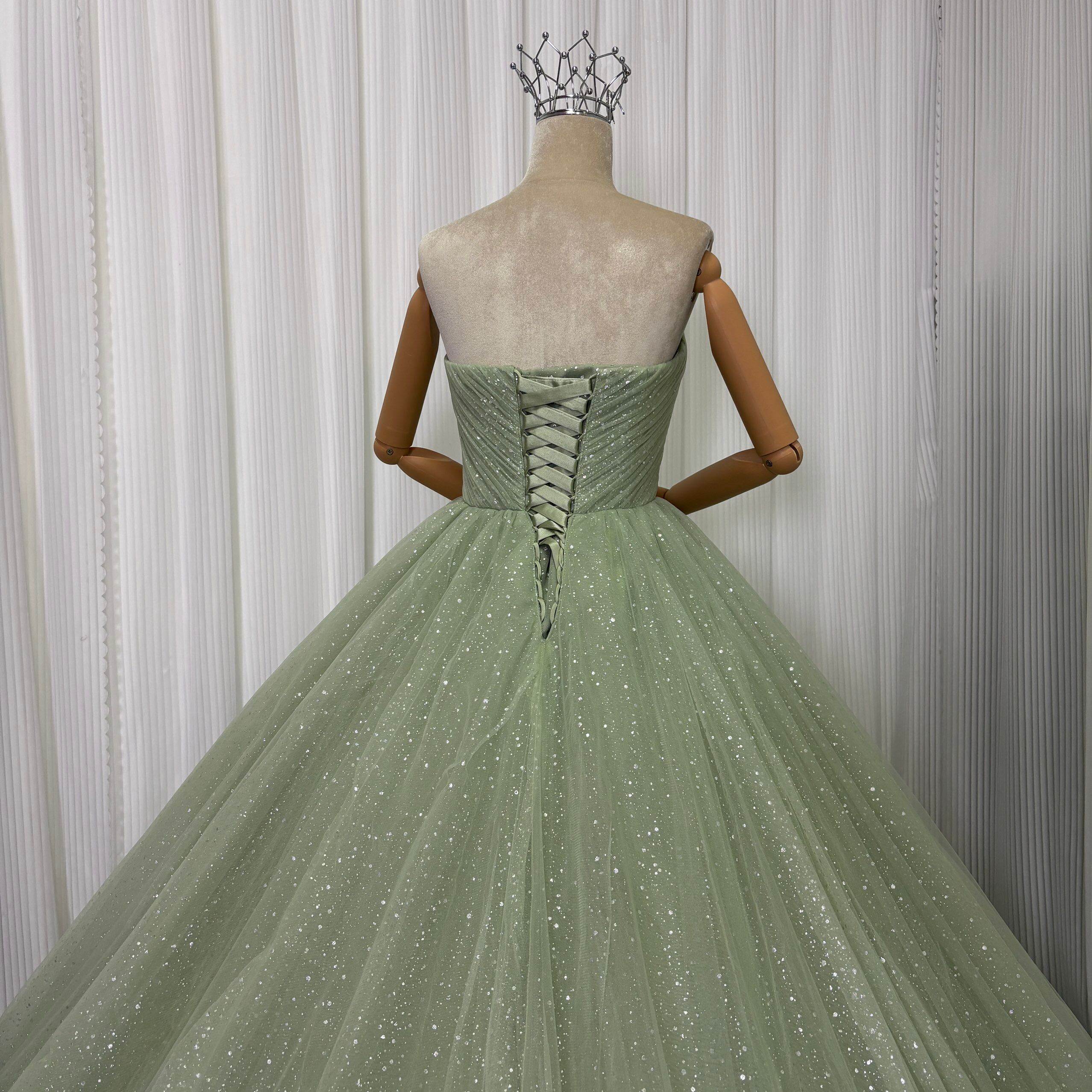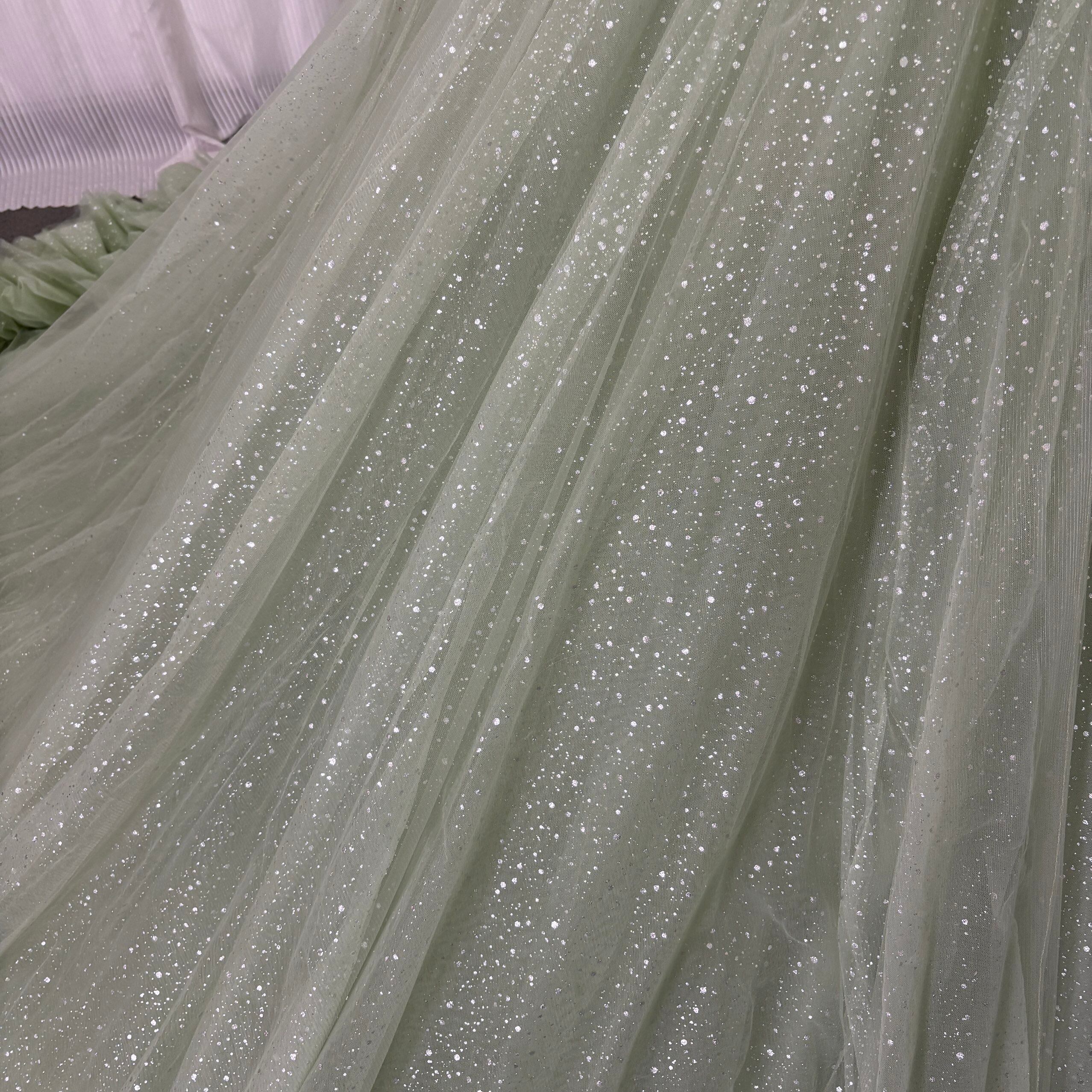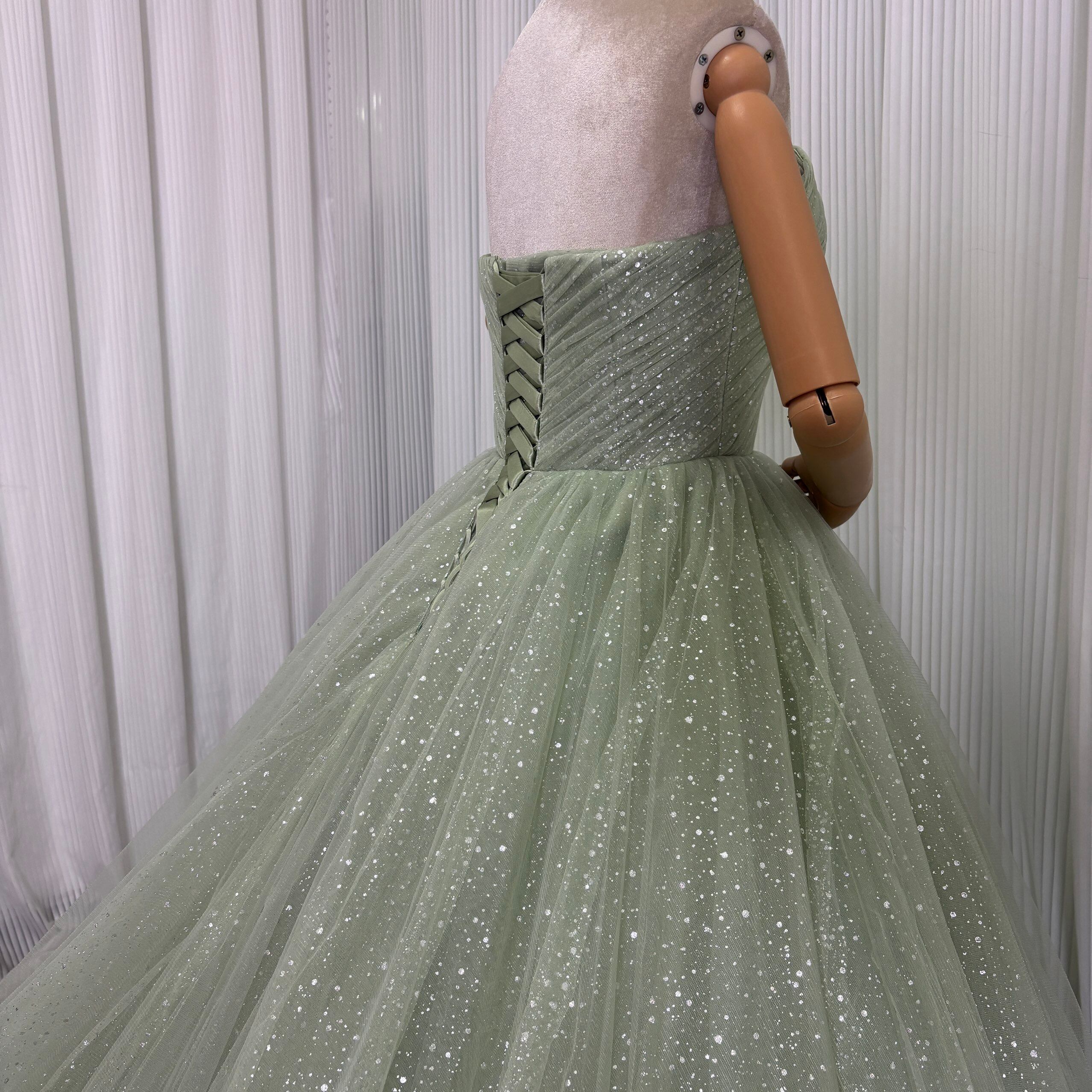 カラードレス ミントグリーン キラキラチュール ベアトップ フレアスカート ラッフルフリル 編み上げ 花嫁